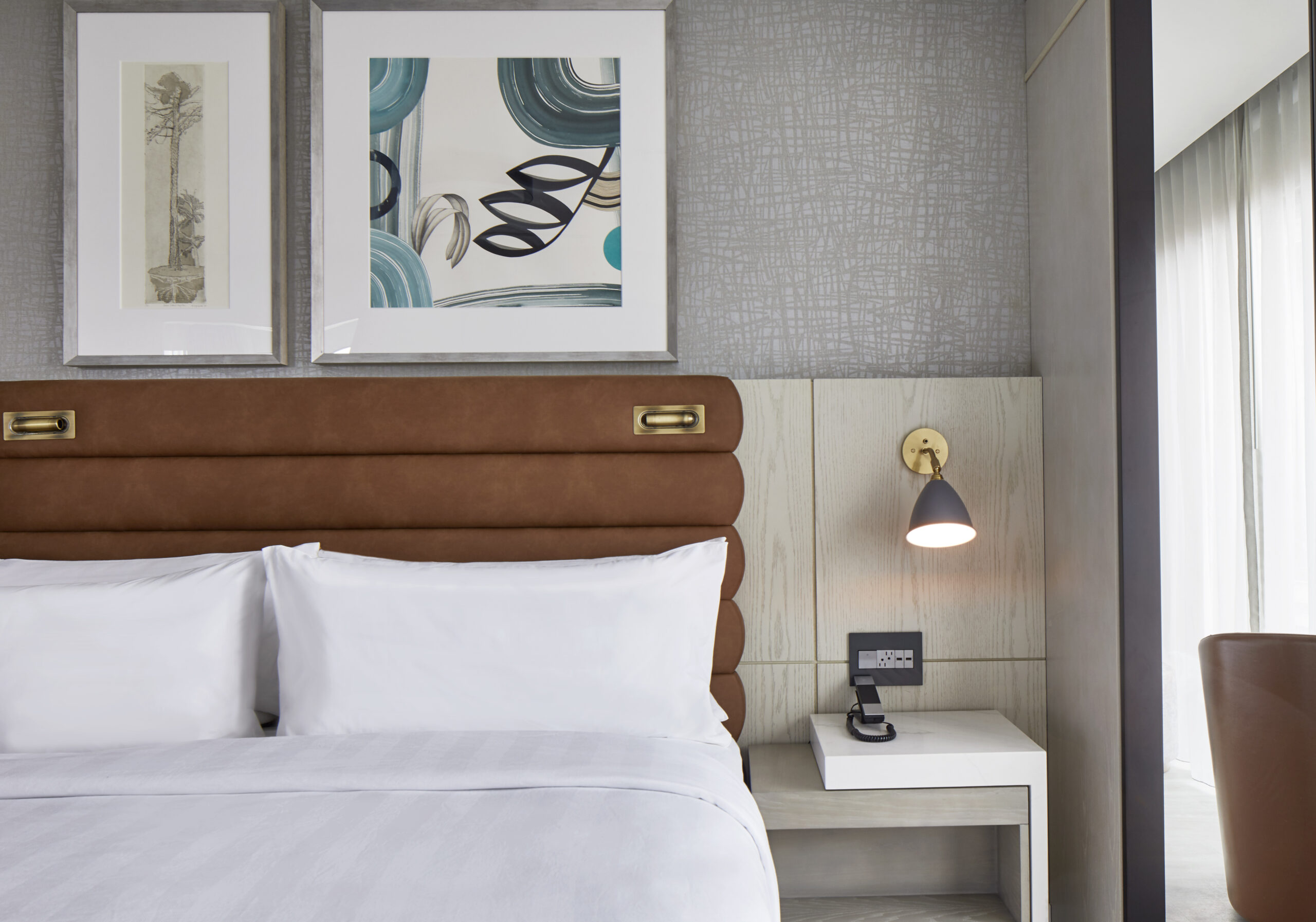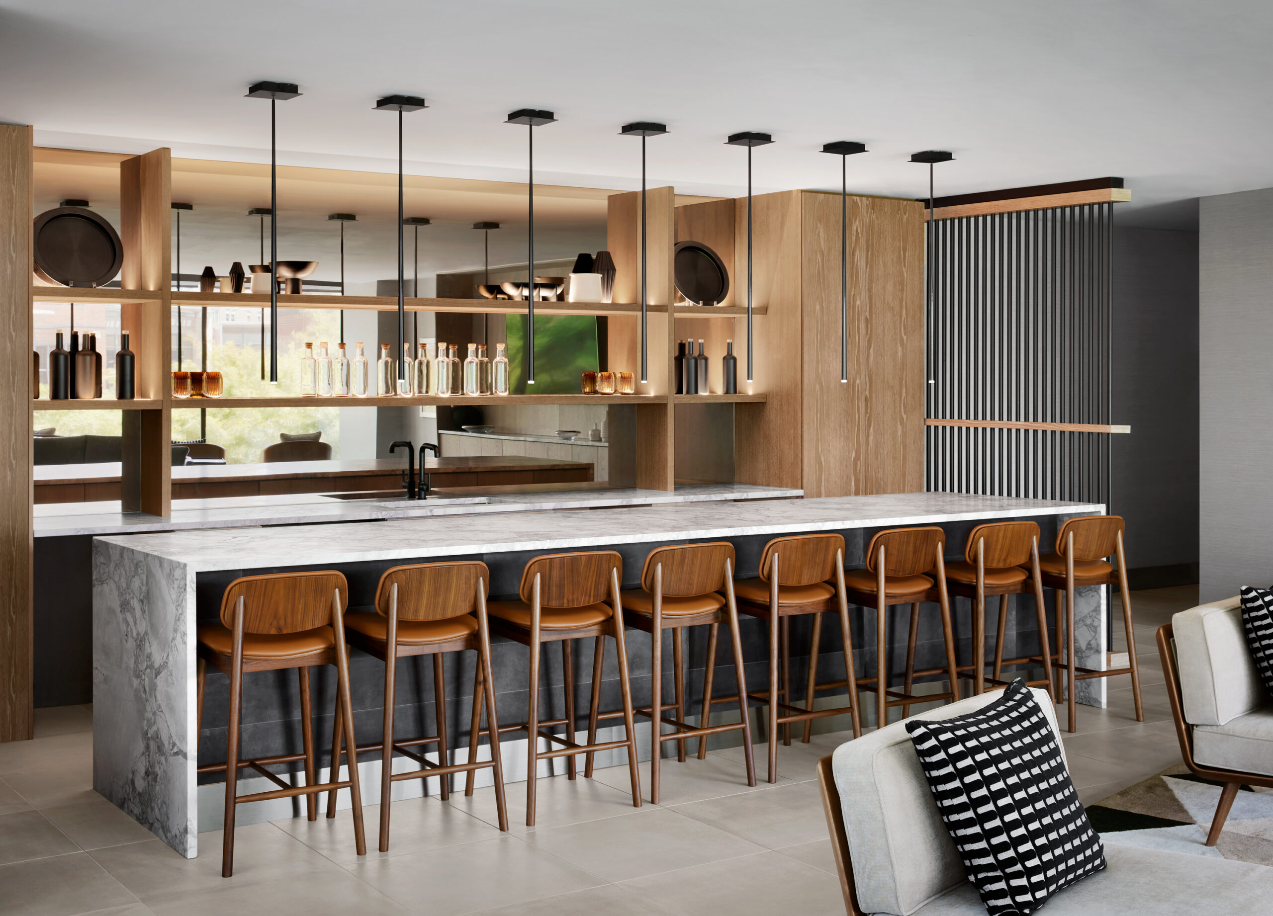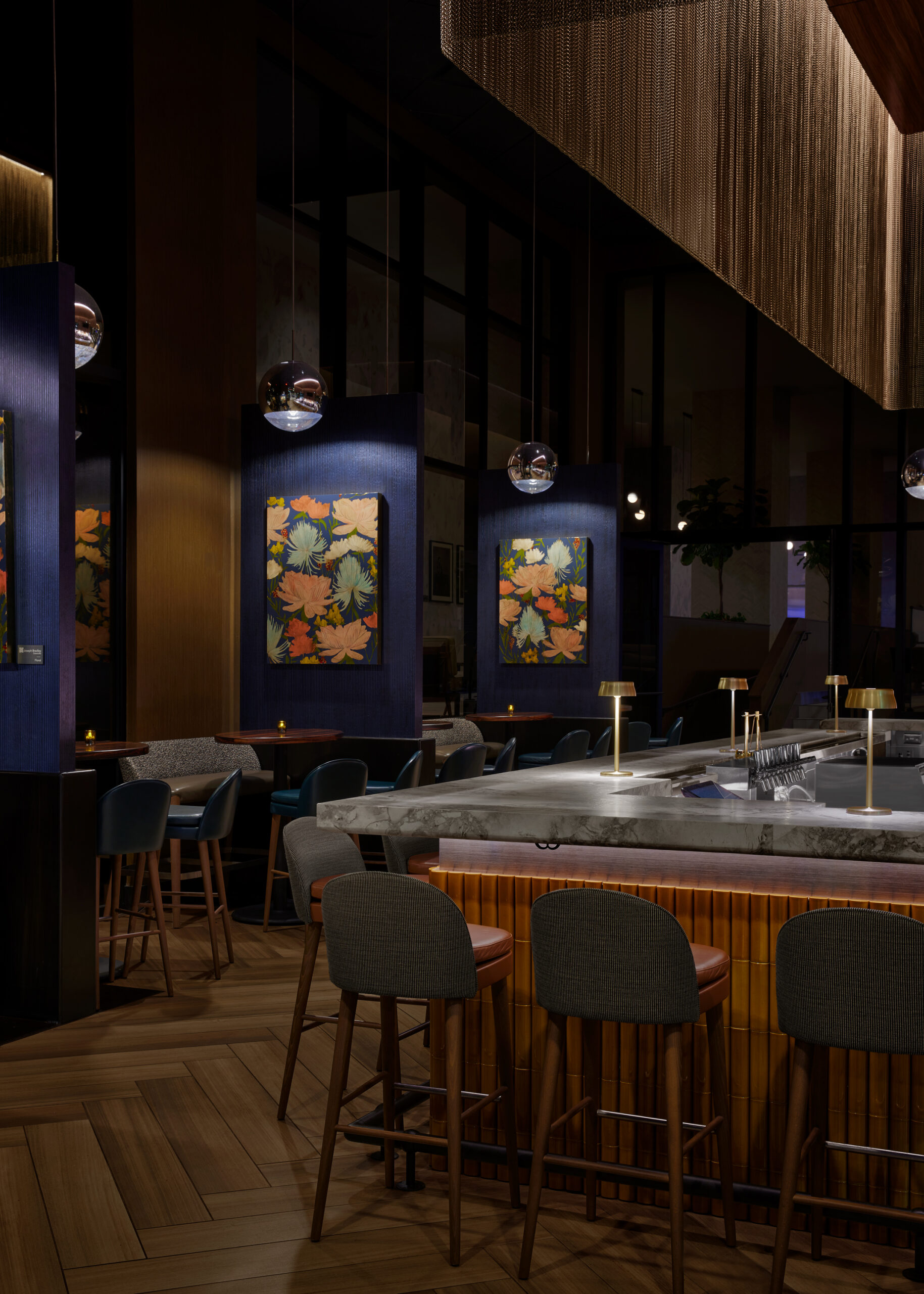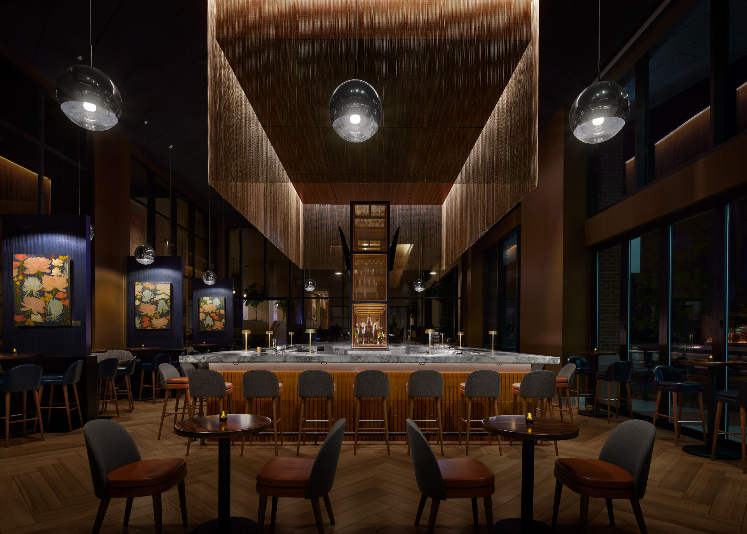 Constructed on the former headquarters of the Greenville News, the AC Hotel Greenville’s design draws from the site’s history, as well as the energy of the art and theater-district neighborhood, the surrounding nature, and the textile mills of the area. The overarching theme of the interiors references a European modern print-house in homage to the Greenville News. In the public spaces, a use of stone references the area’s mountainous backdrop of the Blue Ridge Mountains while a palette of ink blue, black, and white ties to the site’s former printing press. Alternatively, the bar takes on a more theatrical flair in reference to the neighboring Peace Center, a local performing arts venue located across the street from the hotel. Awash in warm hues, copper tones, and mixed metals, the bar’s standout is a decorative drape of metal mesh material that brings a sense of human scale to the space, which boasts 19-foot-tall ceilings.