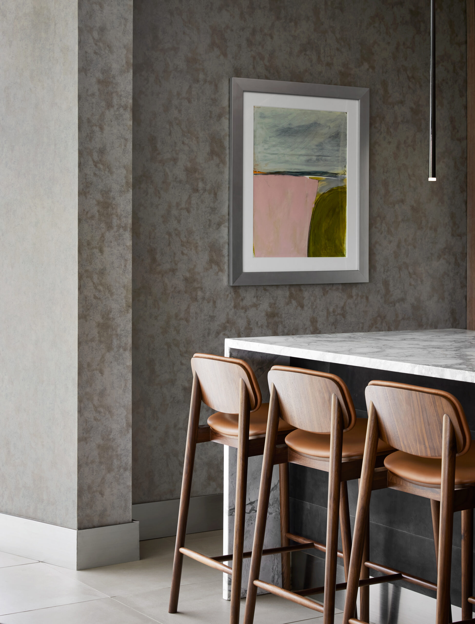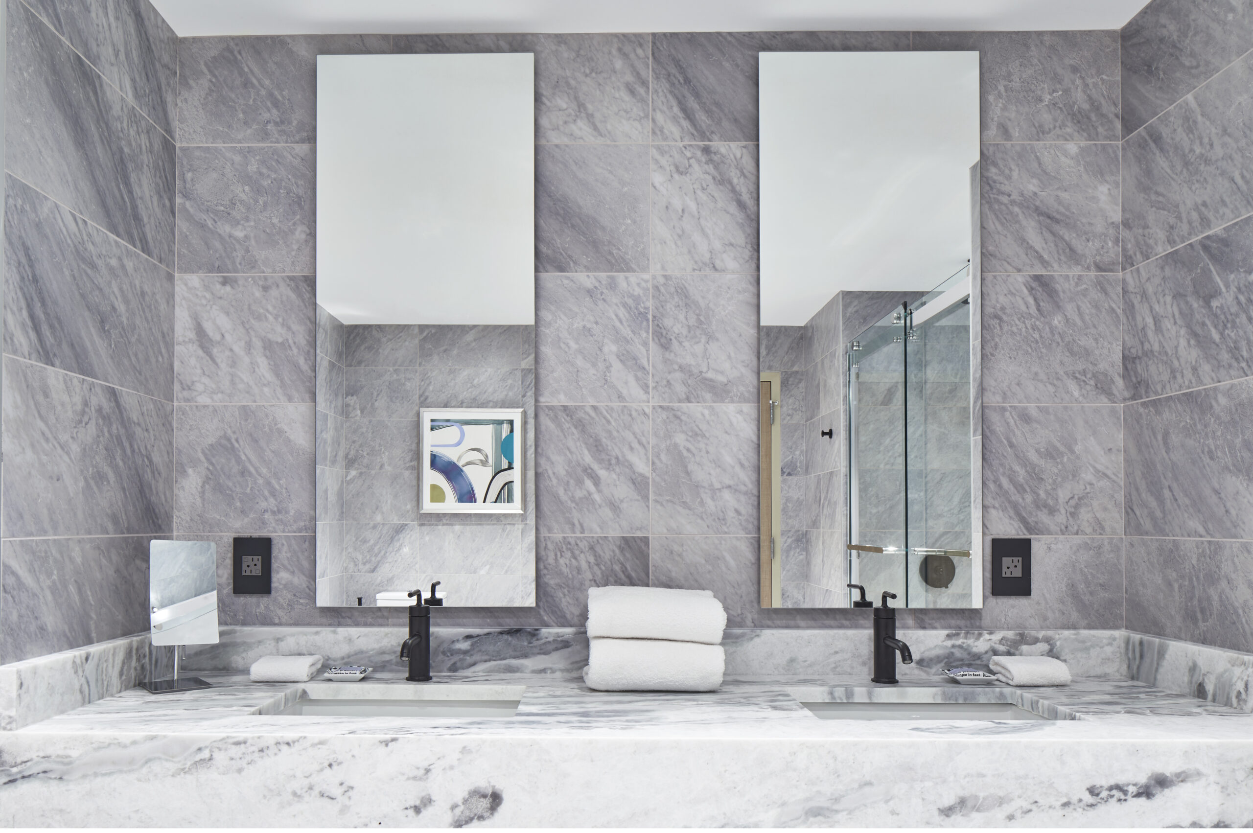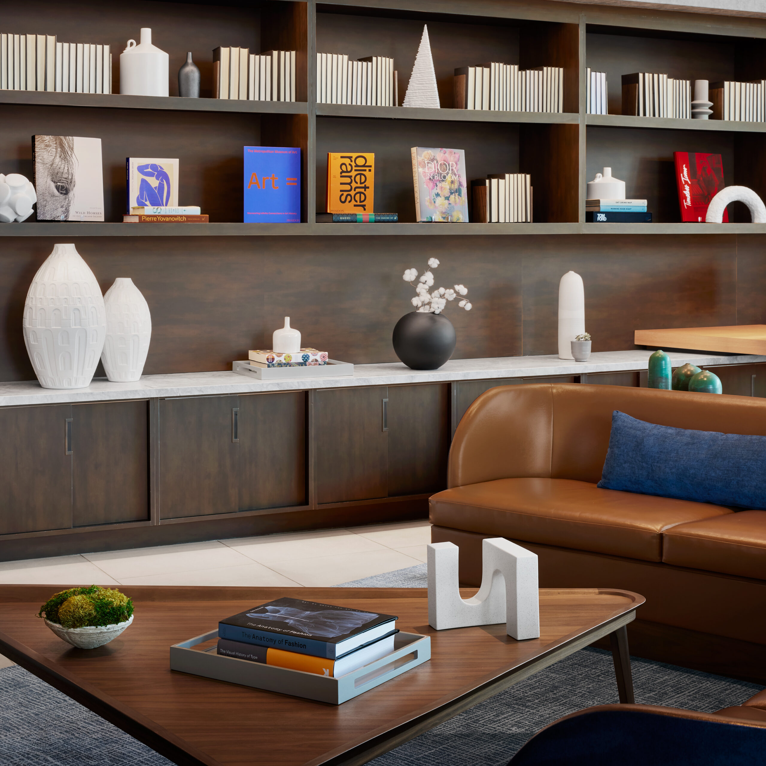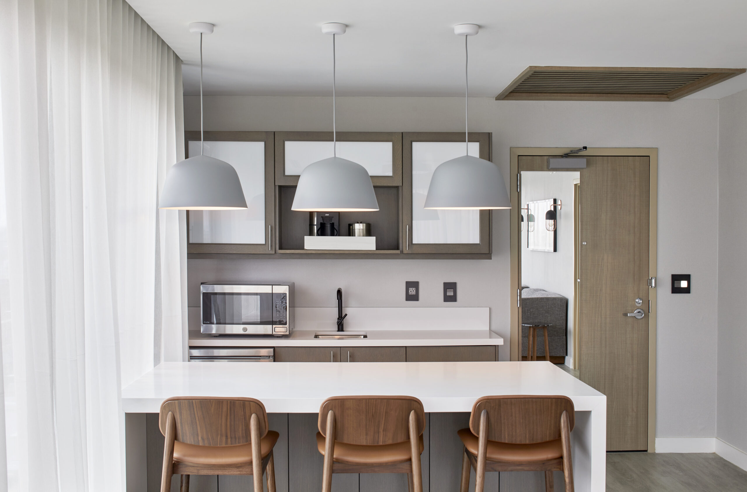 Constructed on the former headquarters of the Greenville News, the AC Hotel Greenville’s design draws from the site’s history, as well as the energy of the art and theater-district neighborhood, the surrounding nature, and the textile mills of the area. The overarching theme of the interiors references a European modern print-house in homage to the Greenville News. In the public spaces, a use of stone references the area’s mountainous backdrop of the Blue Ridge Mountains while a palette of ink blue, black, and white ties to the site’s former printing press. Alternatively, the bar takes on a more theatrical flair in reference to the neighboring Peace Center, a local performing arts venue located across the street from the hotel. Awash in warm hues, copper tones, and mixed metals, the bar’s standout is a decorative drape of metal mesh material that brings a sense of human scale to the space, which boasts 19-foot-tall ceilings.