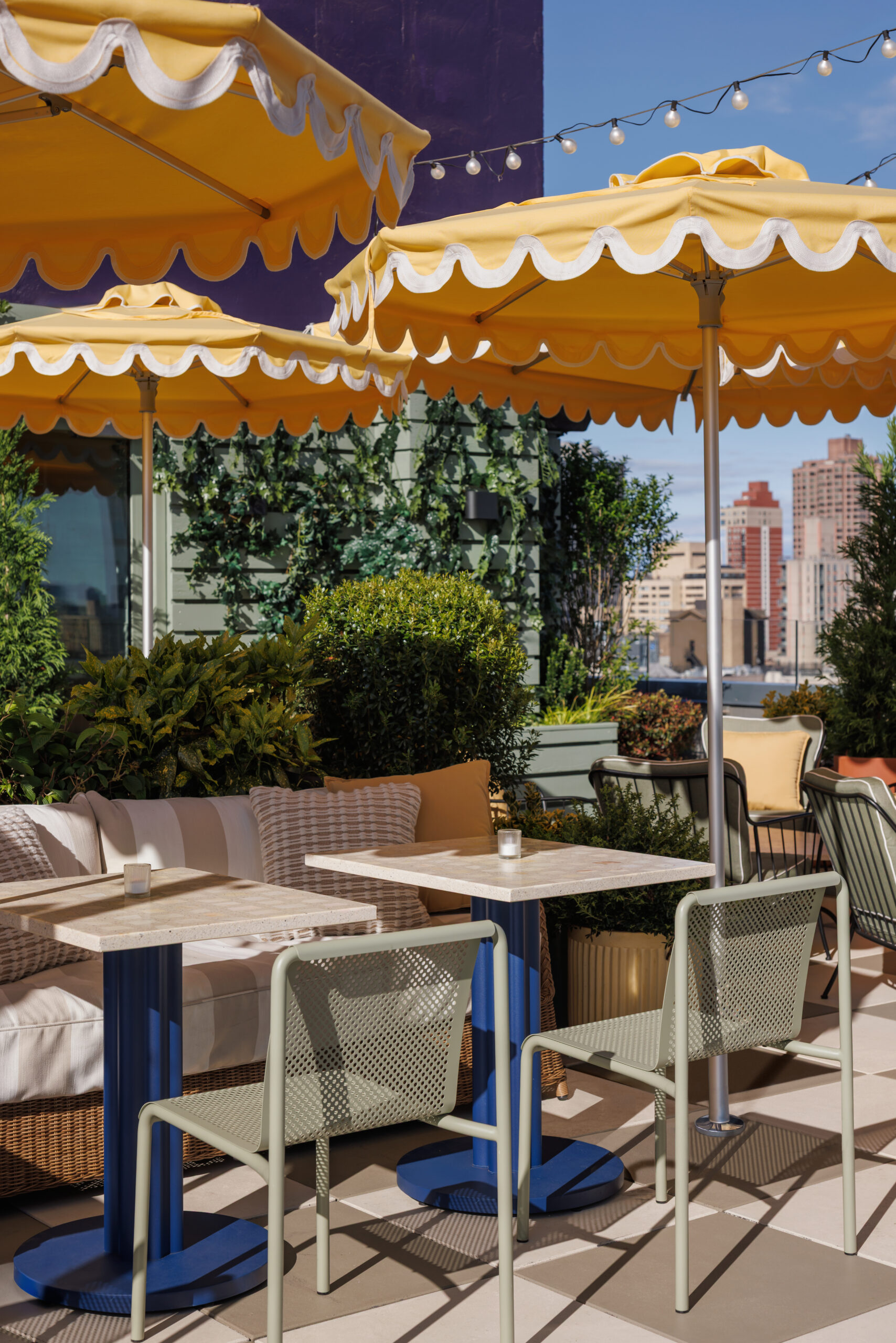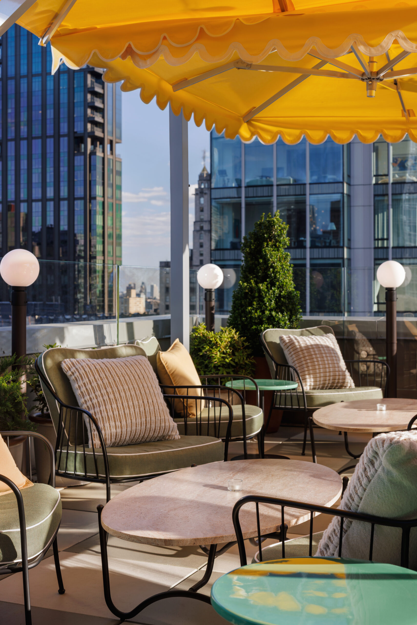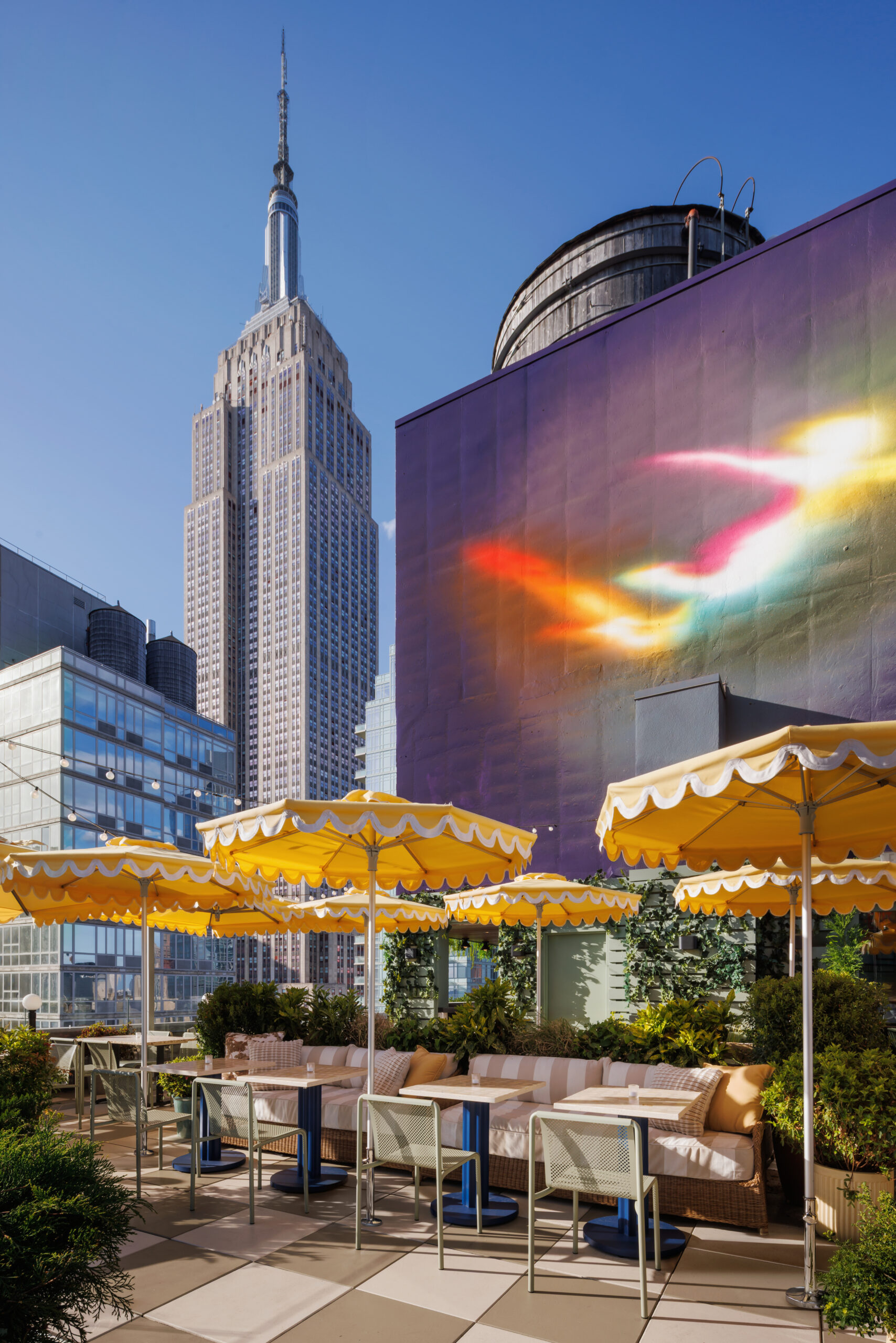 Stonehill Taylor transformed the rooftop of the Arlo NoMad Hotel into a vibrant, laid-back space, blending European café culture with New York’s energy. The design features intimate seating areas with lush greenery, sculptural furnishings, and custom lighting, creating a warm and inviting atmosphere. A hand-painted mural by a local artist adds character, reinforcing the eclectic vibe of the neighborhood. The rooftop feels immersive and distinctly Arlo, perfect for relaxed conversations and cocktails.