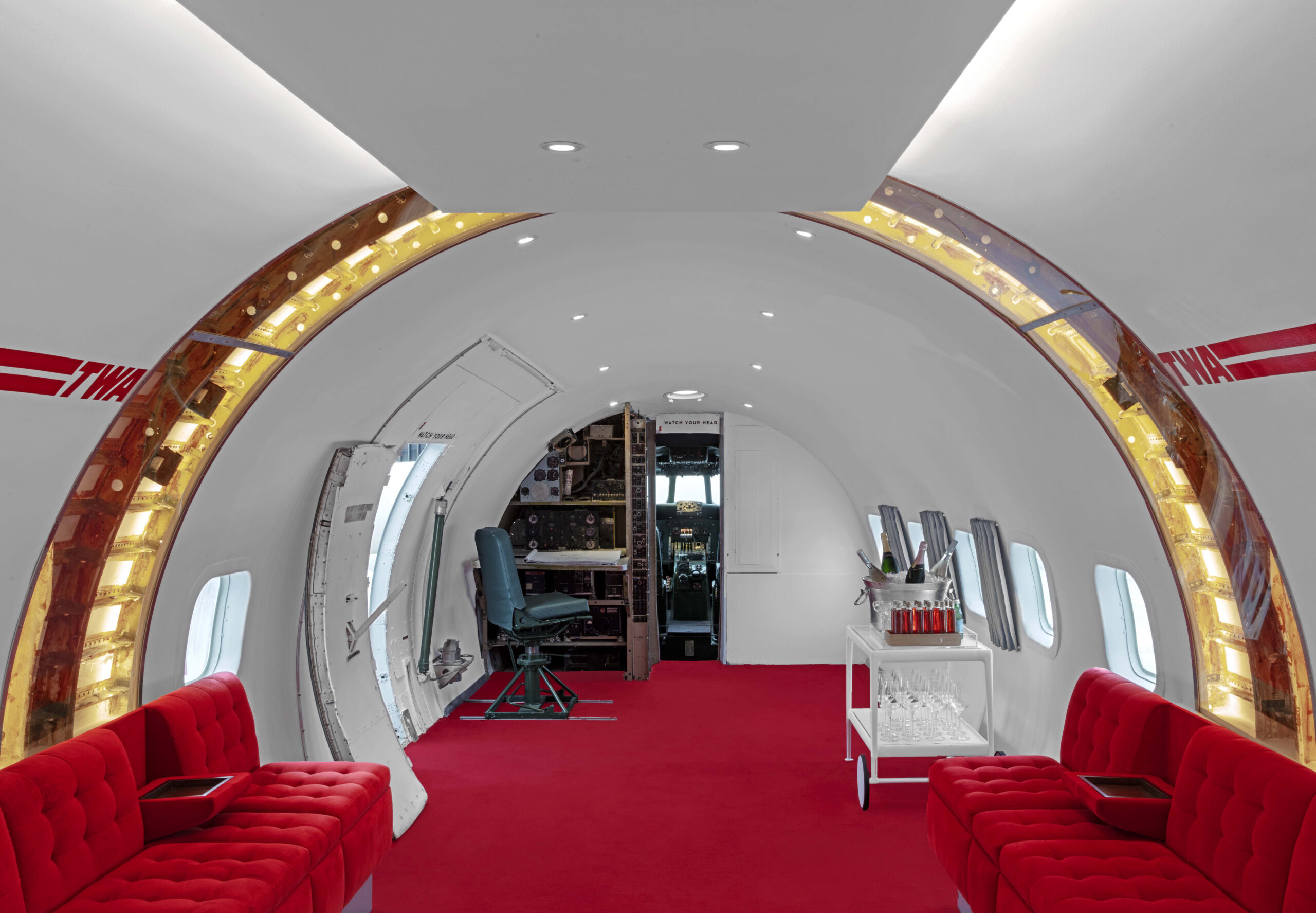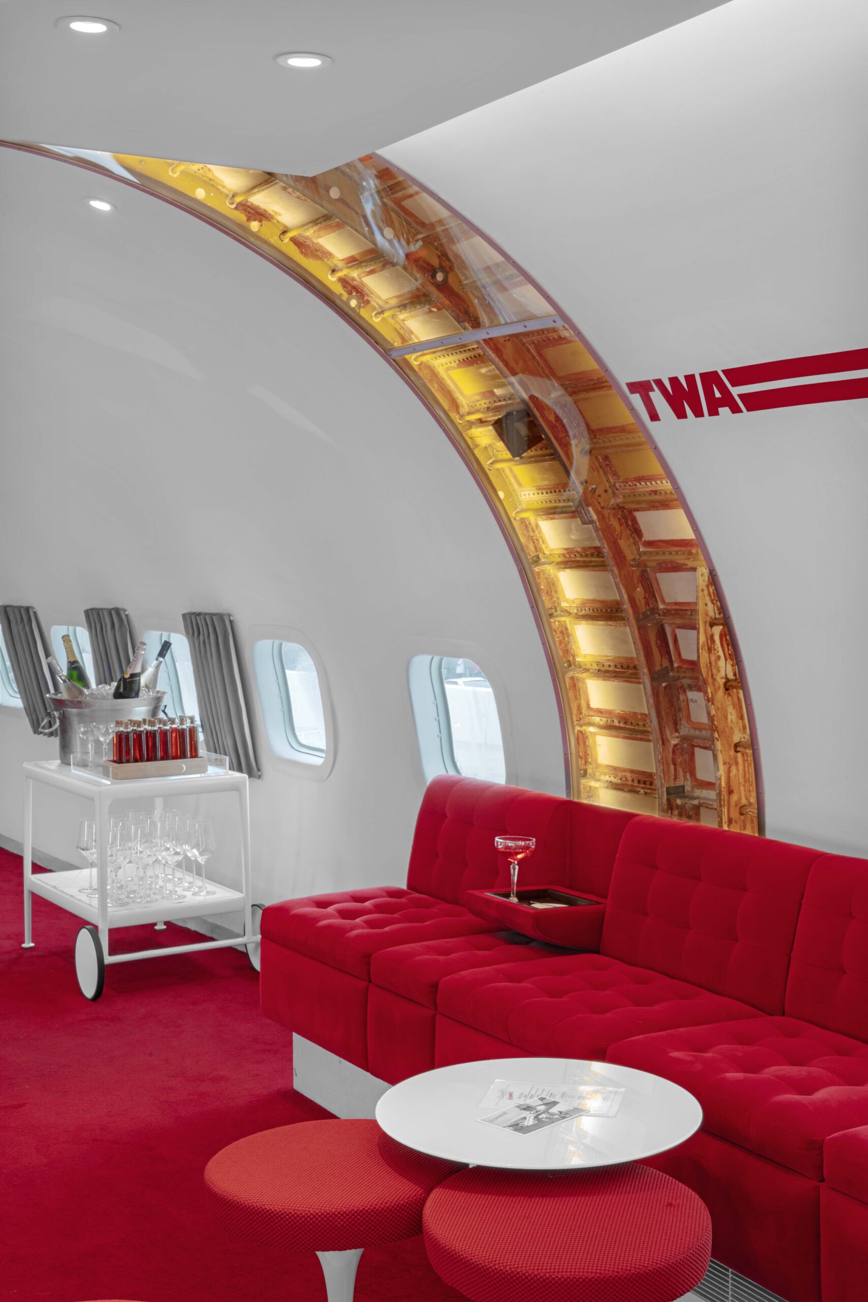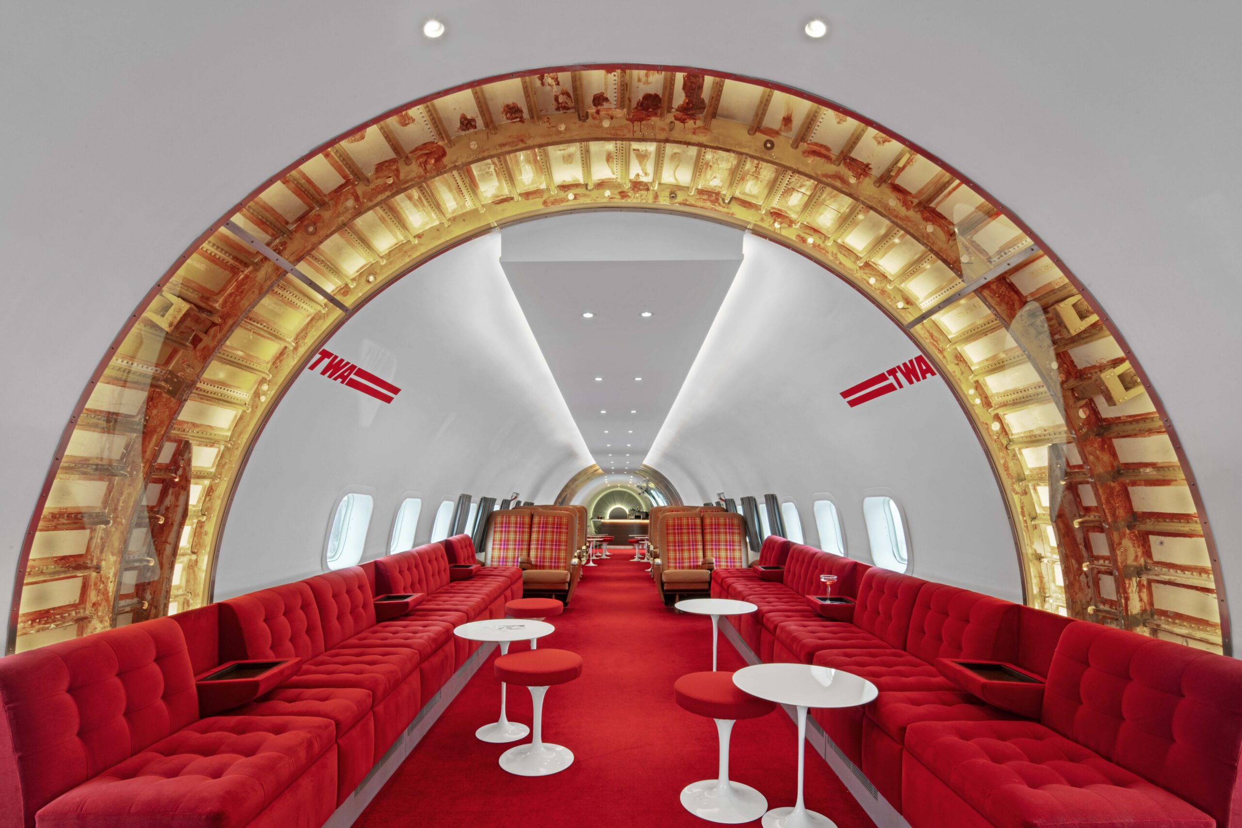After ascending through the forward hatch of the116-foot-long aircraft, guests enter the main cabin, which echoes the TWA Flight Center’s terminal “tube” design. Seating vignettes nod to the original TWA Commodore Club with Chili Pepper Red banquettes complete with fold-down drink holders and Saarinen tulip tables and stools. Guests can also sit in one of the 16 reupholstered original airplane seats. At the back of the plane sits the back bar, whose rivet-lined brushed-steel background was inspired by both the plane’s fuselage and Saarinen’s Gateway Arch elevators in St. Louis.
