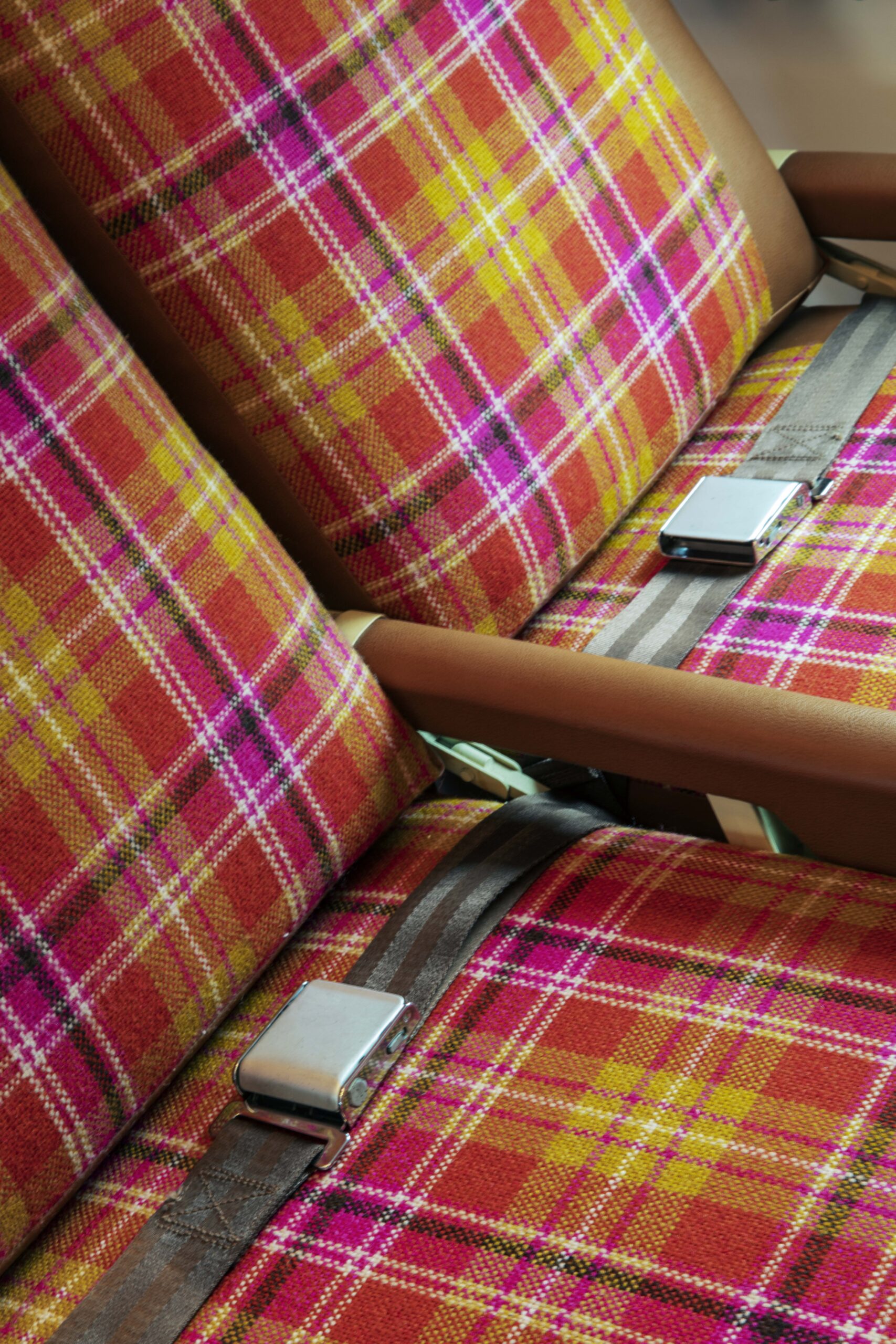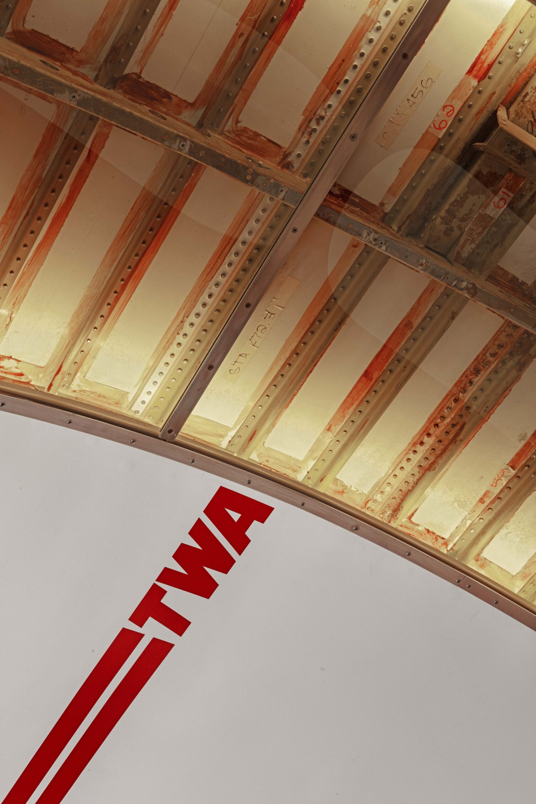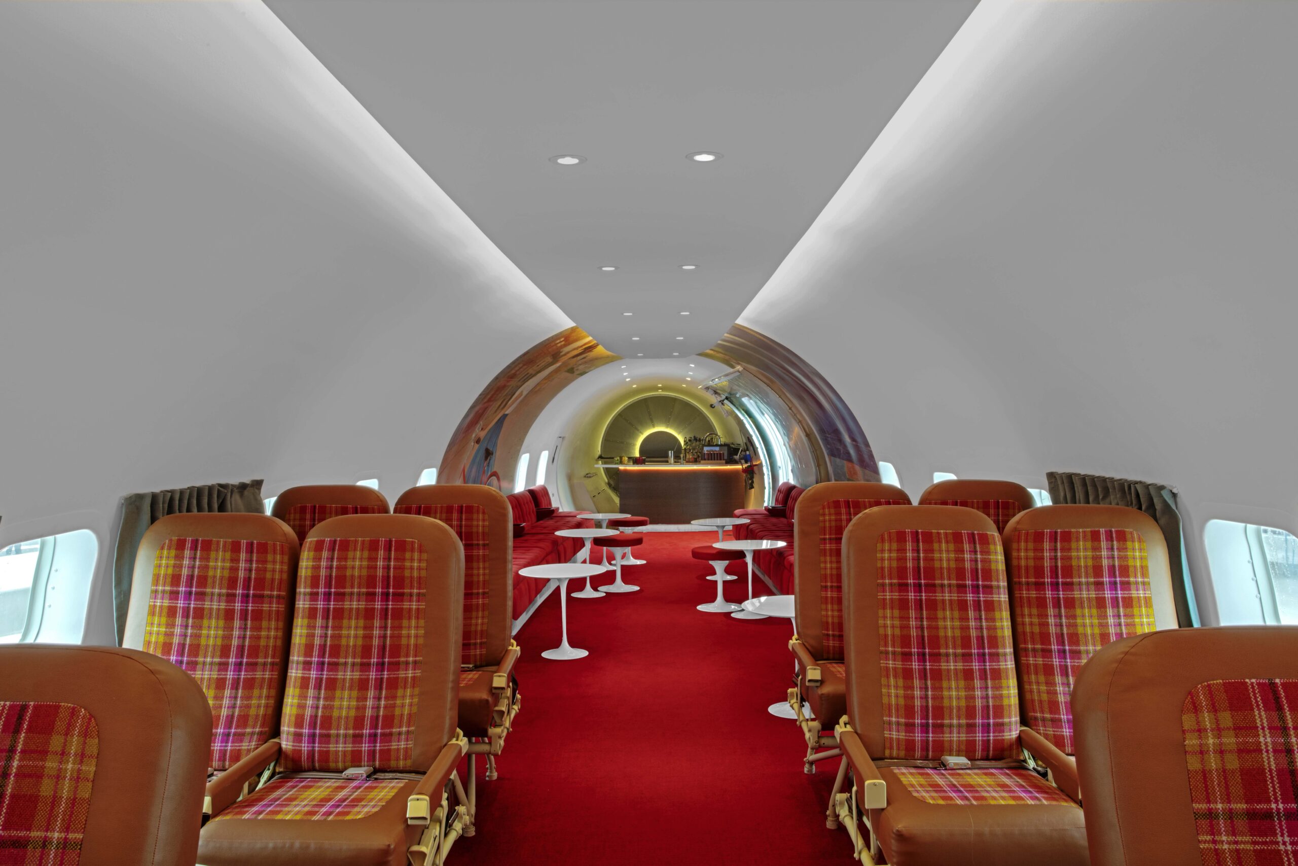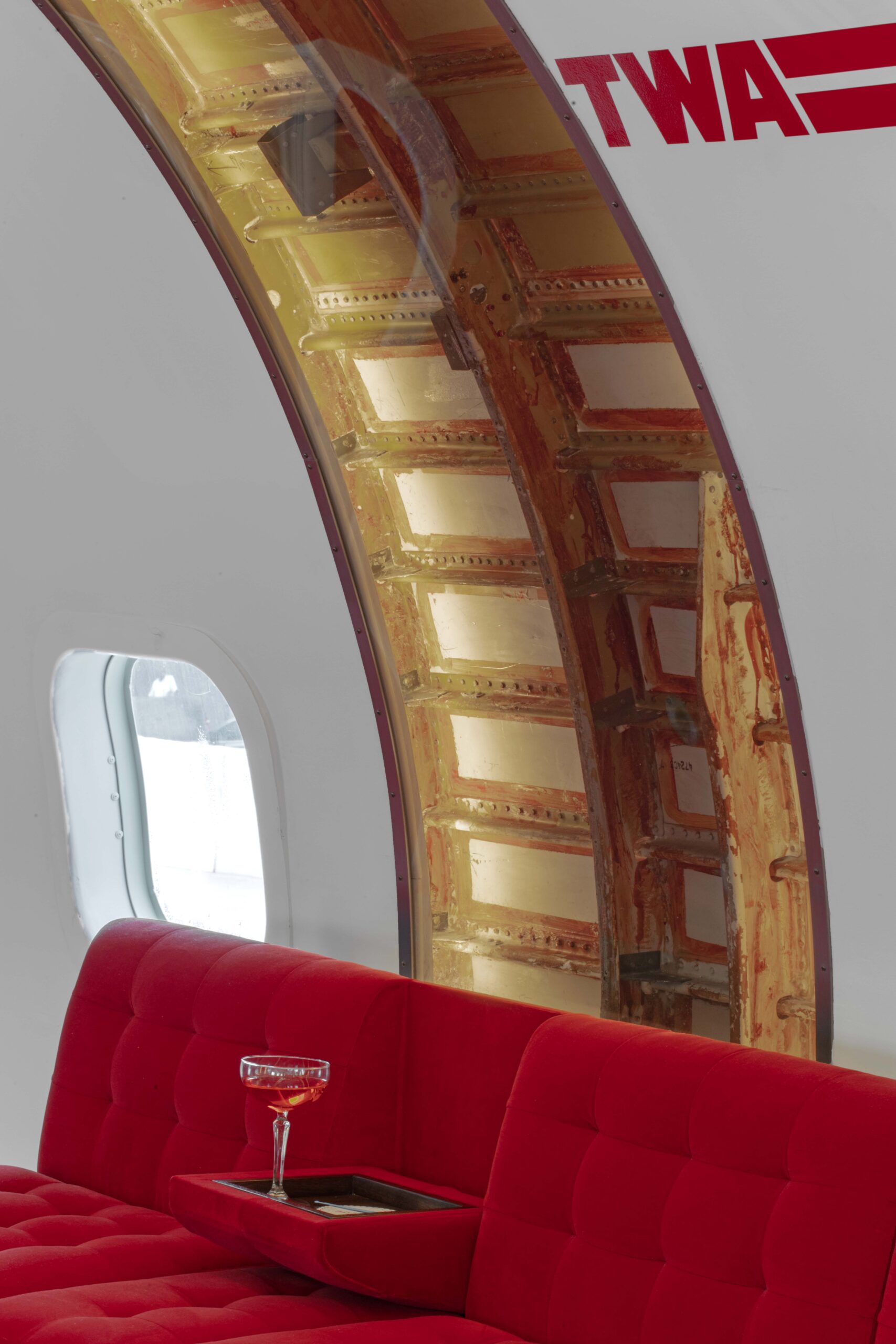 After ascending through the forward hatch of the116-foot-long aircraft, guests enter the main cabin, which echoes the TWA Flight Center’s terminal “tube” design. Seating vignettes nod to the original TWA Commodore Club with Chili Pepper Red banquettes complete with fold-down drink holders and Saarinen tulip tables and stools. Guests can also sit in one of the 16 reupholstered original airplane seats. At the back of the plane sits the back bar, whose rivet-lined brushed-steel background was inspired by both the plane’s fuselage and Saarinen’s Gateway Arch elevators in St. Louis.