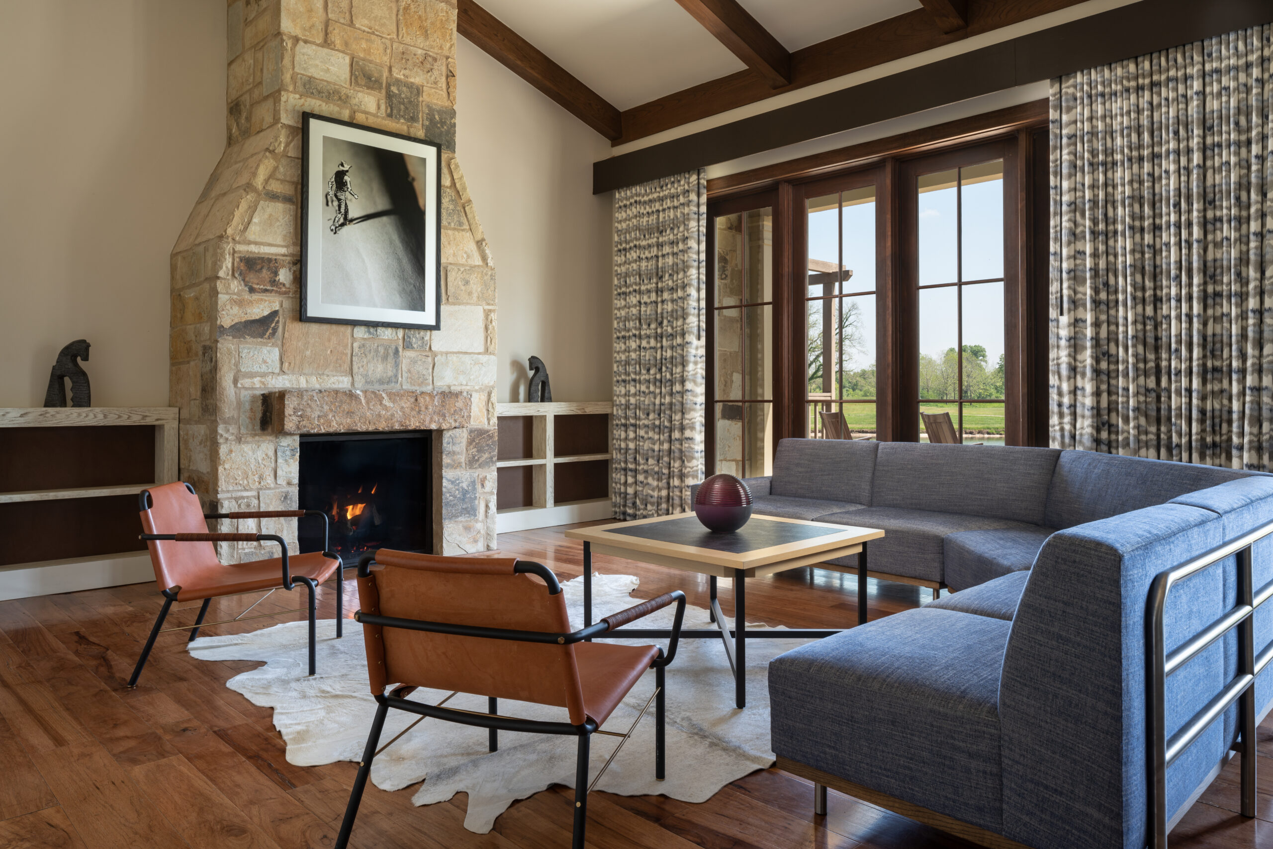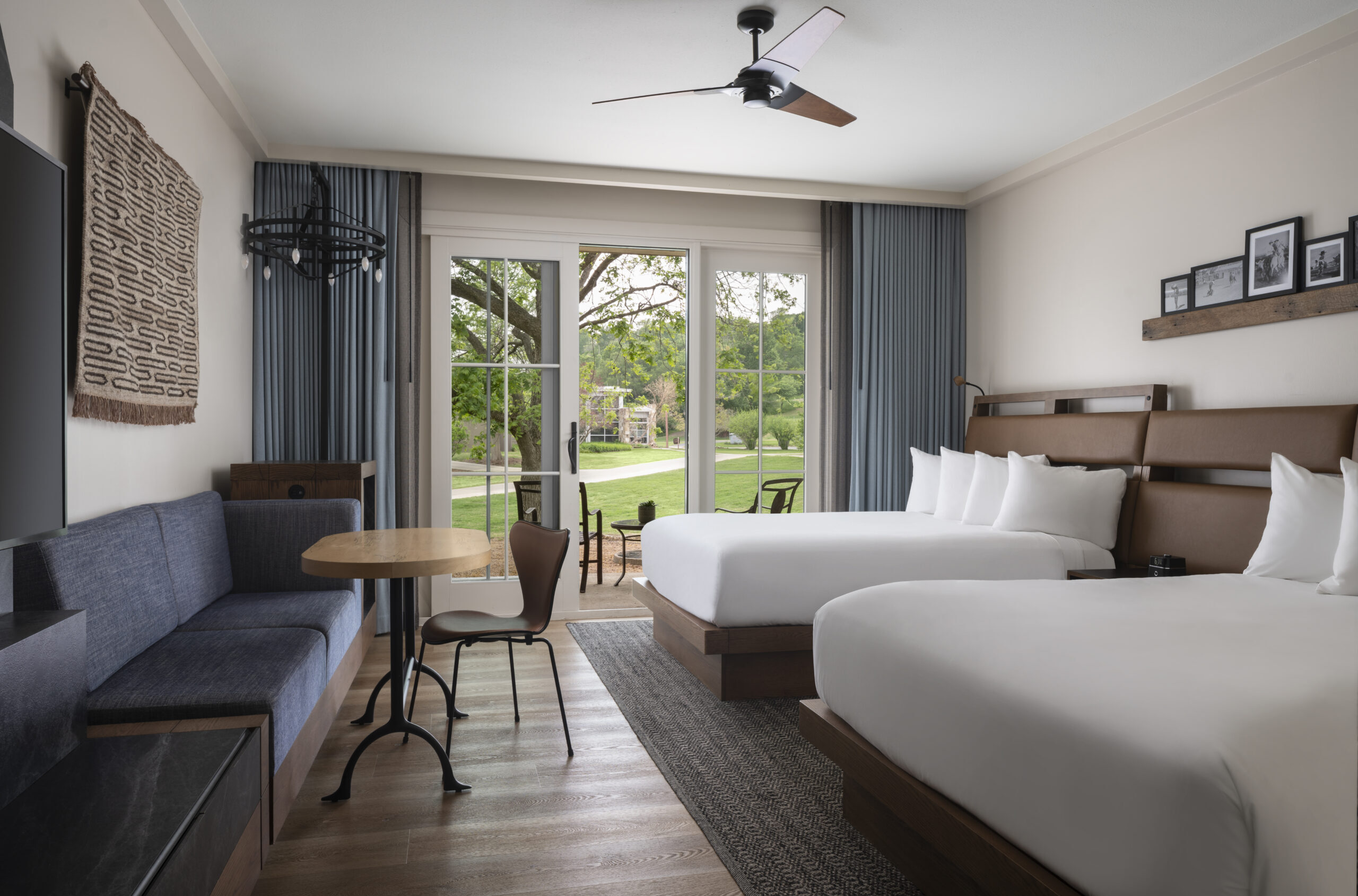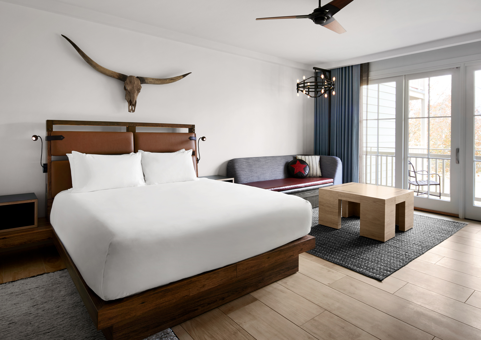 Located on 405 acres along the banks of the Colorado River, the Hyatt Regency Lost Pines Resort & Spa is a relaxing retreat outside of Austin. The design of the renovated 491 guestrooms, including 58 suites, takes a cue from multiple historic and cultural sources while blending a modern aesthetic. Among those inspirations are the Native American tribes who originated in the region, as well as the first Texas ranchers, who worked alongside Spaniards and Mexicans, to build the early farmsteads of Texas. That melting pot of cultures proves an important aesthetic influence on the project. The pioneer era of the 18th century, which introduced cattle ranching and ranch-style building techniques, and the rise of the American cowboy also strongly influence the hotel’s visual language.