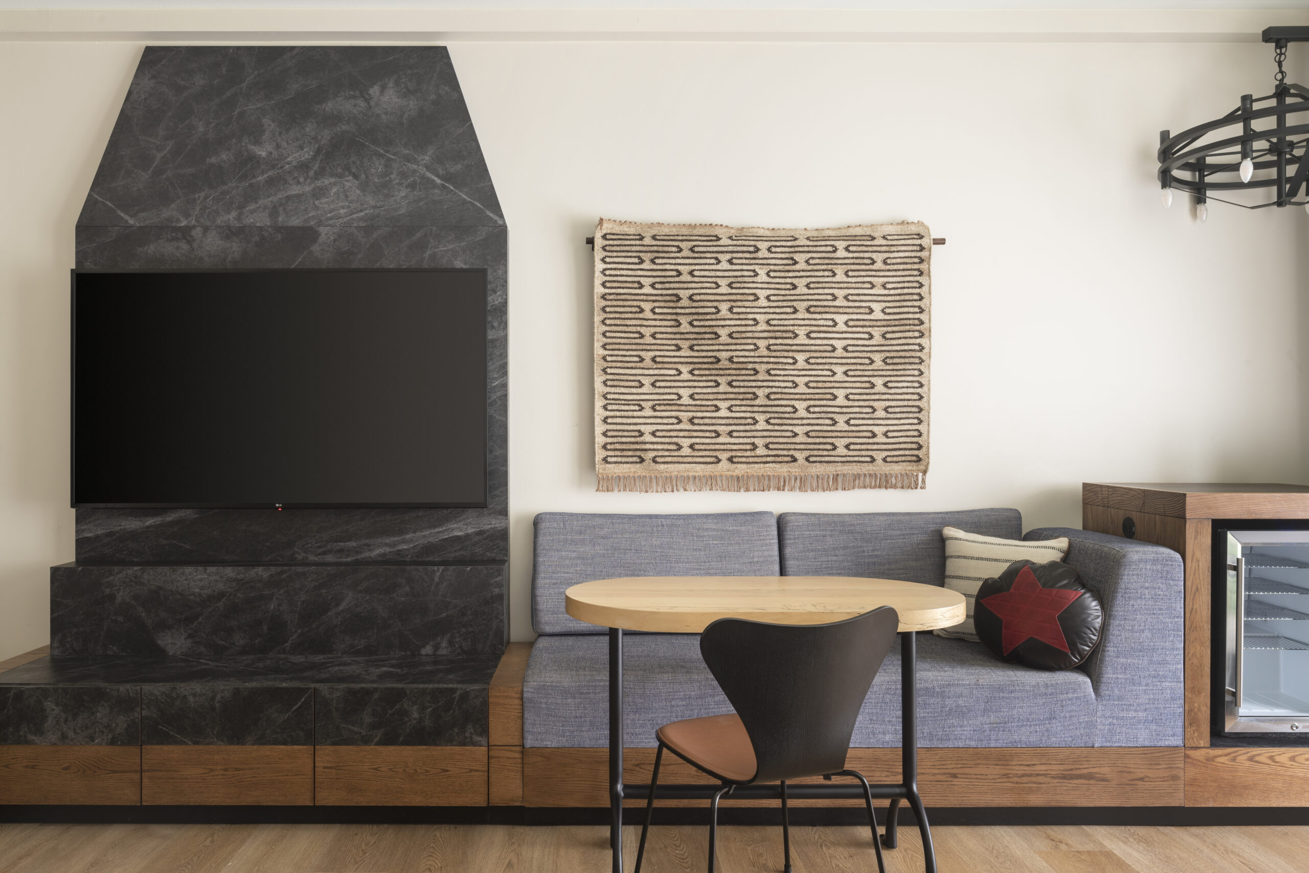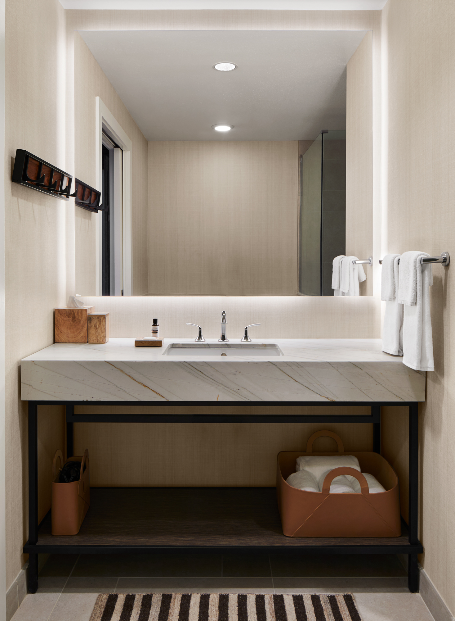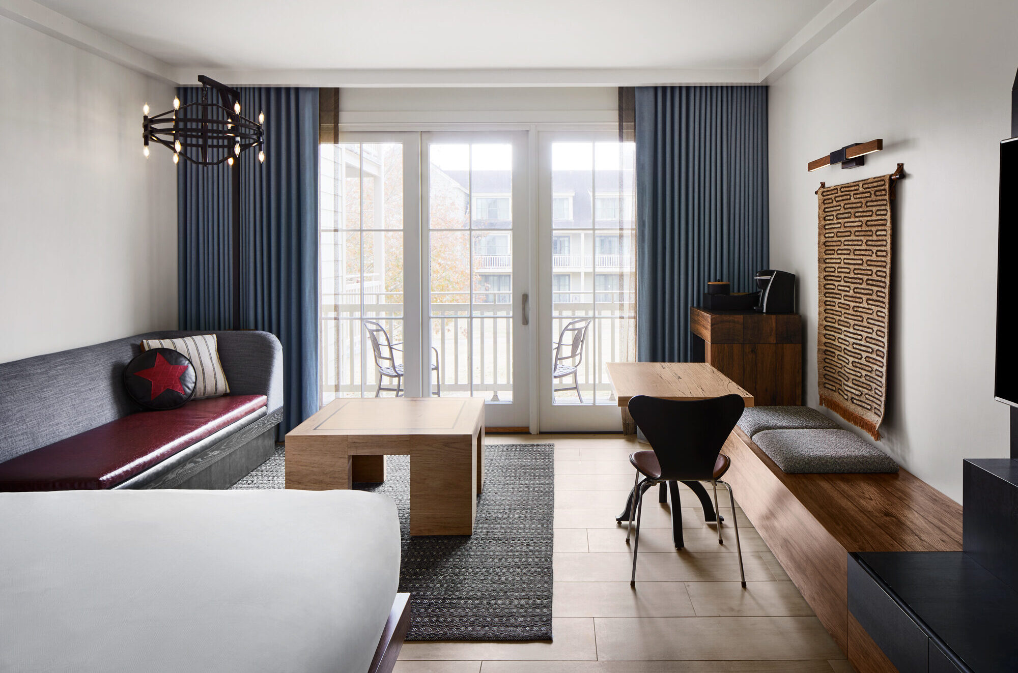 Located on 405 acres along the banks of the Colorado River, the Hyatt Regency Lost Pines Resort & Spa is a relaxing retreat outside of Austin. The design of the renovated 491 guestrooms, including 58 suites, takes a cue from multiple historic and cultural sources while blending a modern aesthetic. Among those inspirations are the Native American tribes who originated in the region, as well as the first Texas ranchers, who worked alongside Spaniards and Mexicans, to build the early farmsteads of Texas. That melting pot of cultures proves an important aesthetic influence on the project. The pioneer era of the 18th century, which introduced cattle ranching and ranch-style building techniques, and the rise of the American cowboy also strongly influence the hotel’s visual language.