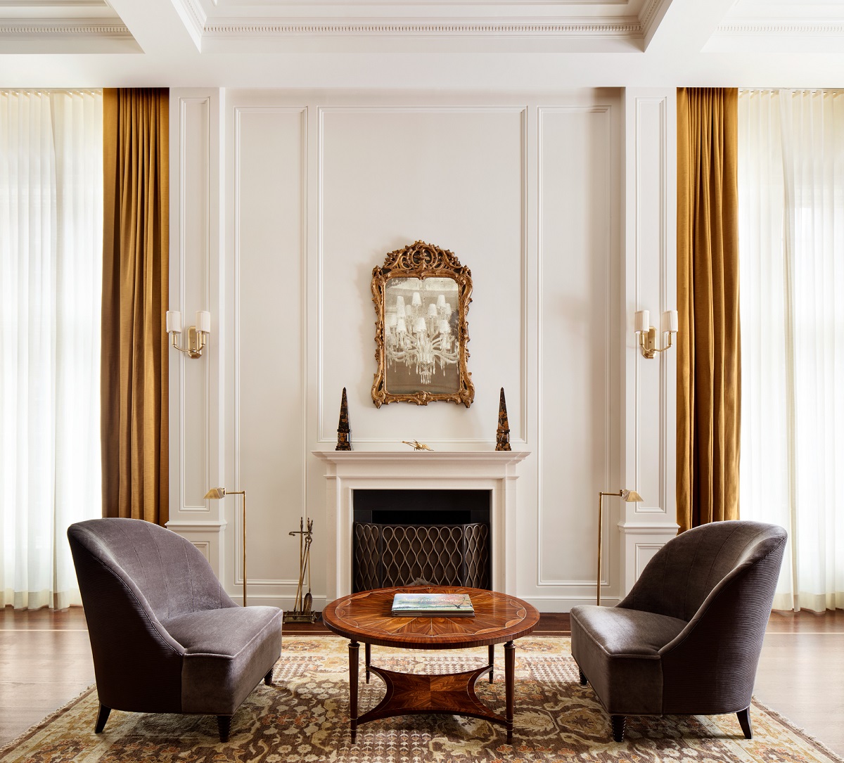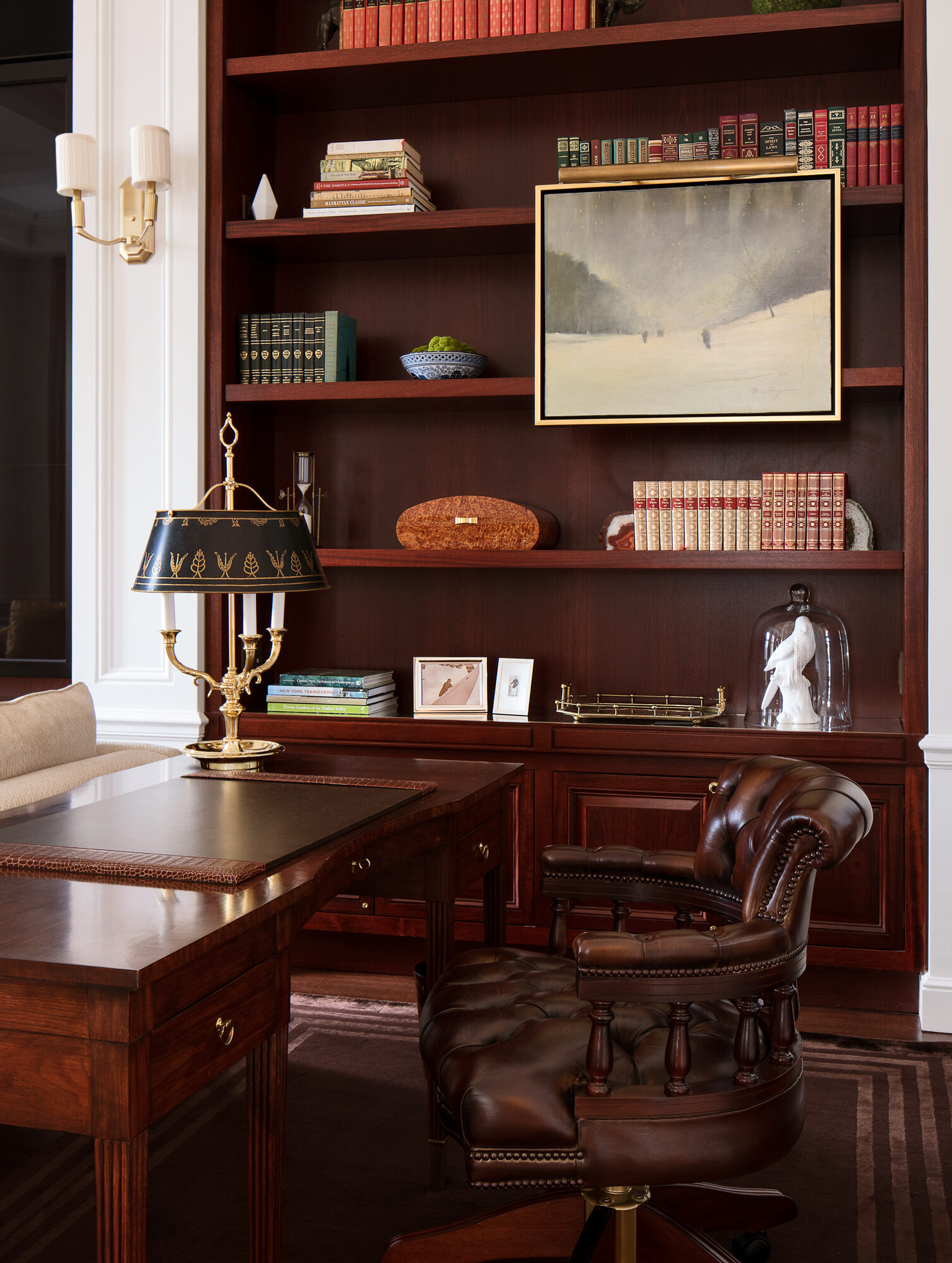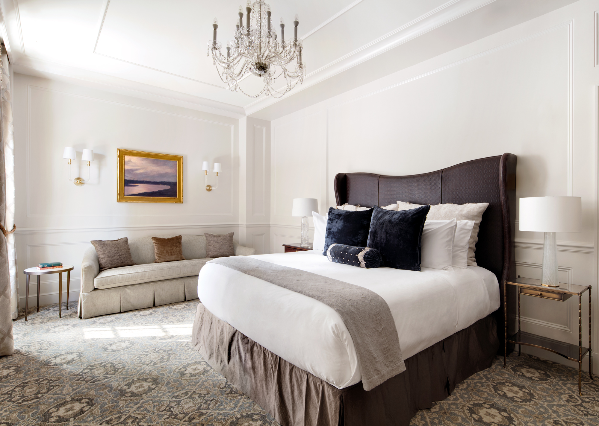 The Intercontinental New York Barclay’s Sky Suite is designed to offer a residential atmosphere beloved by the hotel’s illustrious guests from past decades, including the one of the hotel’s early and most prominent residents, Harold Stirling Vanderbilt. The classic environments are expressed through design, artwork, and standout materials, including stone flooring, marble wall paneling, antique Persian carpets, mahogany crown molding, bases and millwork bookcases, and historic maps of Manhattan. The master bath is fully lined in grey marble, while guests and their visitors arrive through a reception area arrayed with red oak floor and white oak borders. The suite also has dressing rooms with built-in millwork and private fitness rooms with state-of-the-art fitness equipment.
