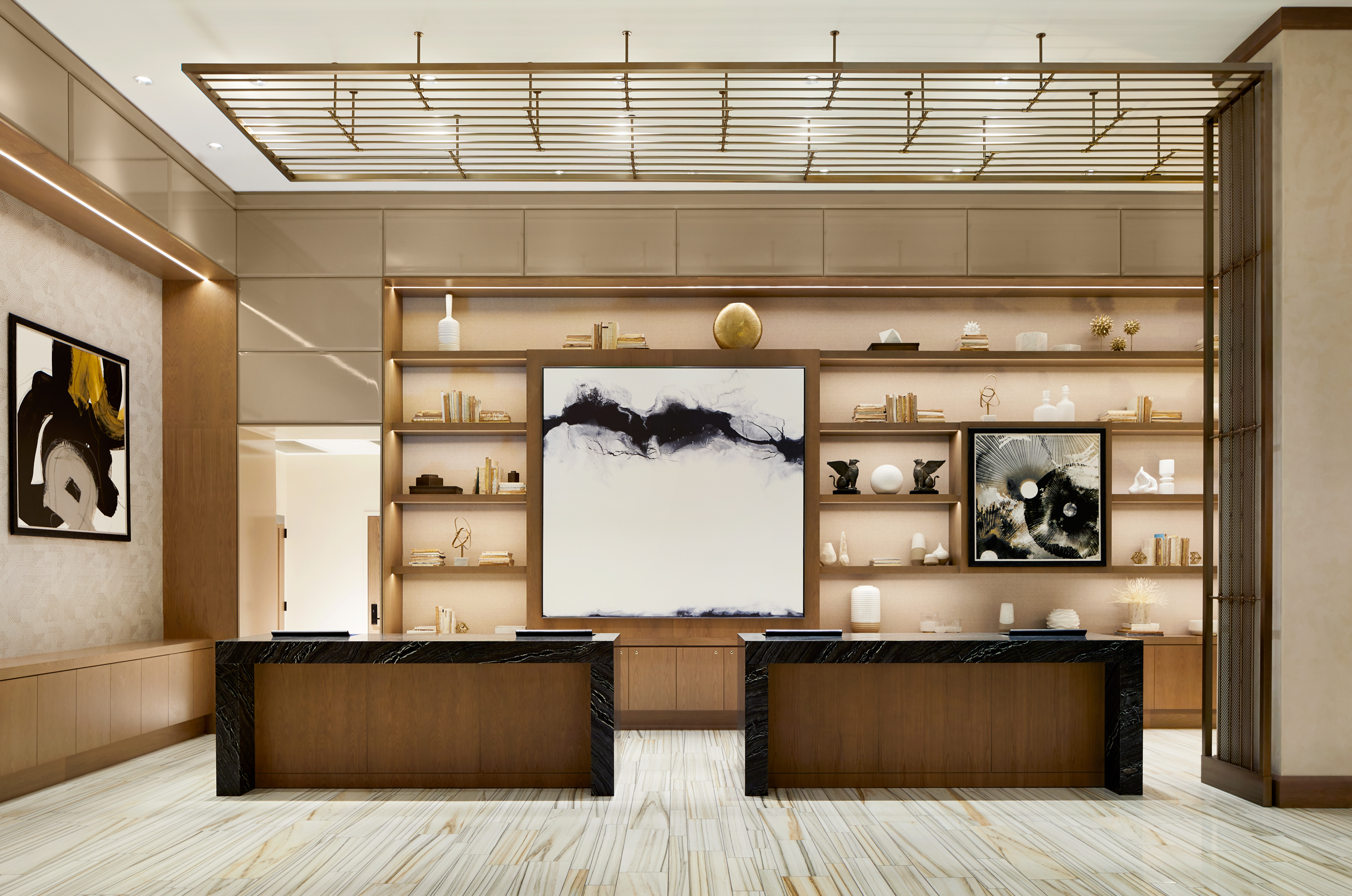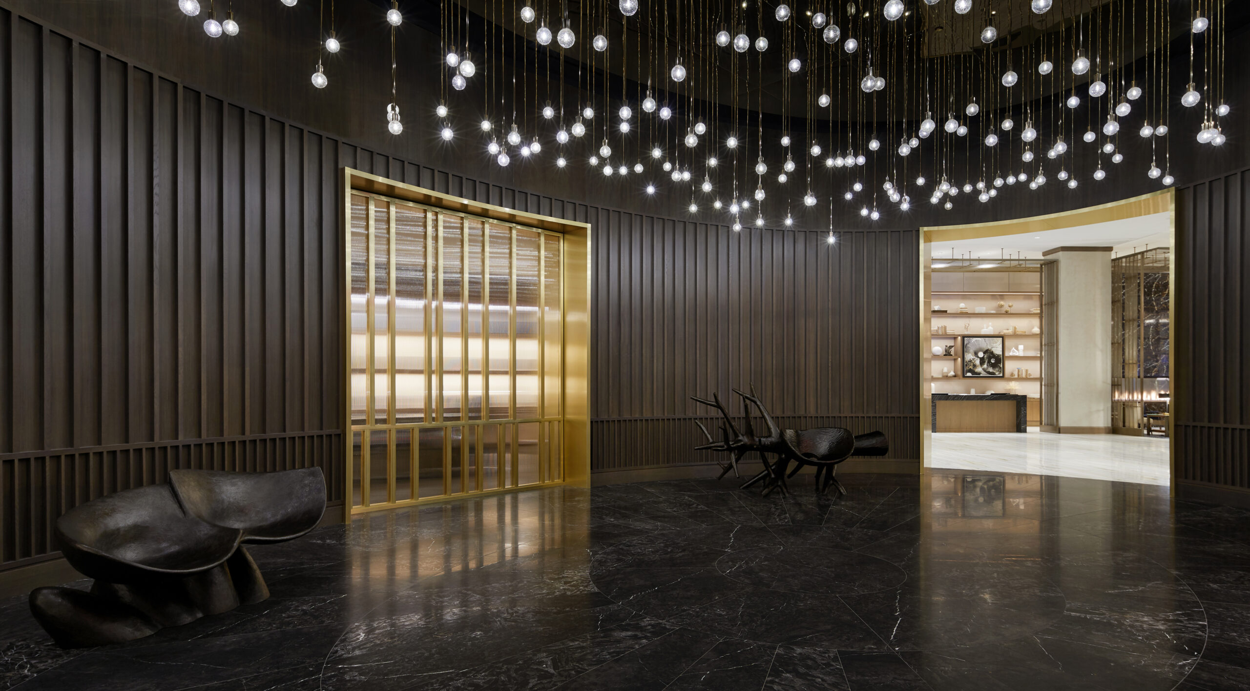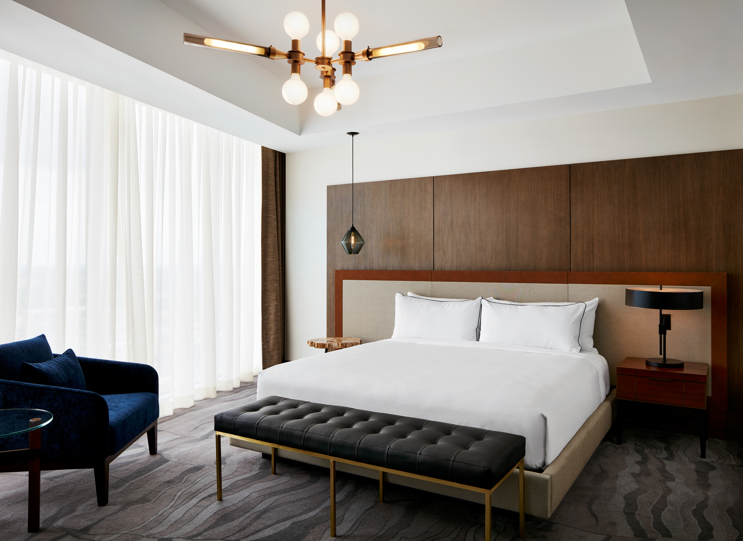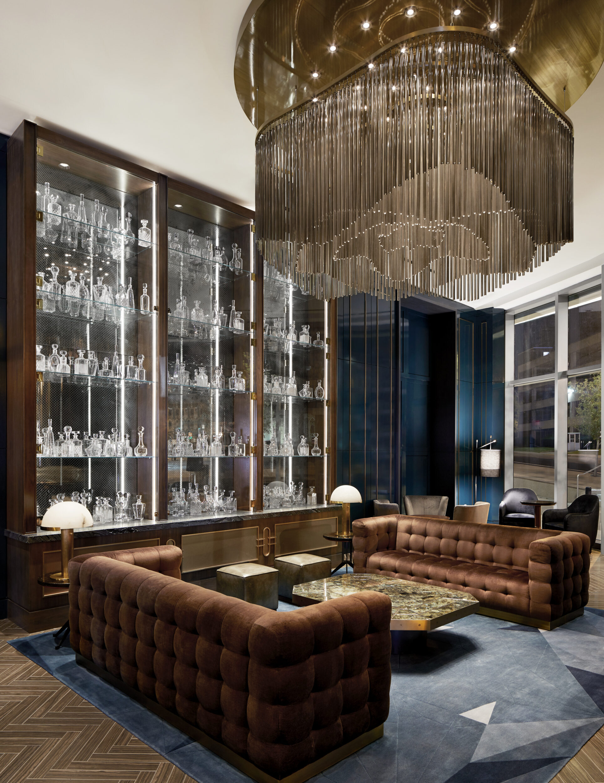 Upon entry, guests arrive through a wooden envelope imagined as a “firefly jar,” referencing one of Tennessee's state symbols with 232 hanging glass pendants that float overhead. In the lobby, marble flooring and oak bookshelves lining the walls evoke a residential feel while seating groups surrounding the floor-to-ceiling Portoro black marble fireplace lend to a sense of intimacy. Beyond the lobby, guests can relax at the Kenya black marble topped bar or in the upscale living room with floor-to-ceiling windows. The hotel’s expansive event spaces and luxurious spa complete the public space program. Residential-style guestrooms incorporate pale wood paneling with pops of deep earth tones and contemporary bronze finishes.