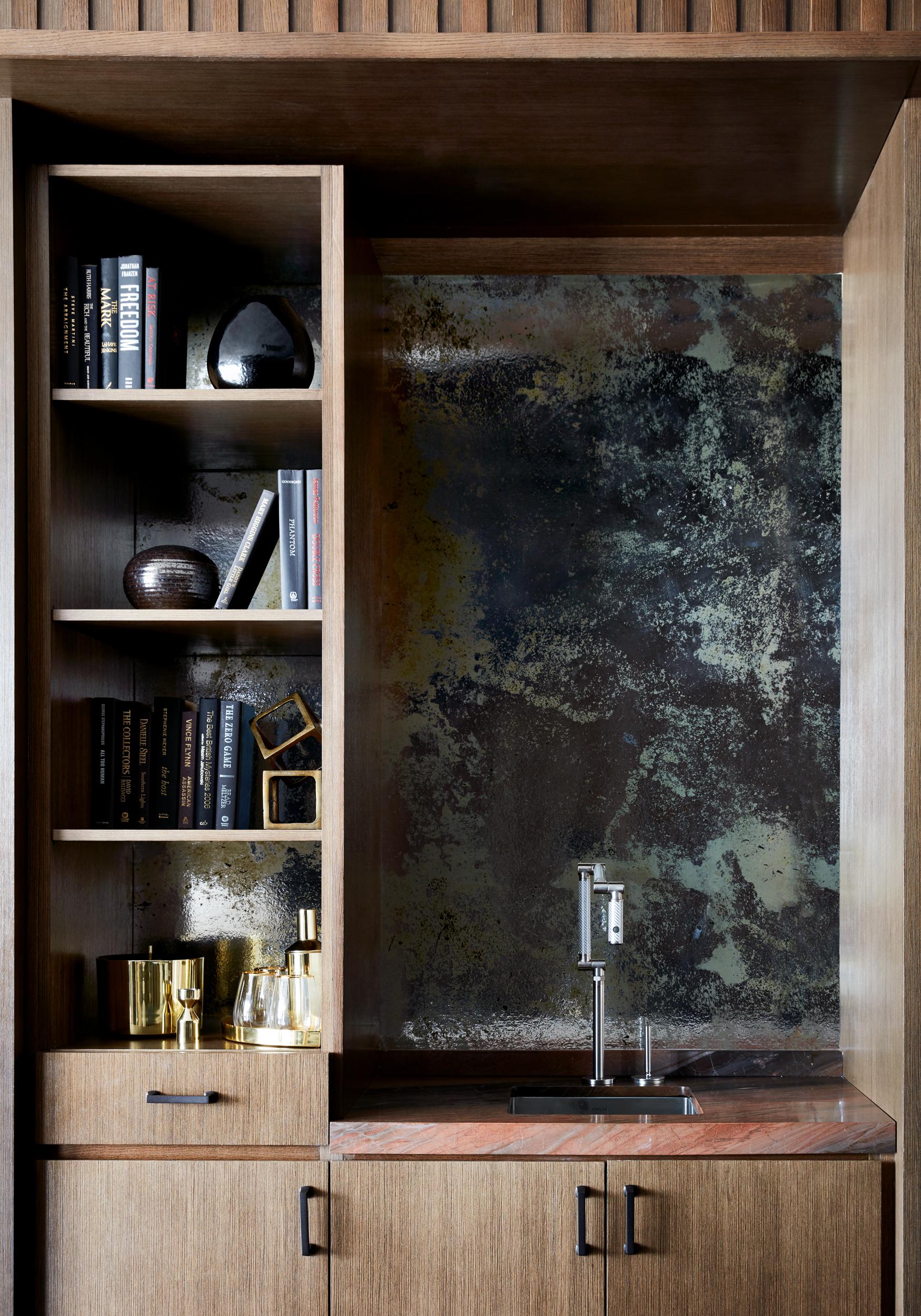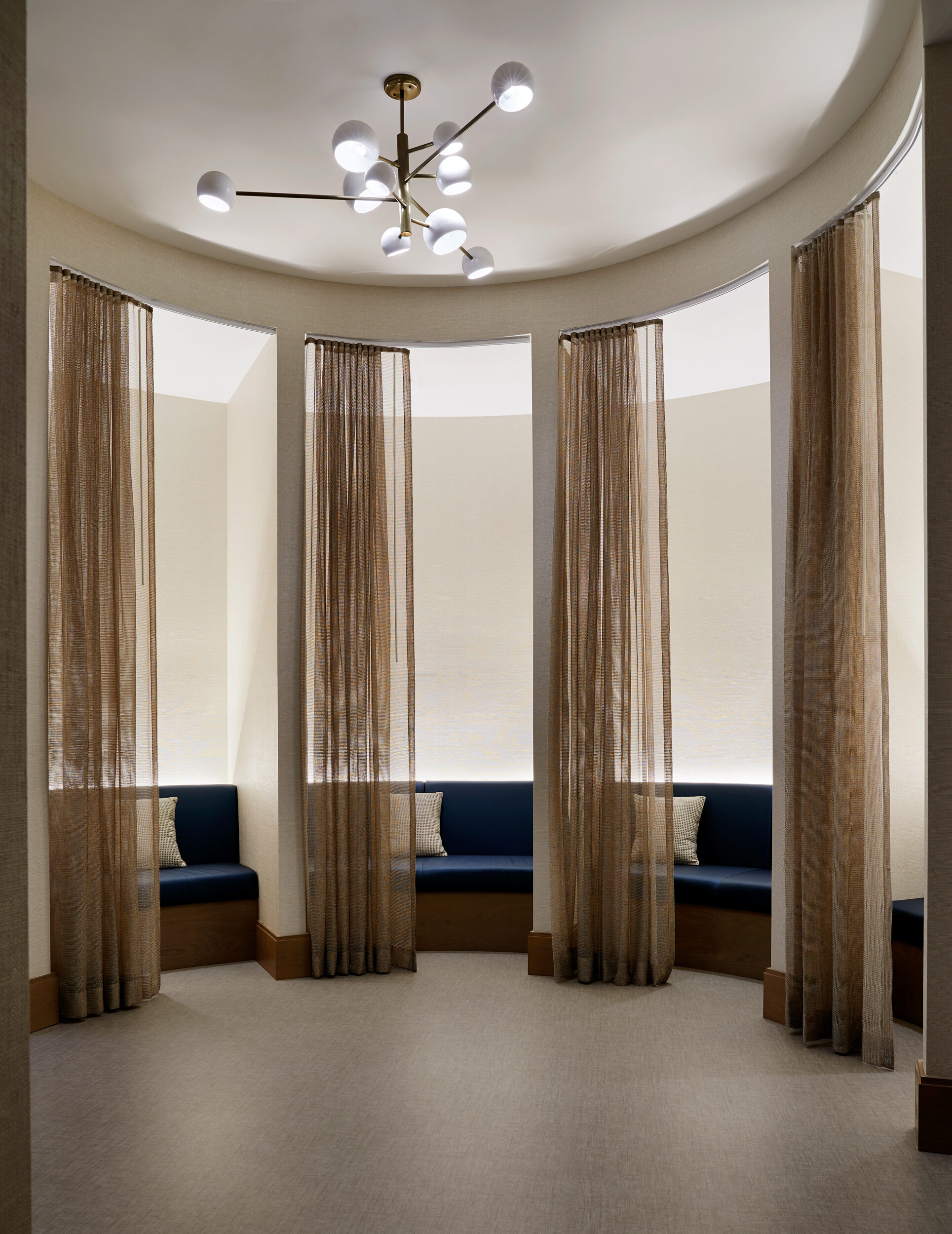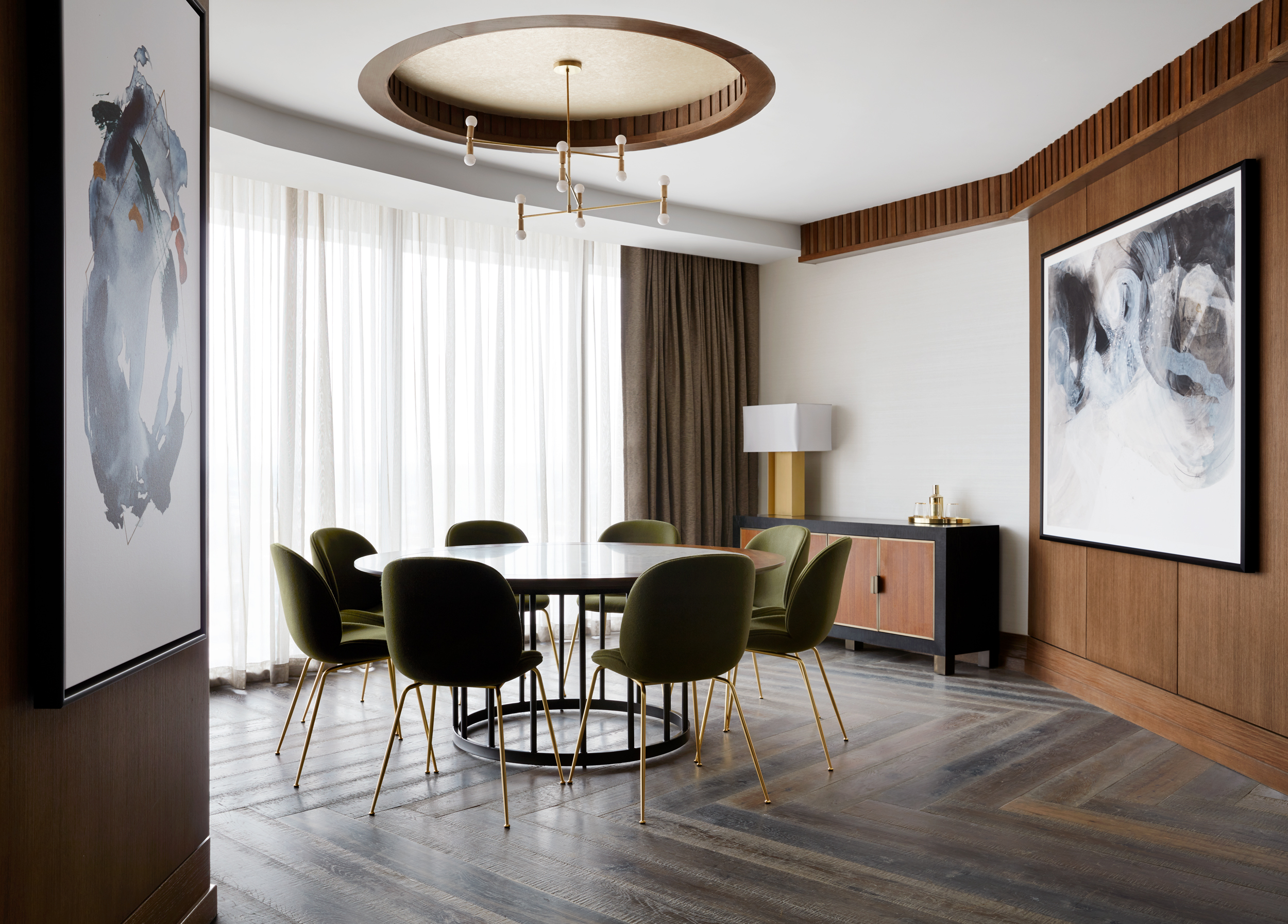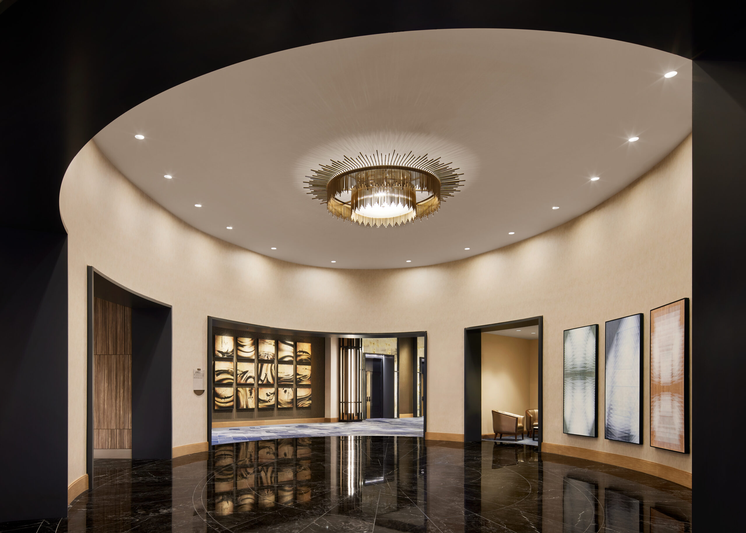Upon entry, guests arrive through a wooden envelope imagined as a “firefly jar,” referencing one of Tennessee's state symbols with 232 hanging glass pendants that float overhead. In the lobby, marble flooring and oak bookshelves lining the walls evoke a residential feel while seating groups surrounding the floor-to-ceiling Portoro black marble fireplace lend to a sense of intimacy. Beyond the lobby, guests can relax at the Kenya black marble topped bar or in the upscale living room with floor-to-ceiling windows. The hotel’s expansive event spaces and luxurious spa complete the public space program. Residential-style guestrooms incorporate pale wood paneling with pops of deep earth tones and contemporary bronze finishes.