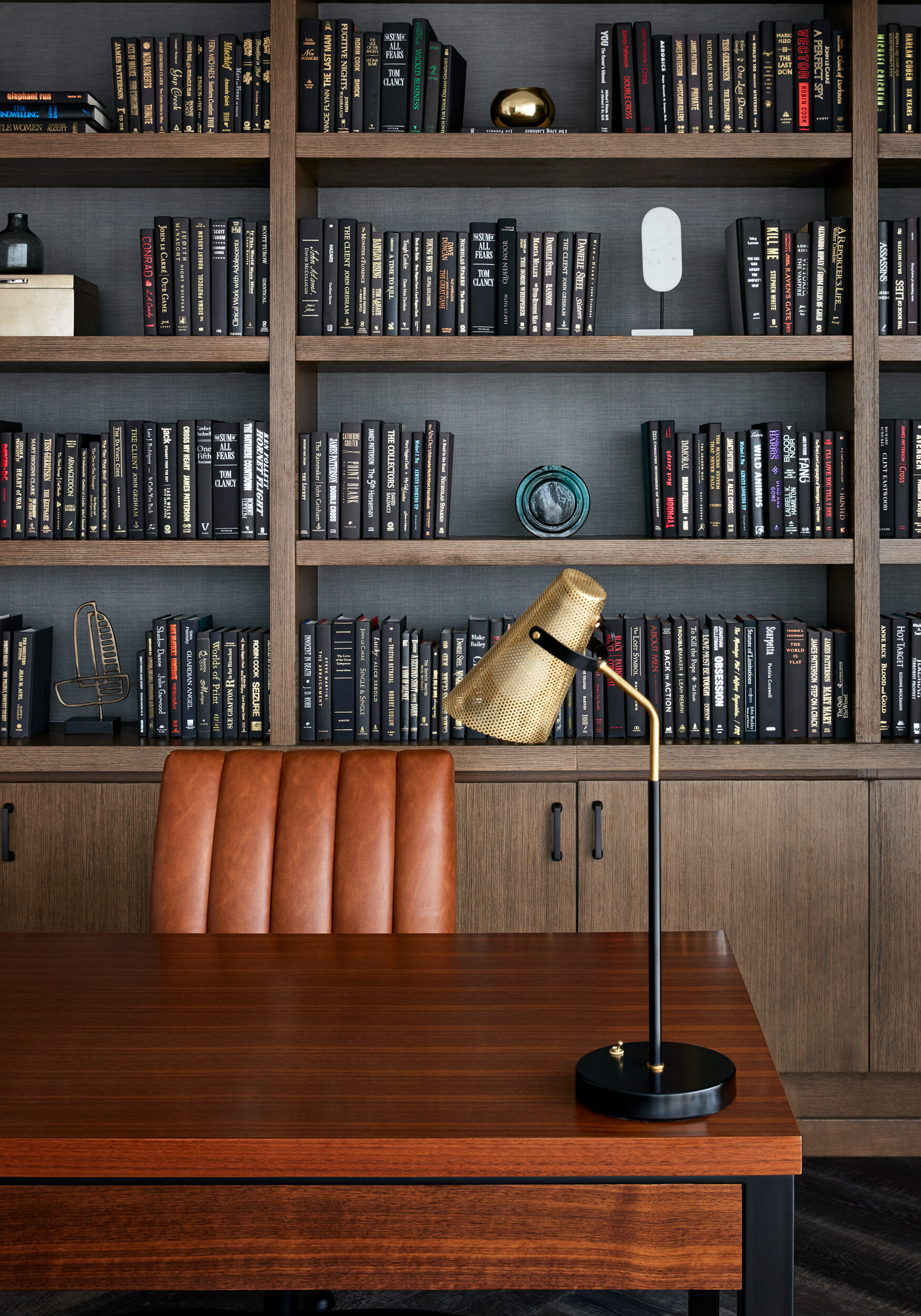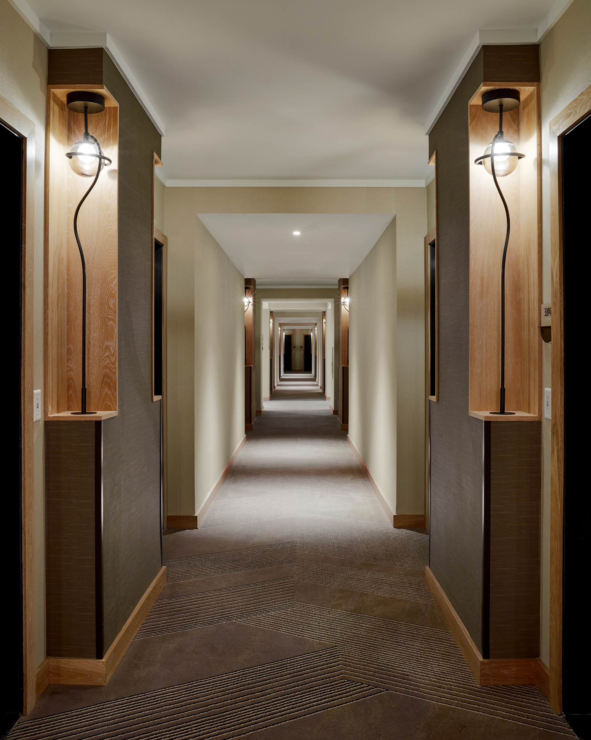 Upon entry, guests arrive through a wooden envelope imagined as a “firefly jar,” referencing one of Tennessee’s state symbols with 232 hanging glass pendants that float overhead. In the lobby, marble flooring and oak bookshelves lining the walls evoke a residential feel while seating groups surrounding the floor-to-ceiling Portoro black marble fireplace lend to a sense of intimacy. Beyond the lobby, guests can relax at the Kenya black marble topped bar or in the upscale living room with floor-to-ceiling windows. The hotel’s expansive event spaces and luxurious spa complete the public space program. Residential-style guestrooms incorporate pale wood paneling with pops of deep earth tones and contemporary bronze finishes.