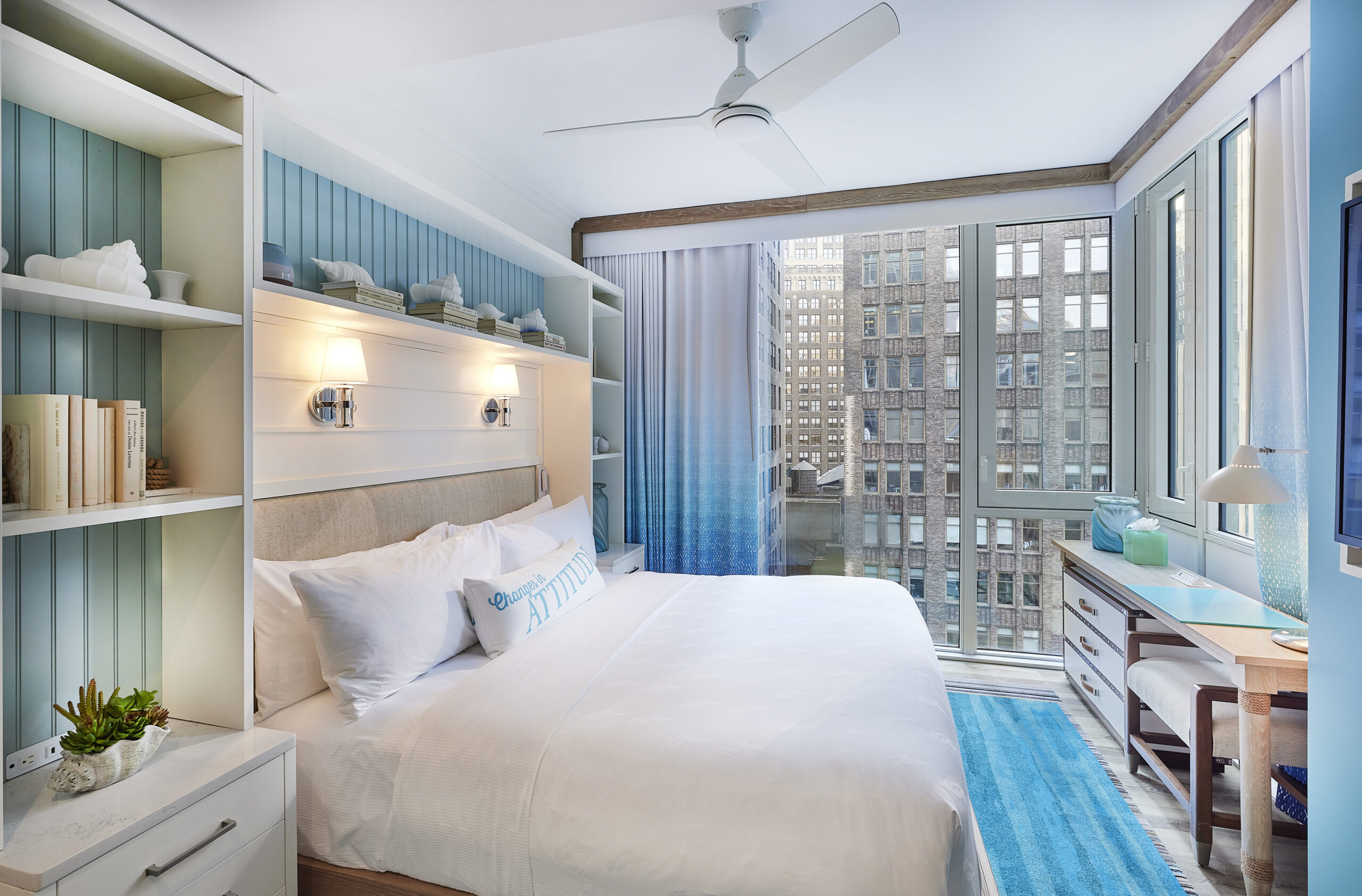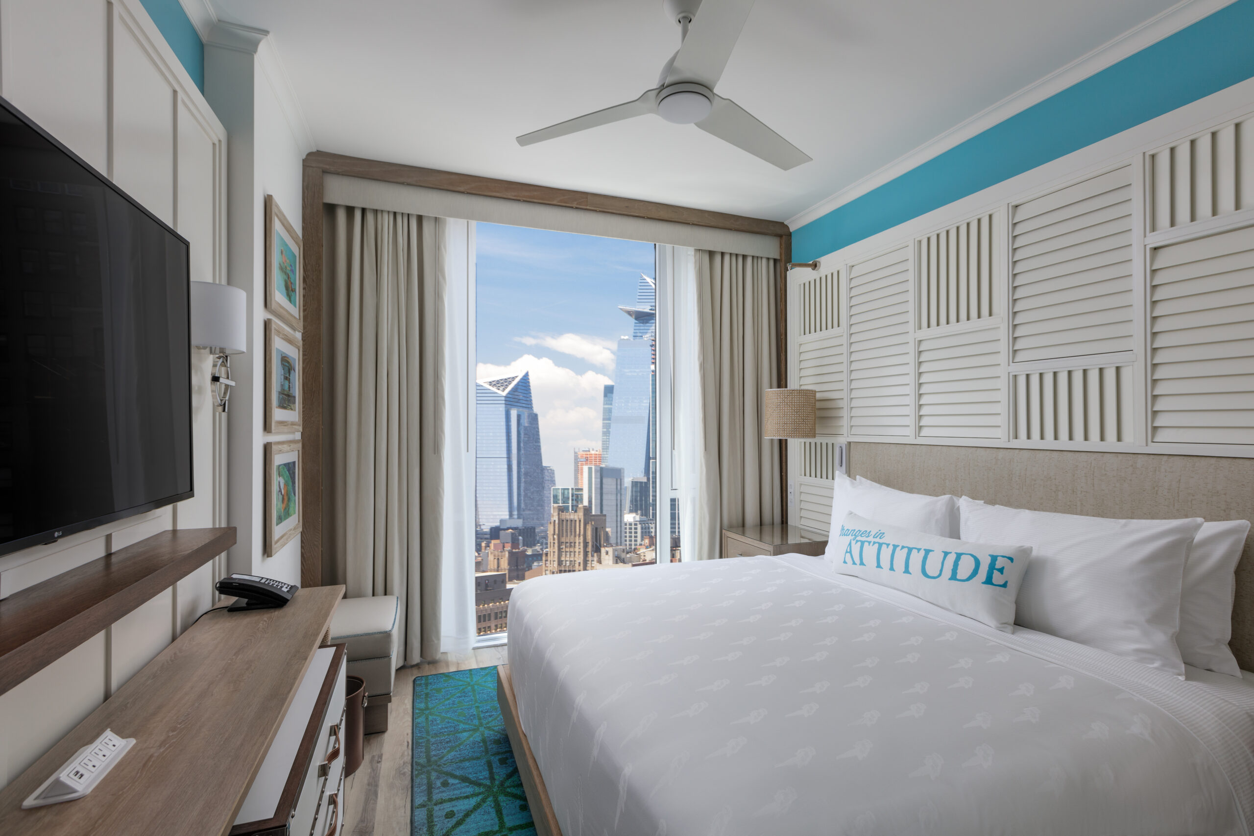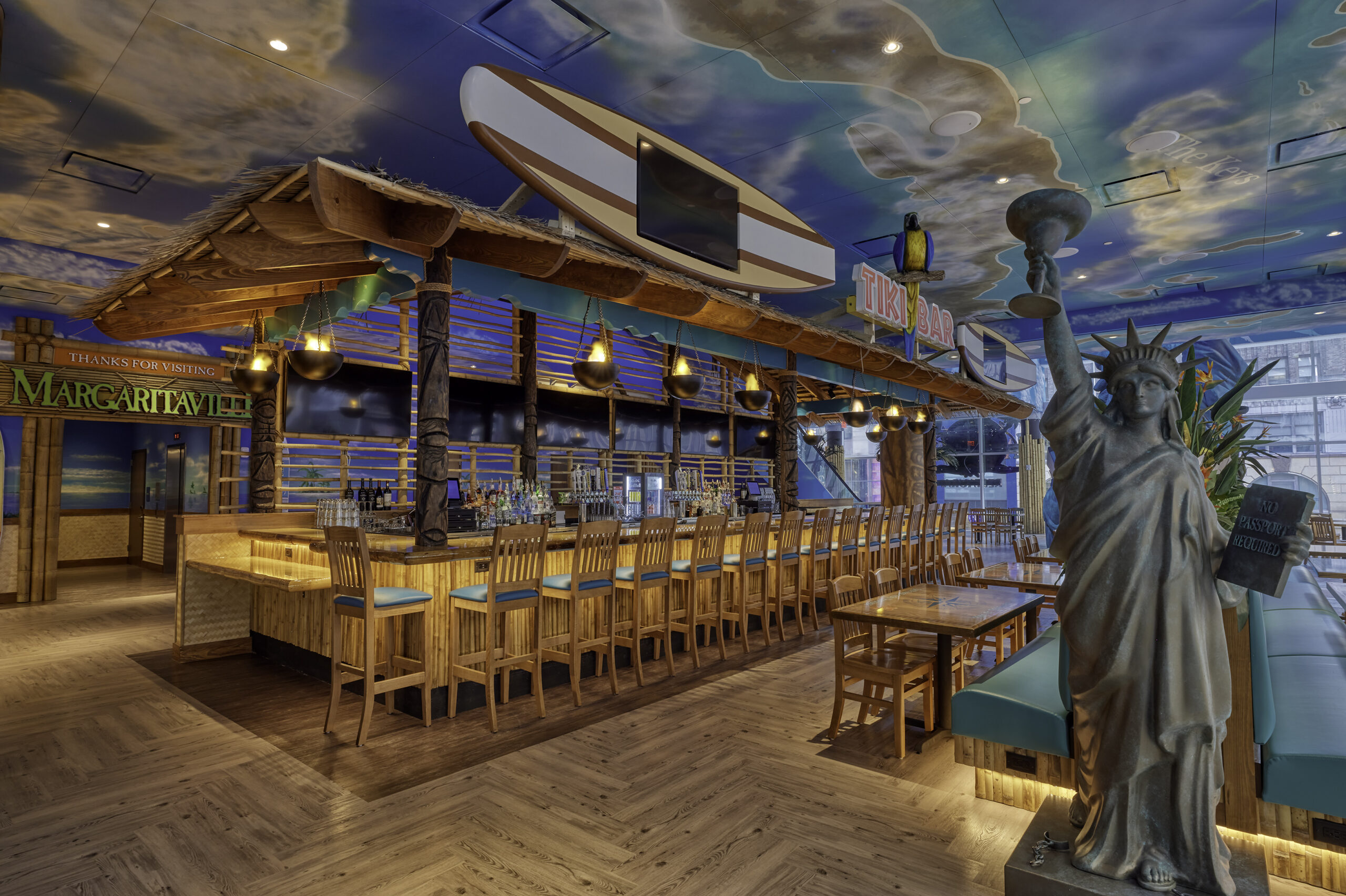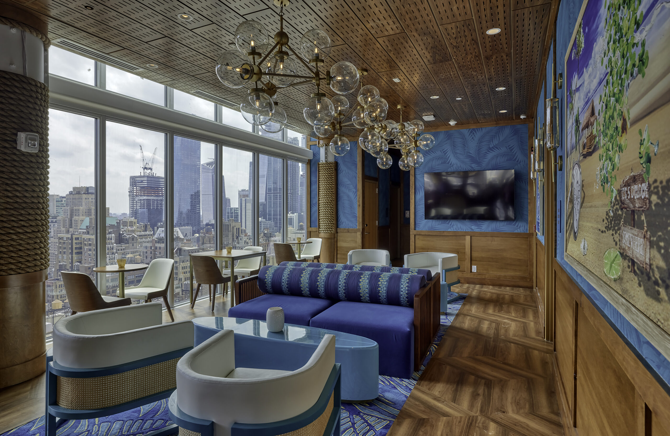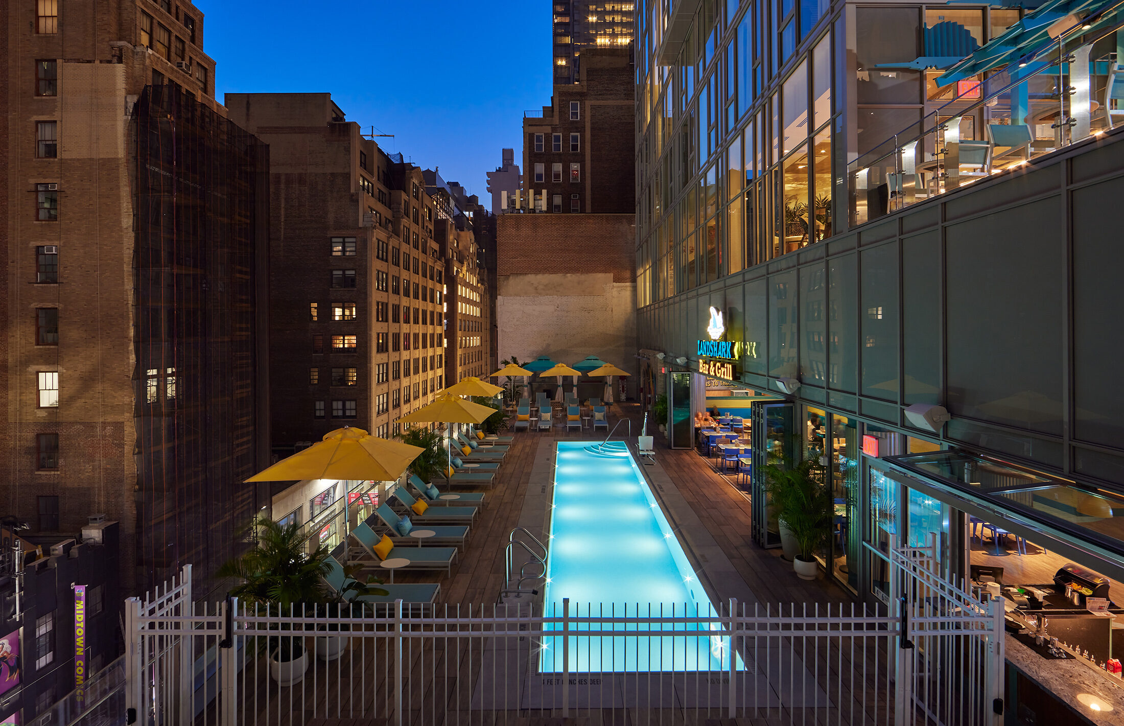 The building’s façade is covered in a glass curtain wall with a setback on the southern elevation to allow for the pool terrace. The entrance, marked by a marquee, leads into the retail space, and elevators take guests to the fifth-floor lobby. The lobby is outfitted with a fireplace on the adjacent outdoor terrace, which houses the License to Chill Bar, and a set of stairs leads downstairs to the pool on the fourth floor, as well as the indoor/outdoor Land Shark Bar & Grill. The second and third floors are occupied by the Margaritaville Restaurant with guestrooms sitting on the floors above. The 5 o’Clock Somewhere Bars pans the top two floors with terraces that offer striking views of Times Square.