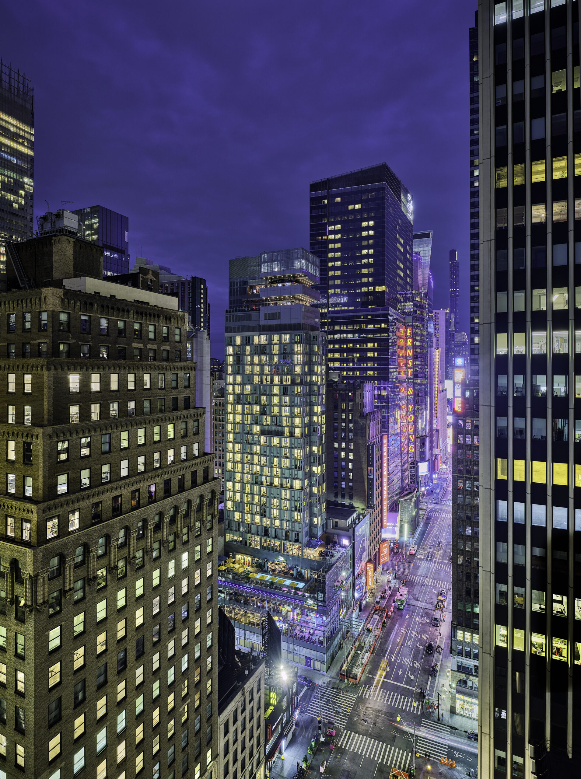 The Margaritaville Resort Times Square, a 32-story, 234-room new build hotel, boasts several food and beverage concepts, including a rooftop bar, an outdoor pool, ground floor retail, and below-grade floors that extend underground for 30 feet. A double-height synagogue occupies two floors of the building’s cellar to replace the former on-site worship space.