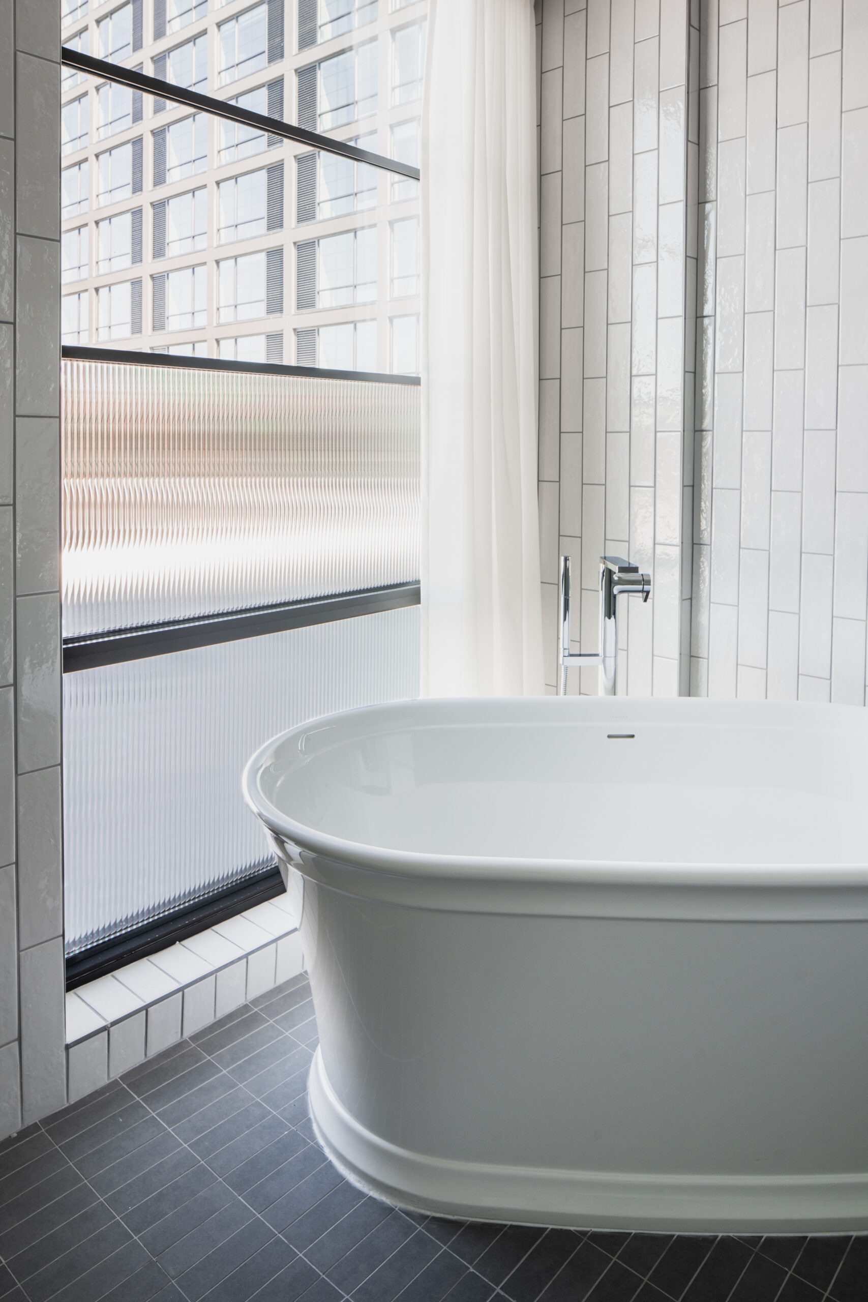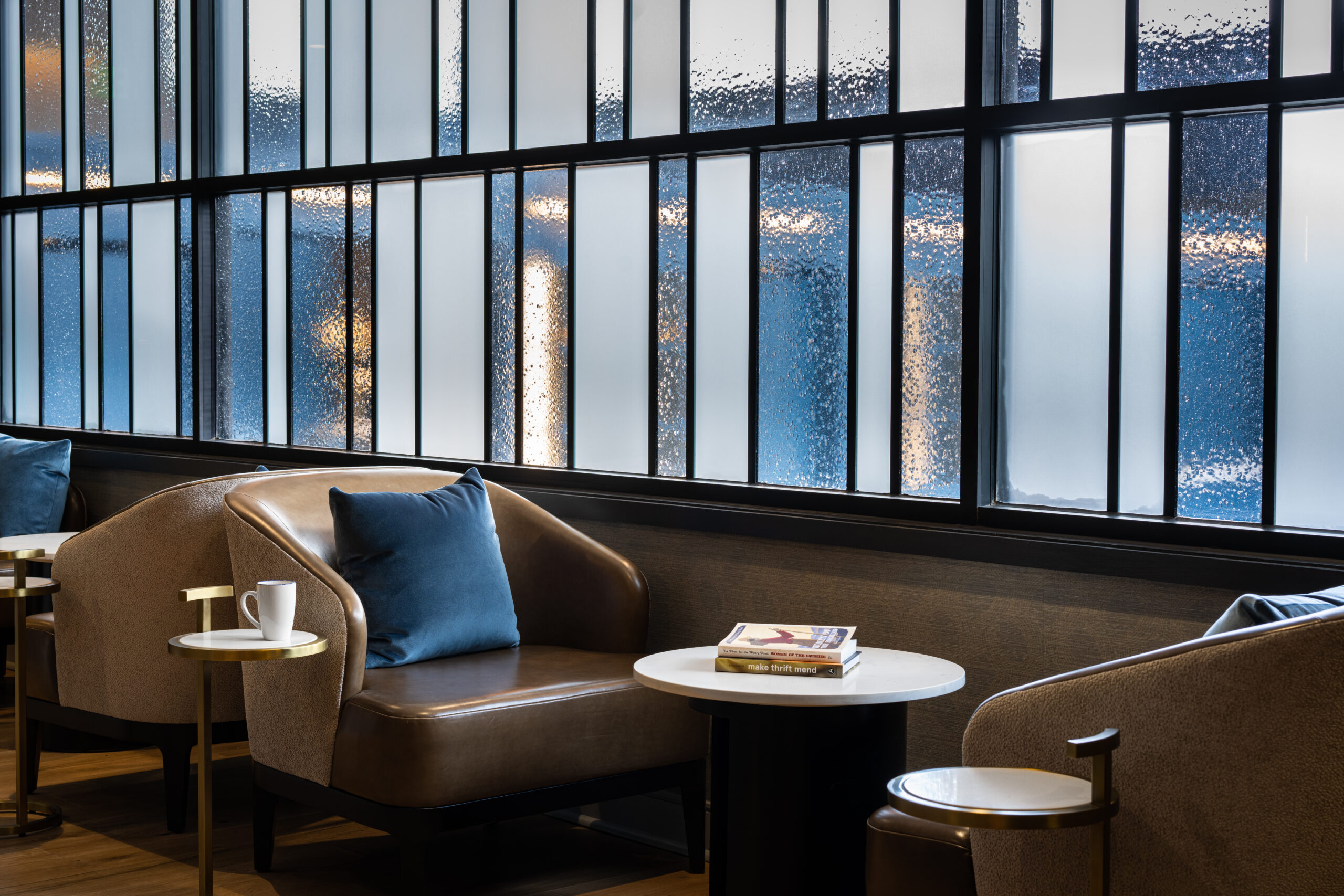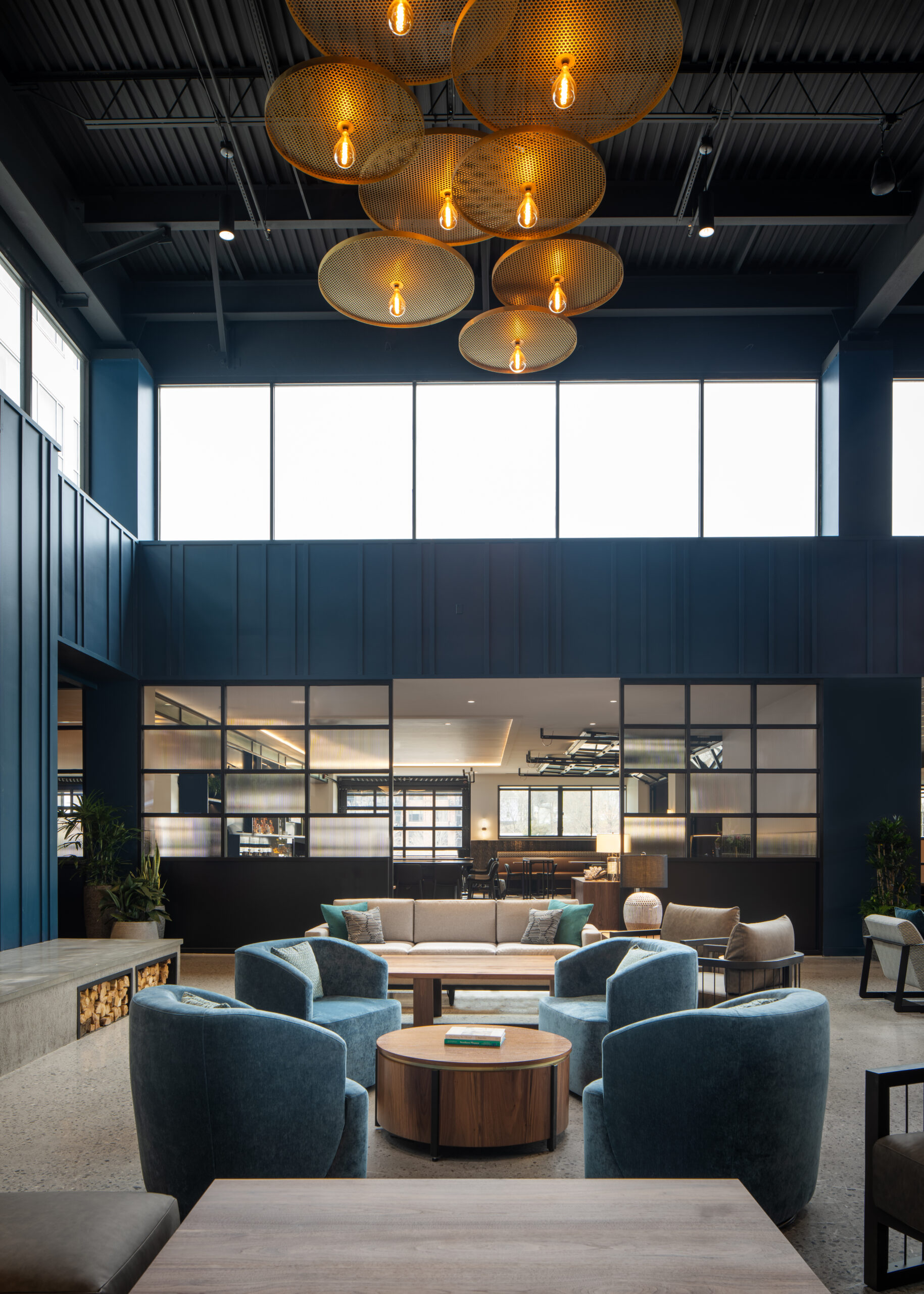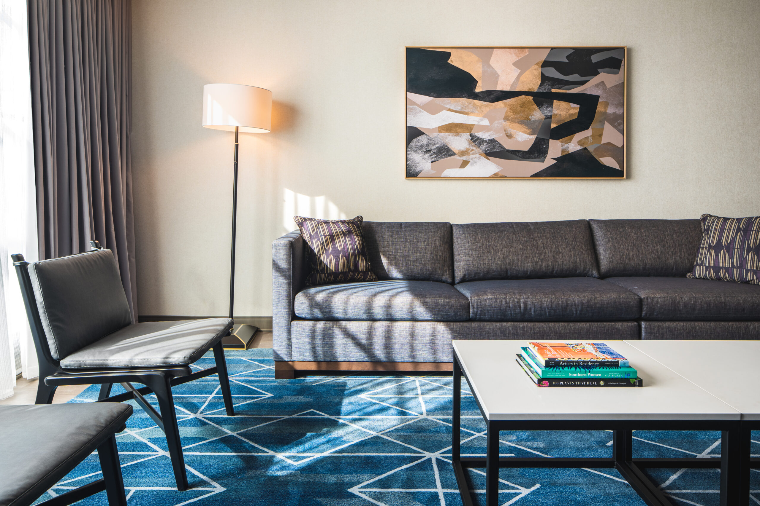 For this project—a reflagging and renovation of a Holiday Inn—Stonehill Taylor paid homage to the city’s history, while also shining a spotlight on Knoxville’s maker culture by showcasing the work of local artisans. Handcrafted wood furnishings and lighting by a local metalworker are enhanced by a palette of blues, browns, greys, and textures like nutty fabrics and leathers. The potentials of wood and glass are explored as a nod to the hand of the maker with pieces by a local textile artist introducing subtle craft elements.