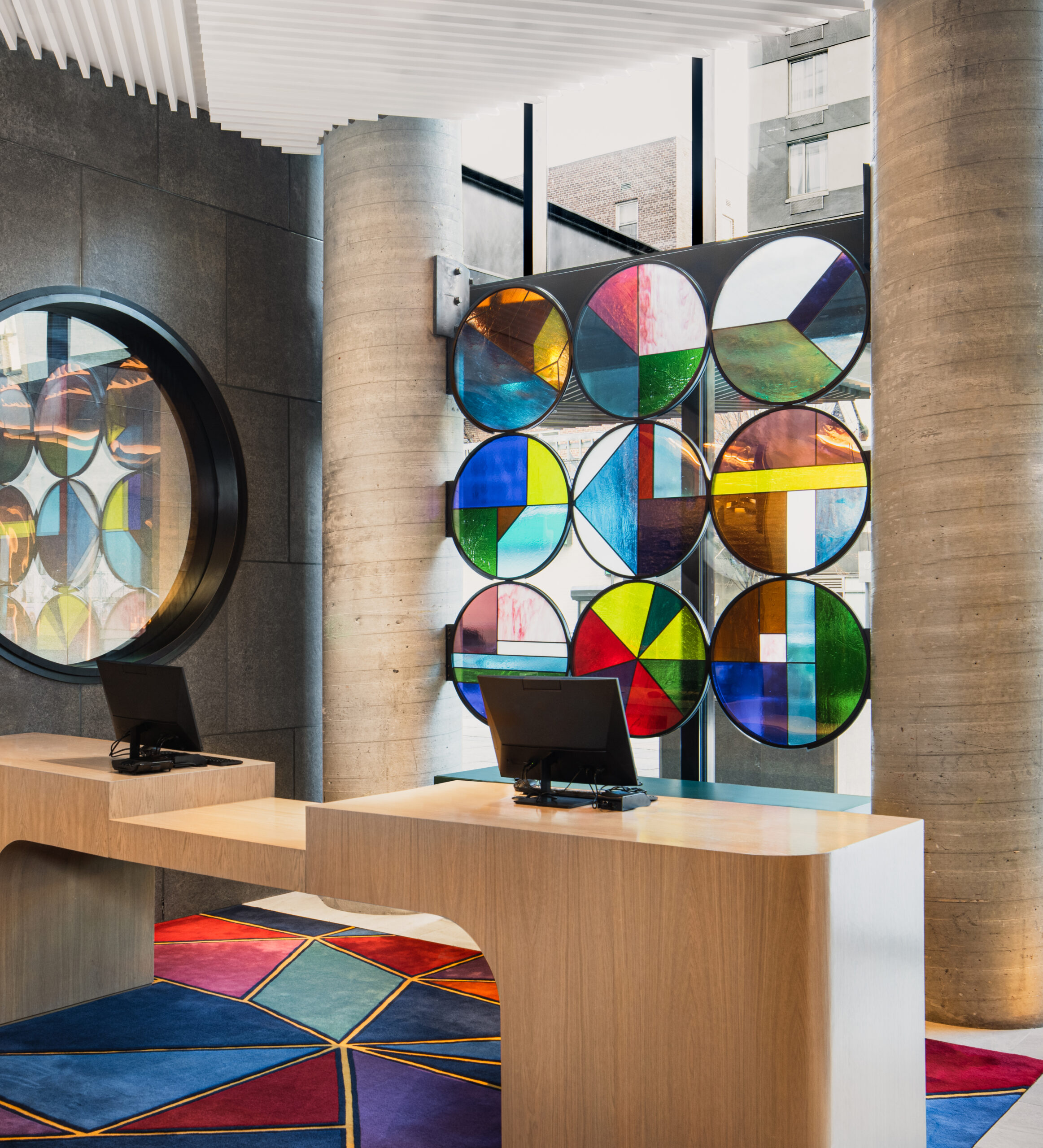As one of the first of Hilton’s new Motto brand properties to open, this 42-story, 374 key micro room hotel sets the standard for those to come. Inspired by the building’s location on 24th Street, the “24” design concept is highlighted by three unique concept pillars. The first, the 24 hours in a day, takes inspiration from the passage of time, the sun, the moon and the contrast of light to dark. The second "24ism" references metals, in particular 24-karat gold and chromium, the 24th element on the periodic table. For the third concept, the designers looked to 24-bit color, a means to produce color digitally in its truest form, which resulted in concentrated moments of vibrant jewel tones carefully curated throughout the hotel. The Architectural stand out is the entire frontage devoted to a glass-covered plaza accented by an array of brilliant white steel columns and beams spanning the plaza's entire 75-foot width. The plaza's black stone paving and east wall contrast with its white beams and columns, entwined in creating a yin/yang relationship. A 32-foot marquee cantilevered over the sidewalk announces the hotel's presence and leads to the striking "Motto green" entry doors.