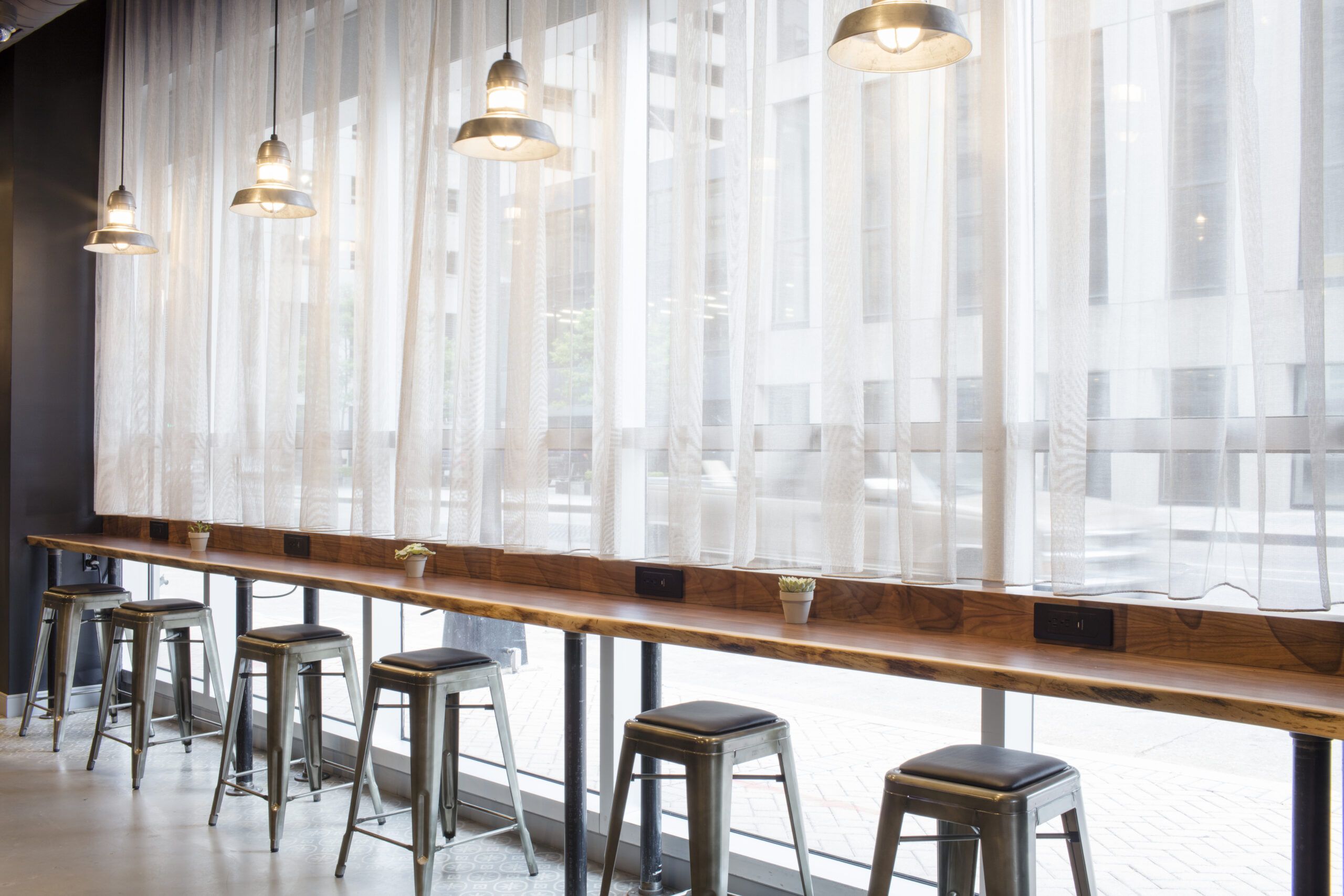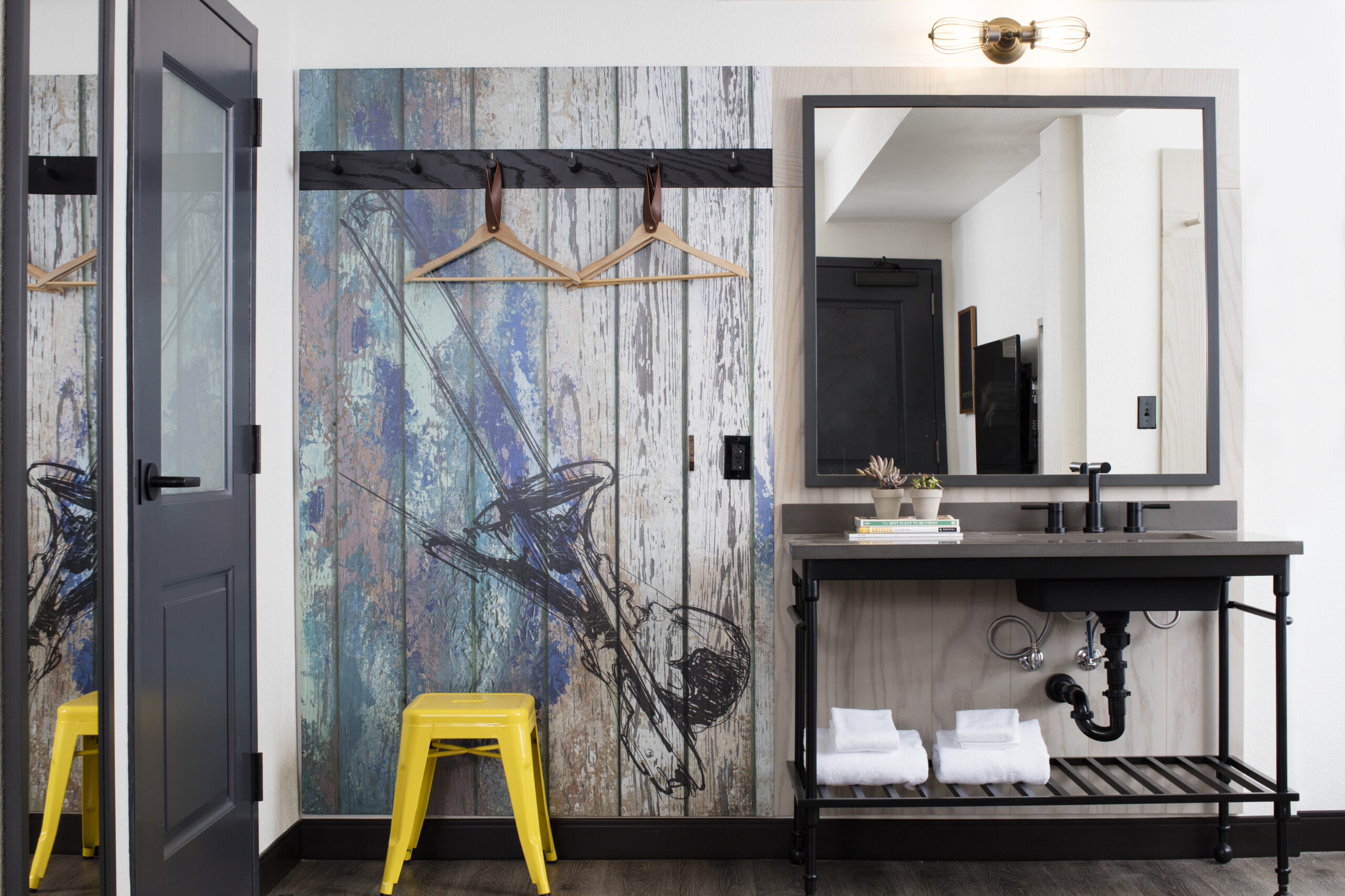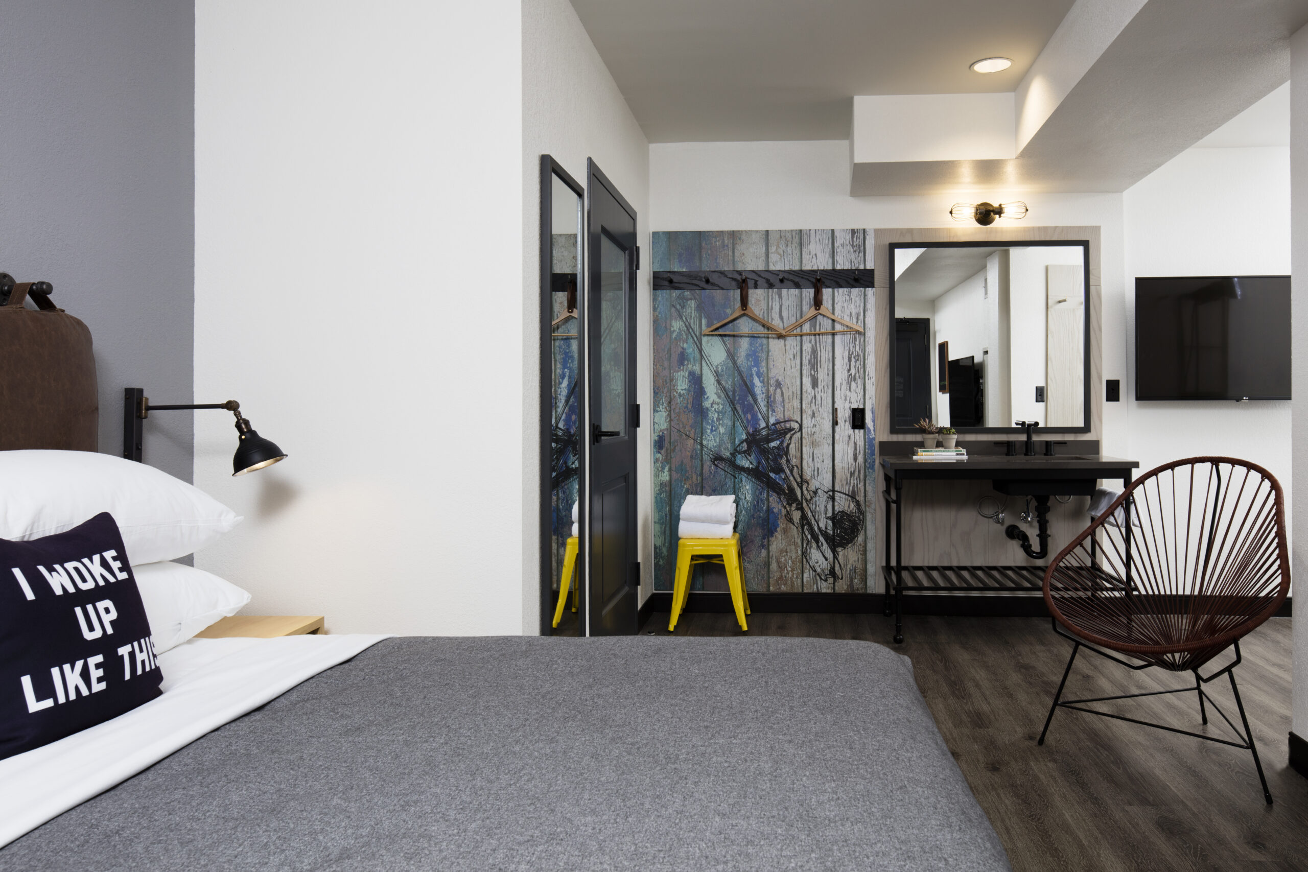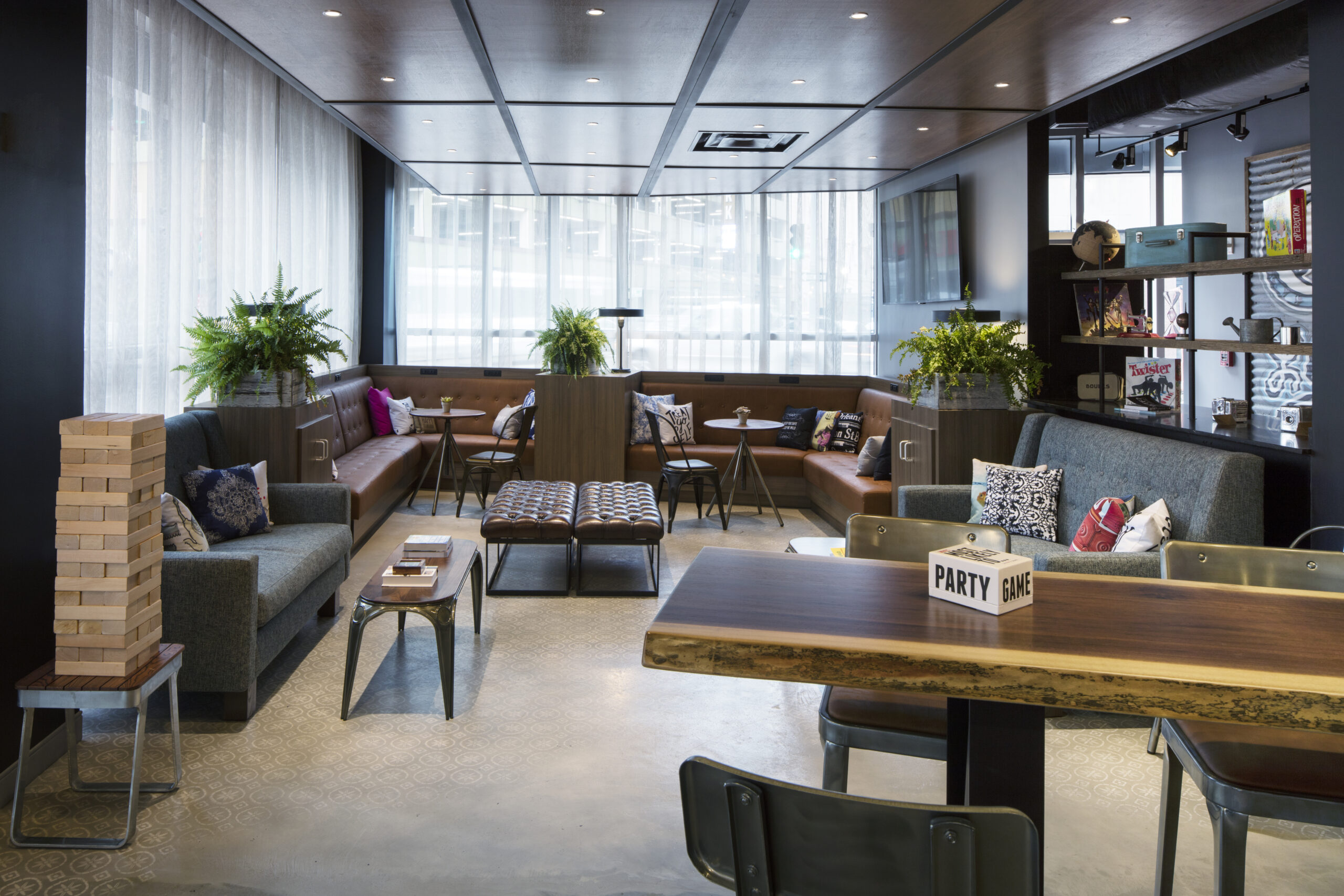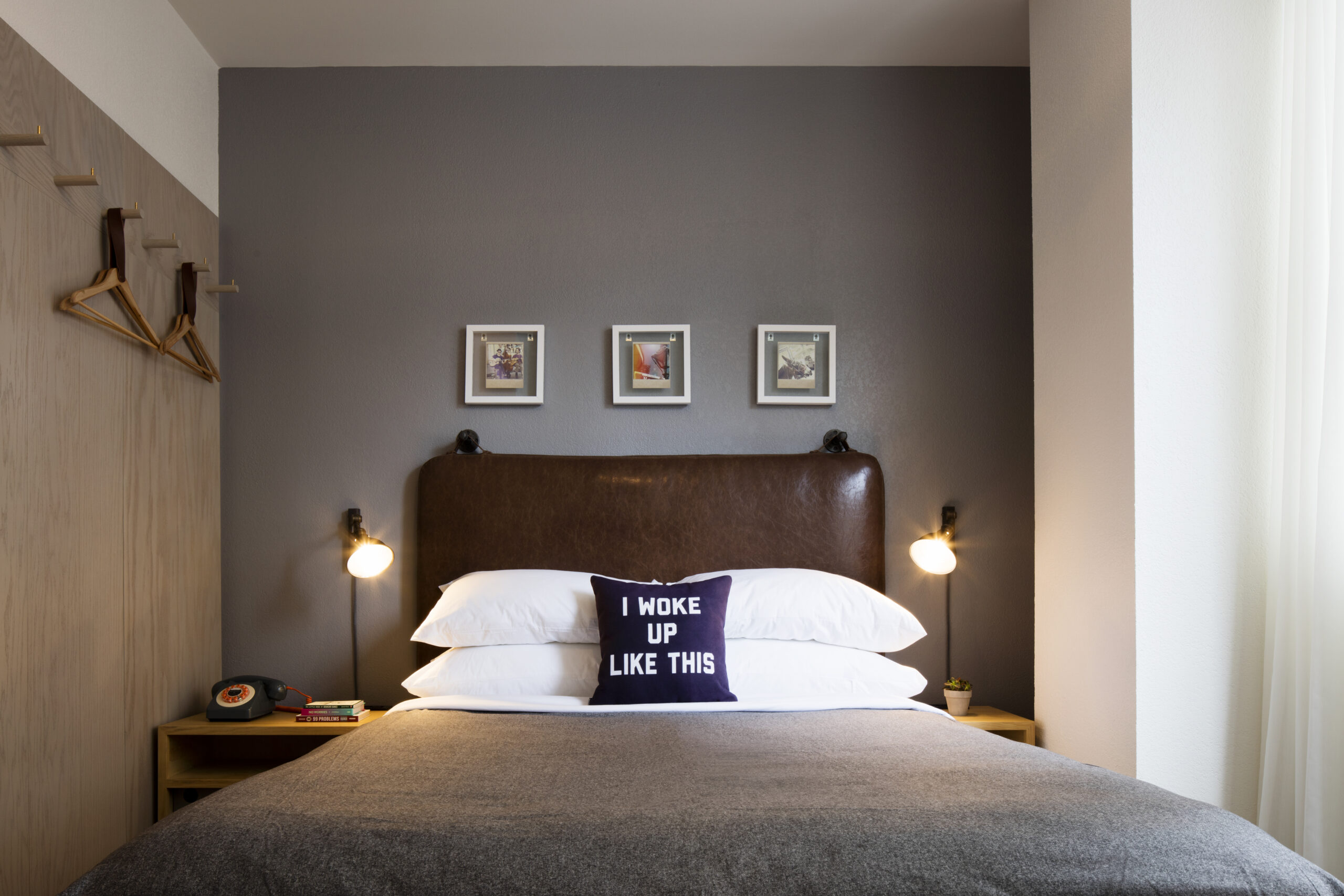 Favoring expansive public spaces in lieu of larger guest rooms, the hotel’s ground level is comprised of lounge and library areas, large central bar, and fitness room. The industrial design is marked with details referencing the surrounding historical neighborhood. Guestrooms are designed with an active traveler in mind, providing a calm respite with minimalist, flexible furnishings and unique storage solutions.