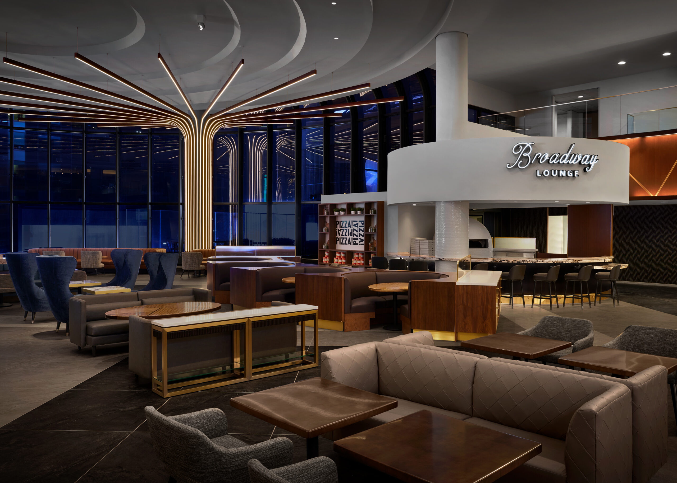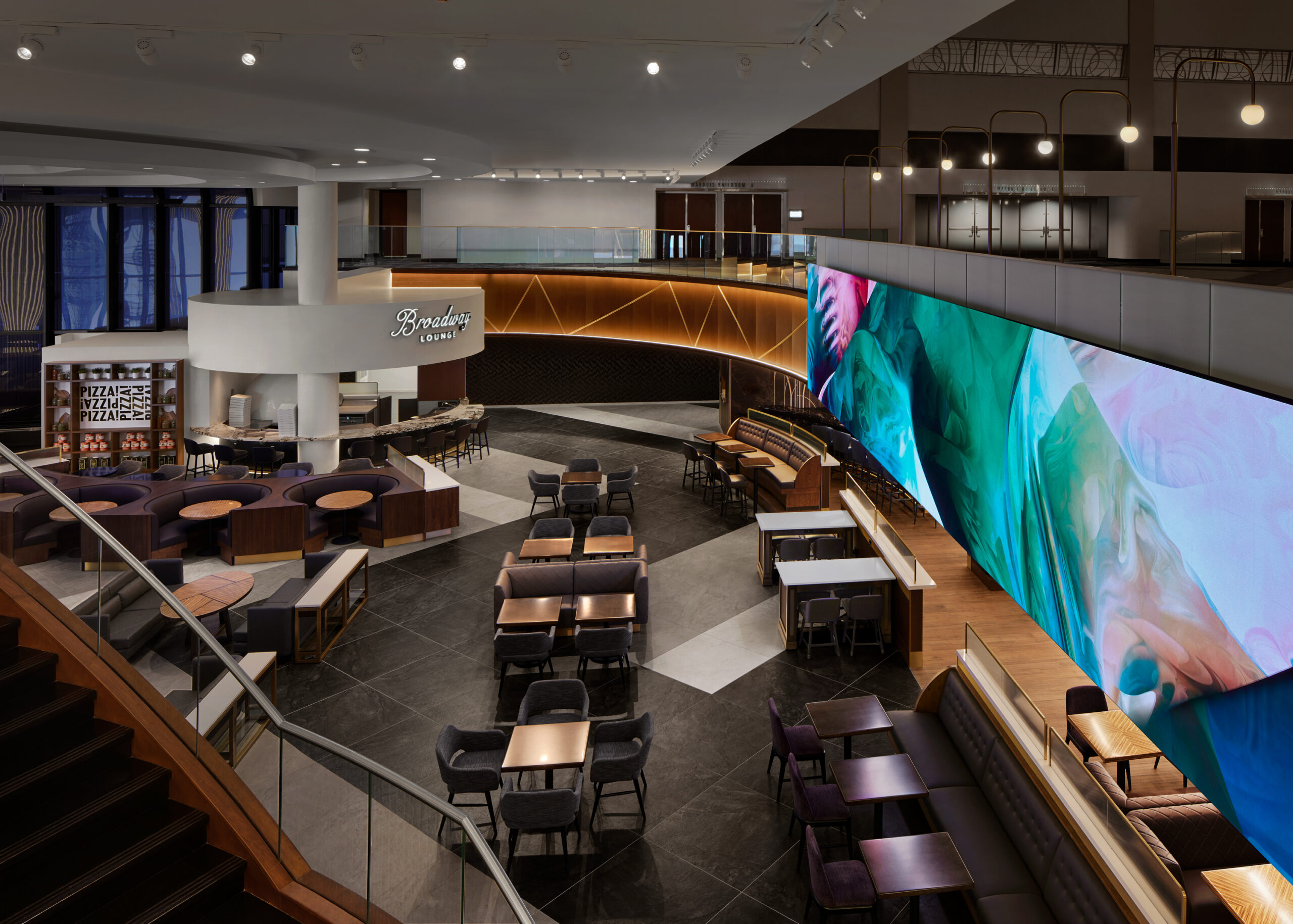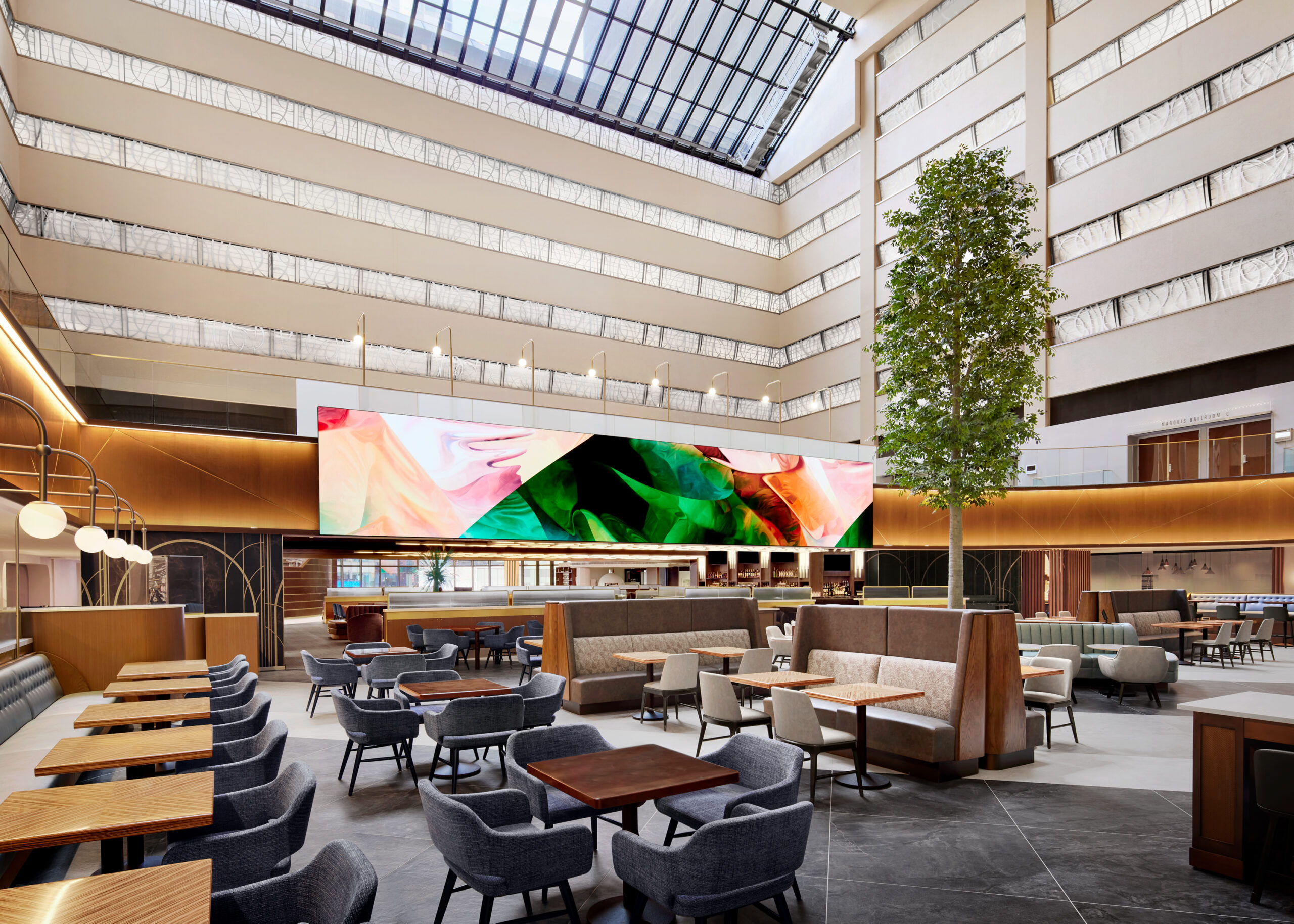 For the renovation of the Marriott Marquis public spaces, Stonehill Taylor did a complete overhaul of the 8thFloorlobby and reception, lounge areas, food & beverage spaces, and over 110,000 SF of meeting and event spaces. The firm was challenged to create spaces that simultaneously feed off the energy of the hotel’s outdoor surroundings, while providing a sanctuary away from the hustle and bustle of the city streets below. Drawing from the full 360 degrees of billboard light seen in nearby Times Square, the hotel interiors act as a “Kaleidoscope of Energy” with the reflections, flow of energy, and colors of Times Square balancing the elegant playfulness and interactive experiences.