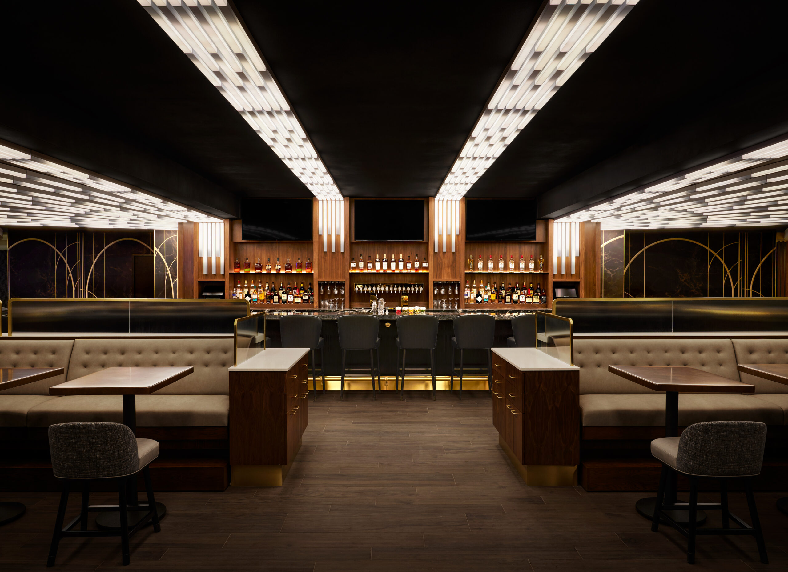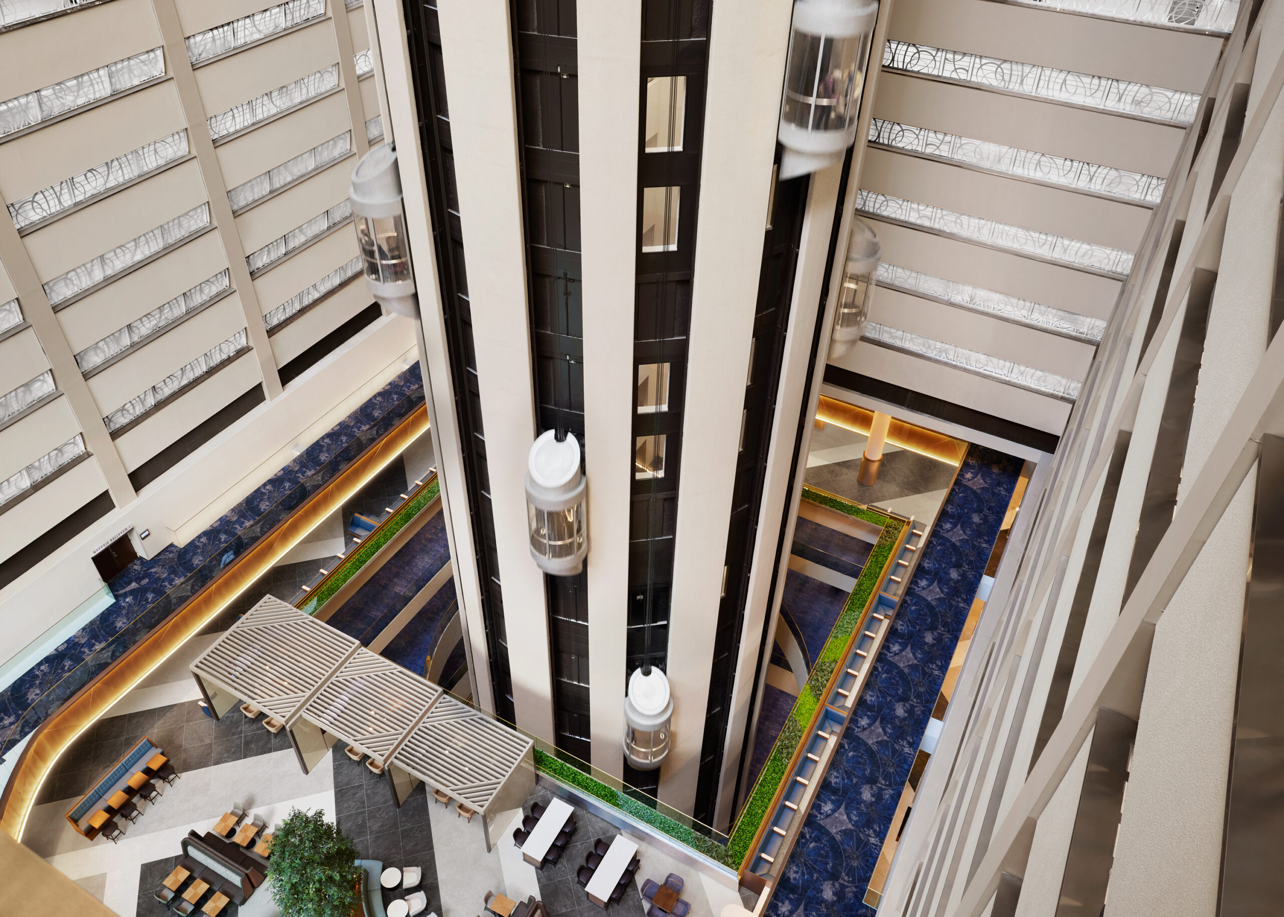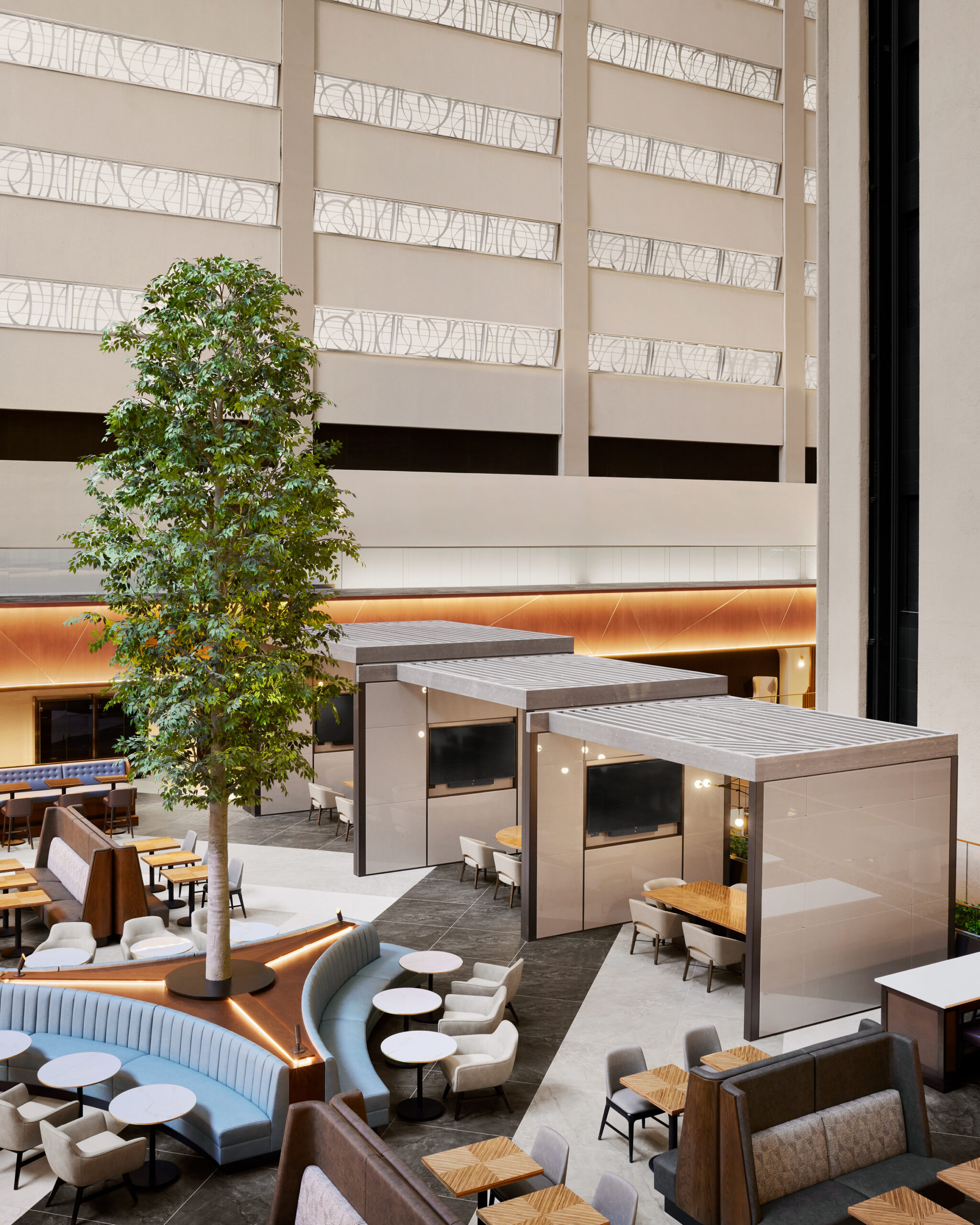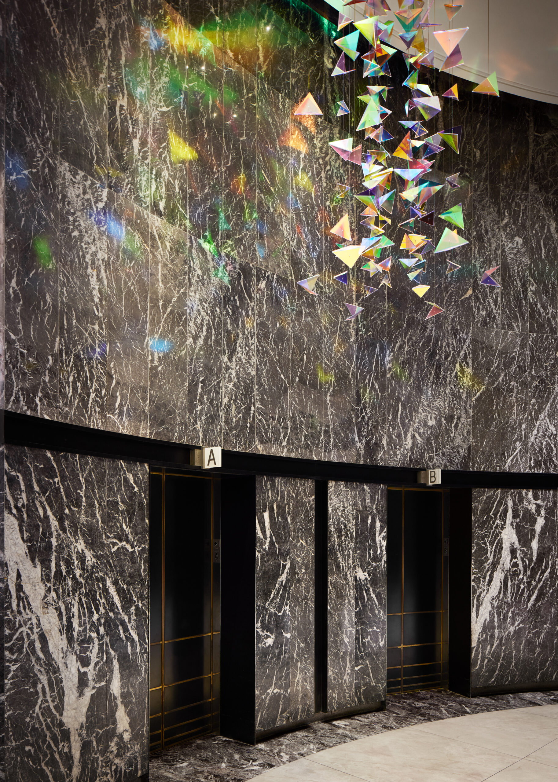 For the renovation of the Marriott Marquis public spaces, Stonehill Taylor did a complete overhaul of the 8thFloorlobby and reception, lounge areas, food & beverage spaces, and over 110,000 SF of meeting and event spaces. The firm was challenged to create spaces that simultaneously feed off the energy of the hotel’s outdoor surroundings, while providing a sanctuary away from the hustle and bustle of the city streets below. Drawing from the full 360 degrees of billboard light seen in nearby Times Square, the hotel interiors act as a “Kaleidoscope of Energy” with the reflections, flow of energy, and colors of Times Square balancing the elegant playfulness and interactive experiences.