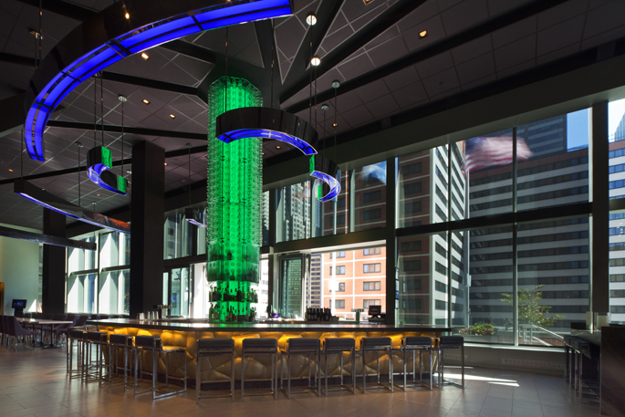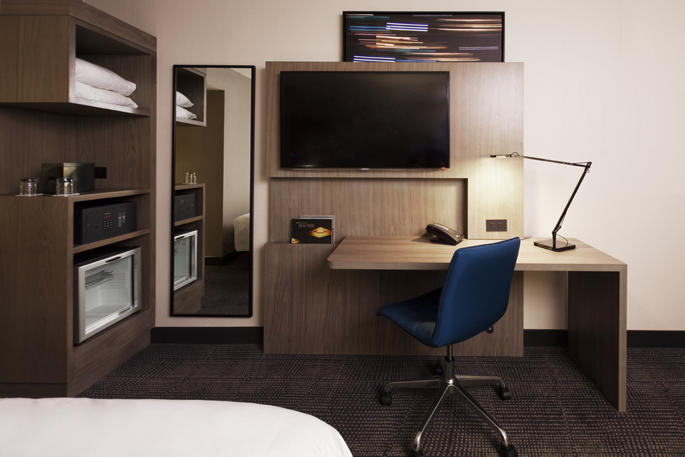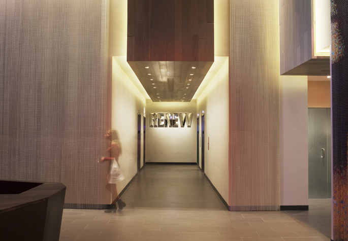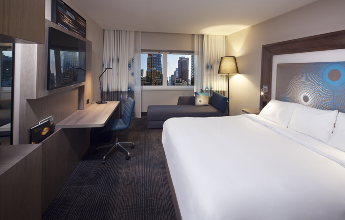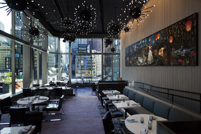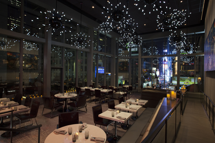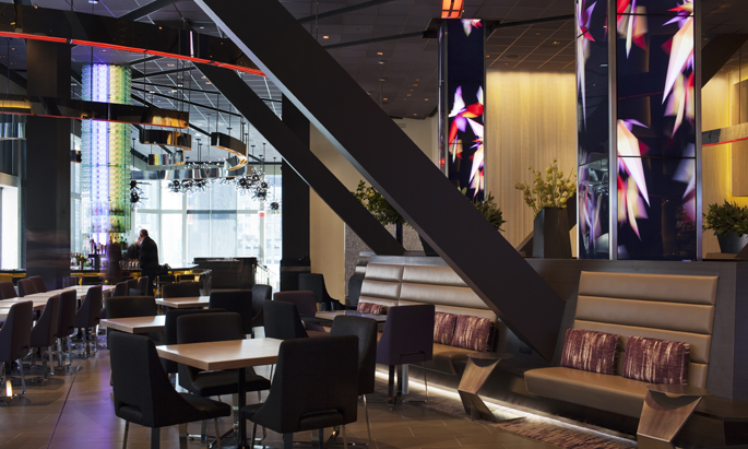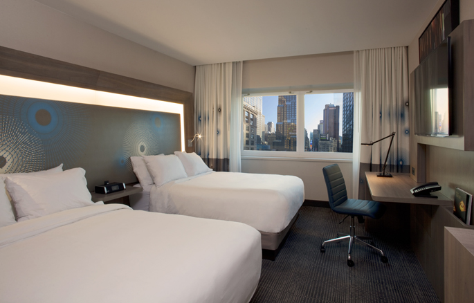 The street-level arrival area has a transitional enveloping atmosphere with a LED wall and ceiling installation, reminiscent of the Times Square ball drop. The seventh-floor lobby continues this concept with lines and facets inspired by a shattered Times Square ball, while the restaurant features large-scale art pieces depicting scenes of new beginnings and firework-inspired lights adorning the ceiling. All 480 rooms were renovated to meet the needs of both business travelers and tourists with increased circulation space, additional storage, and upgraded FF&E.