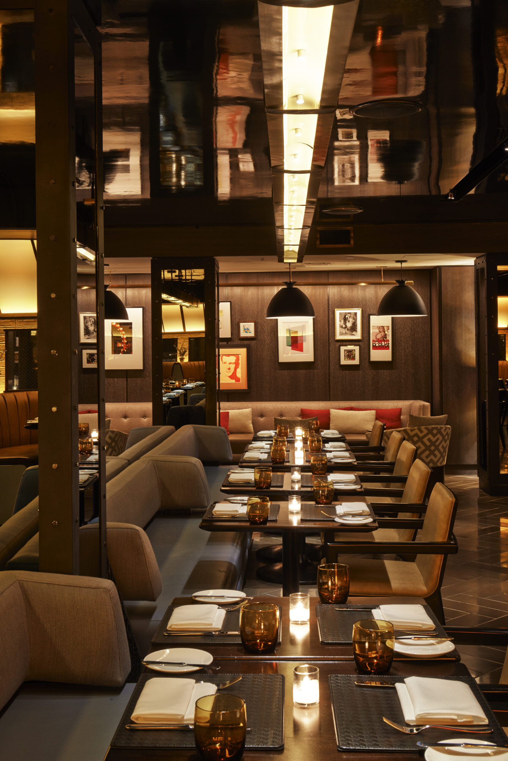 Located in the heart of New York’s theater district, the renovation of the Paramount Hotel included a refresh of the Paramount Bar & Grill to bring the landmark to its original glamour. The 20-seatfull-service bar, visible from the lobby, draws guests into the modern 2,500 SF space. Inspired by the locale, dramatic lighting, a vibrant backlight skylight, and high-gloss ceiling bring the restaurant to life. Pops of the signature Corso red are seen throughout, along with marble counters, and an eclectic mix of art.