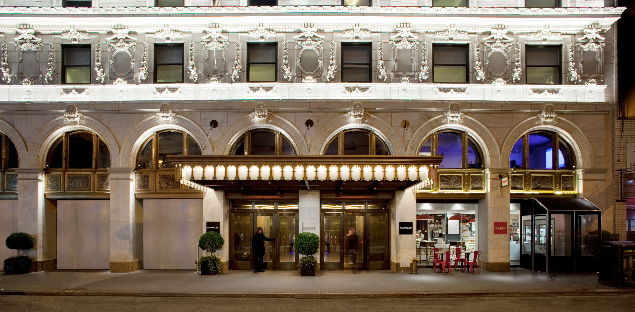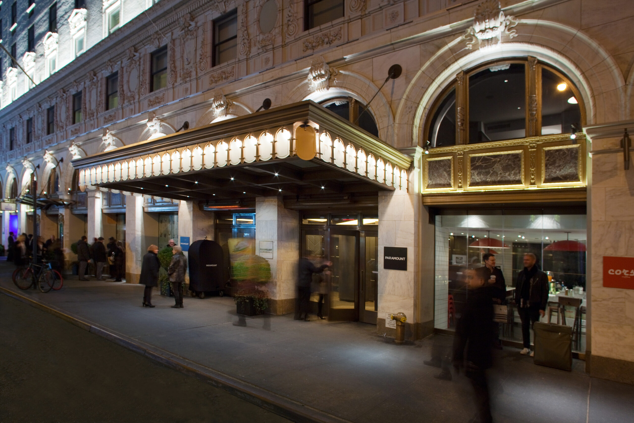 Stonehill Taylor led the revival of the historic Paramount Hotel with a renovation of the public spaces, restaurant, and facade. The new lobby’s grand space was refocused to facilitate a diversity of interactions with a mixed arrangement of seating areas and comfortable zones. To strengthen the landmark’s exterior presence, the designers drew inspiration from the property’s original architect, Thomas Lamb. Ornate marquees that were once the key exterior features are brought back with a fresh take, standing in contrast to the clean and minimal look of most of the storefront.