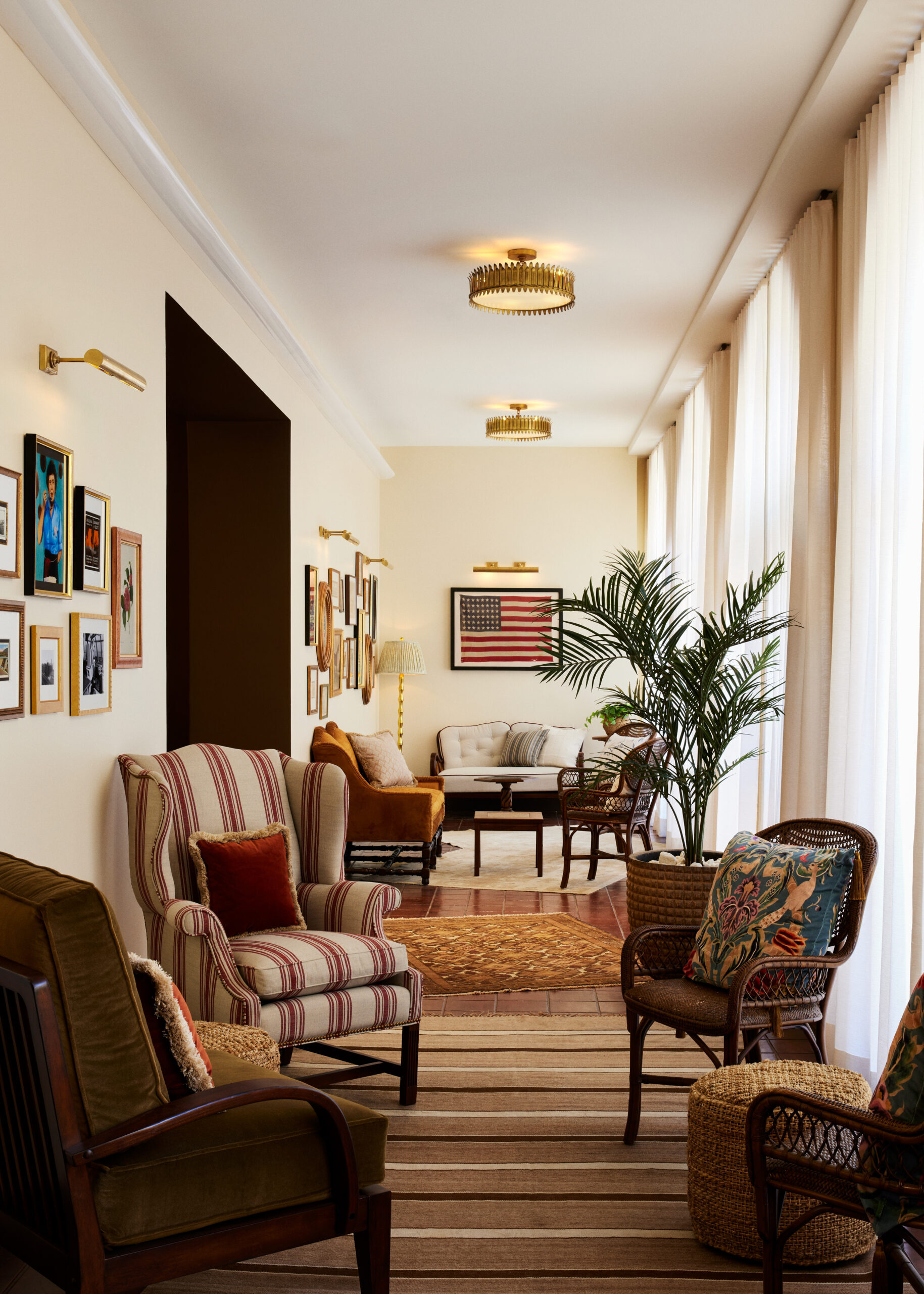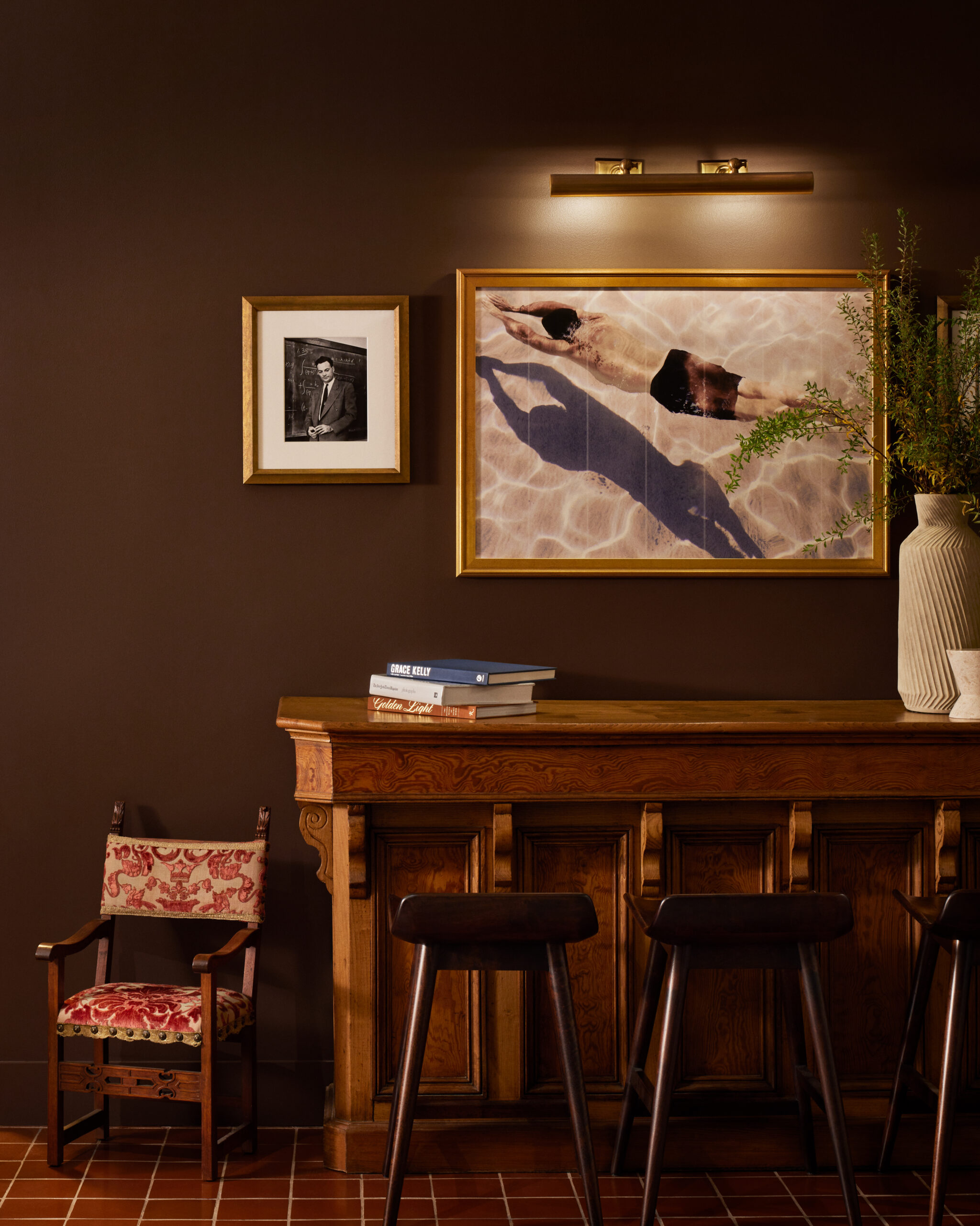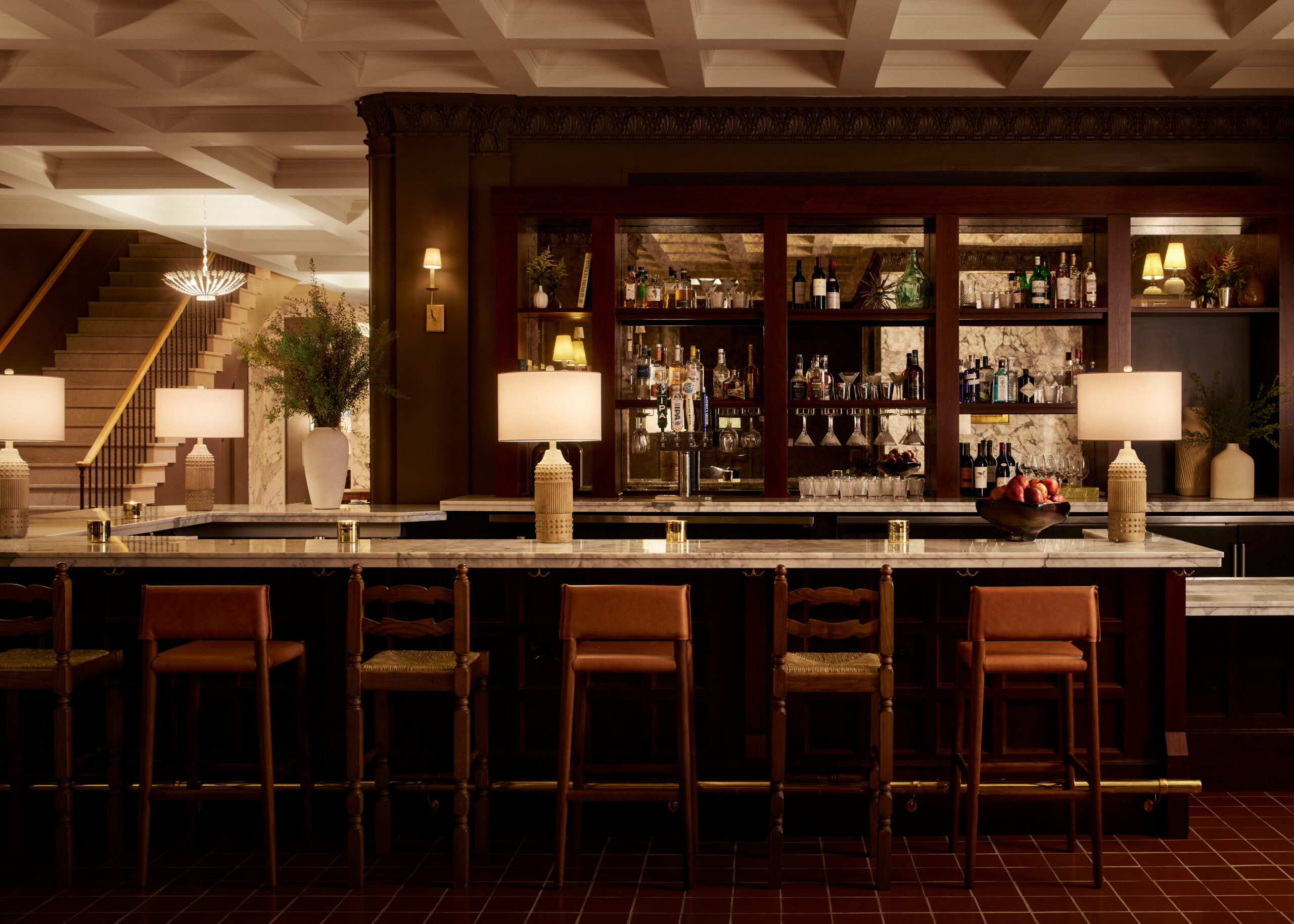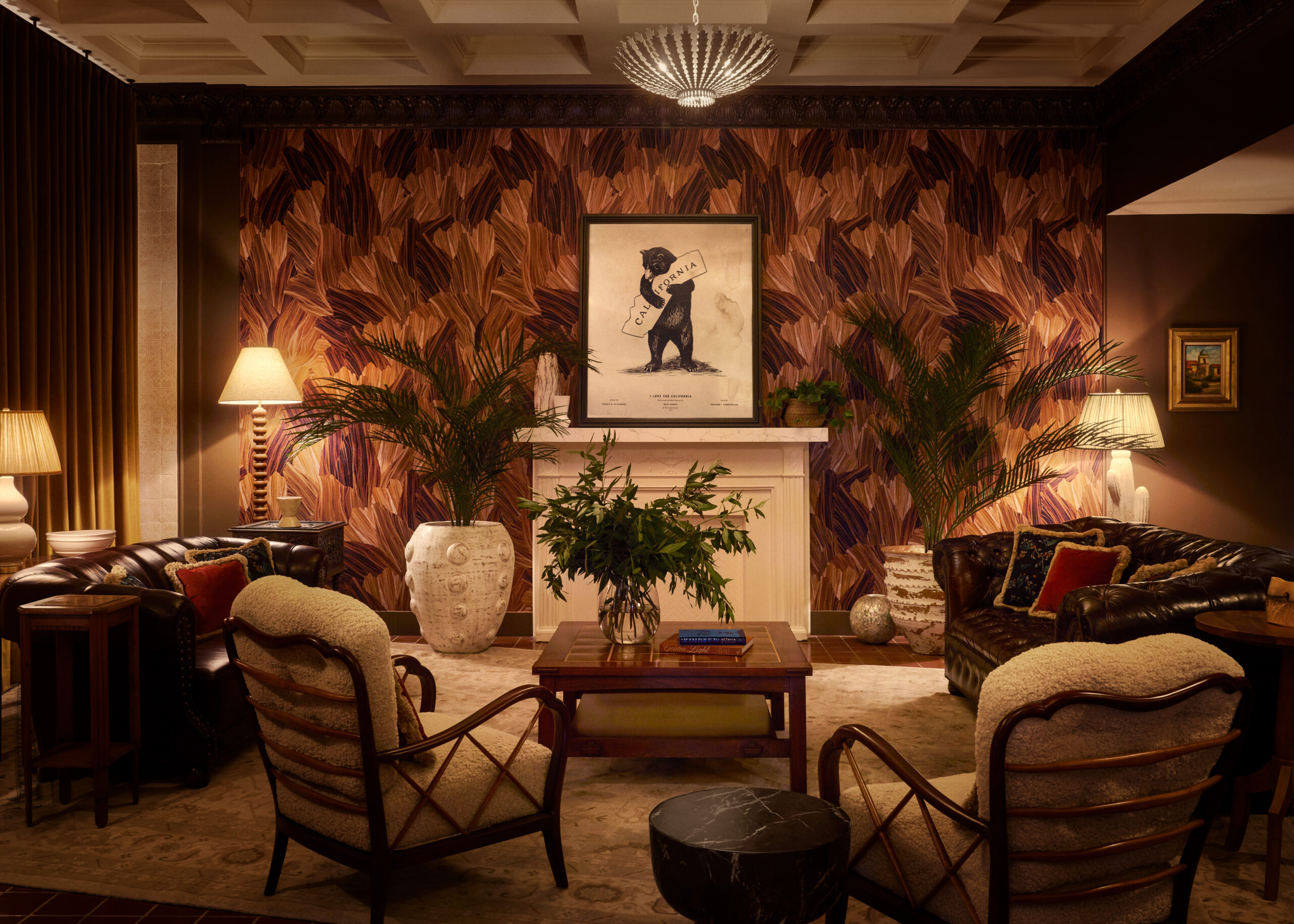 Stonehill Taylor transformed the lobby to a modern and comfortable space with Spanish colonial influences paired with collected furnishings. The walls have been repainted from an off-white to a moody chocolate brown color. Warm finishes make the space feel inviting. Infills of patterned terracotta tiles were added to embellish the property’s original historic flooring. Terracotta and neutral tones stand out against the darker warmer hues, creating a striking color contrast. Mirrored panels were replaced with a tile that has a Spanish motif for a dramatic layering impact. The design team placed a wallcovering behind the fireplace and in the phone booths to create a striking, mural-like effect. Collections of artworks, and some sourced pieces, are displayed throughout the interiors framed in gold to add another layer of contrast to the dark walls.