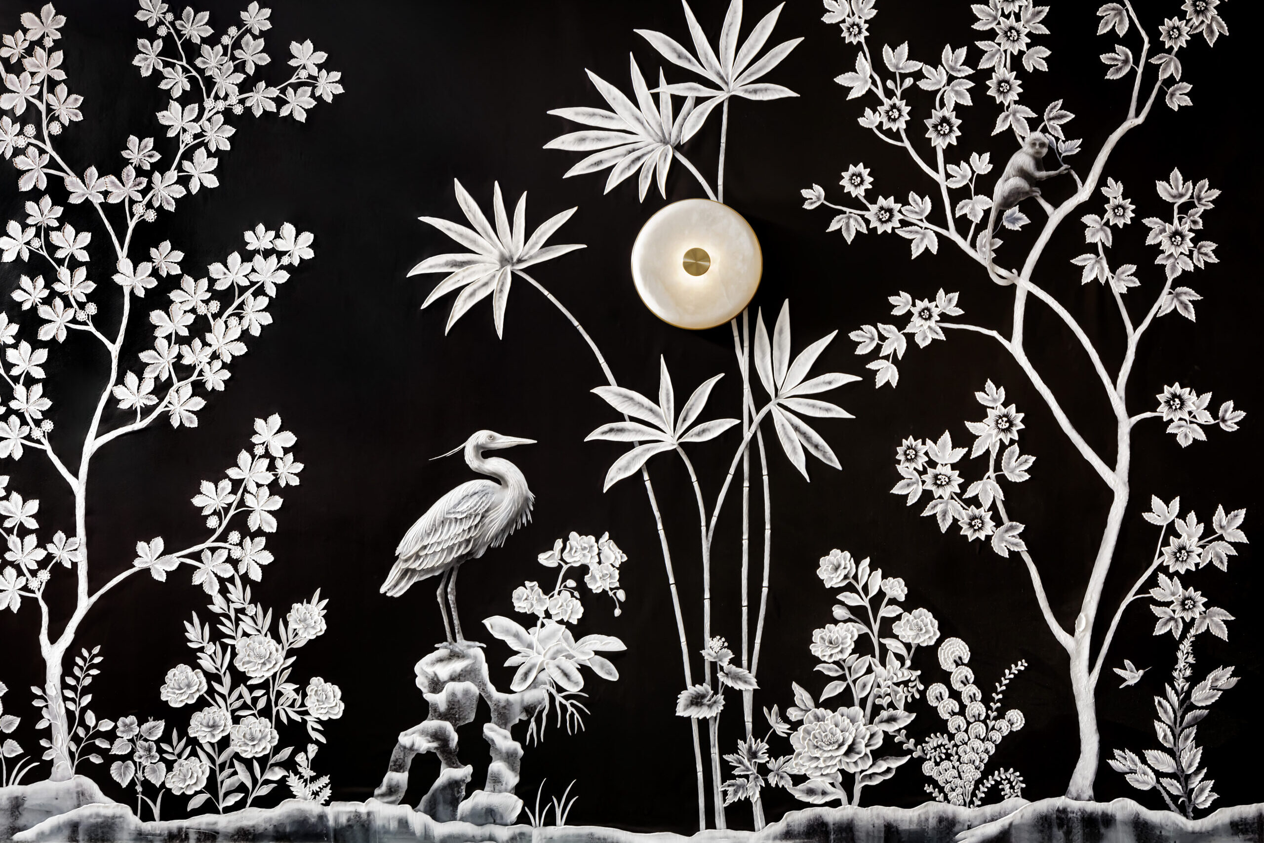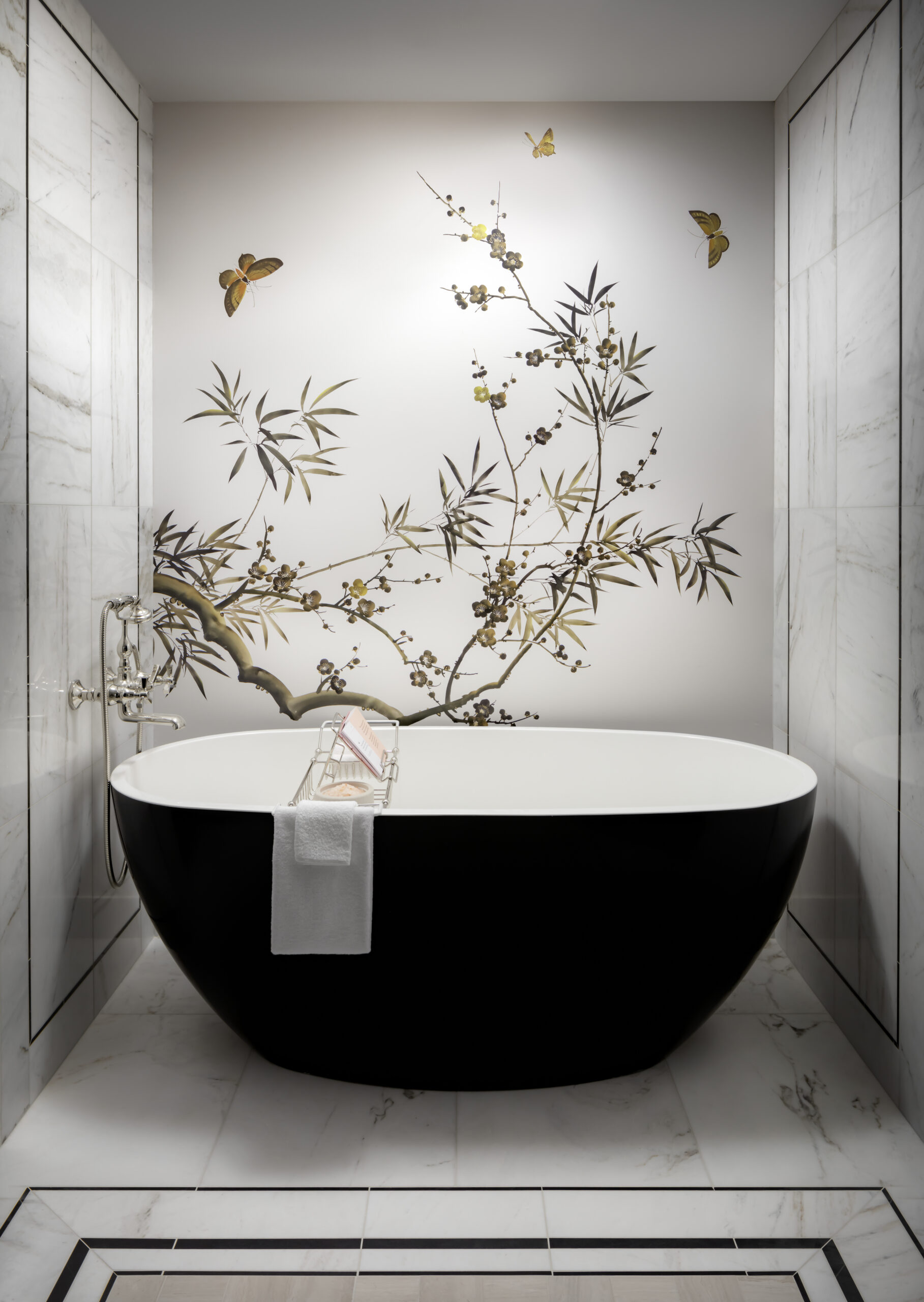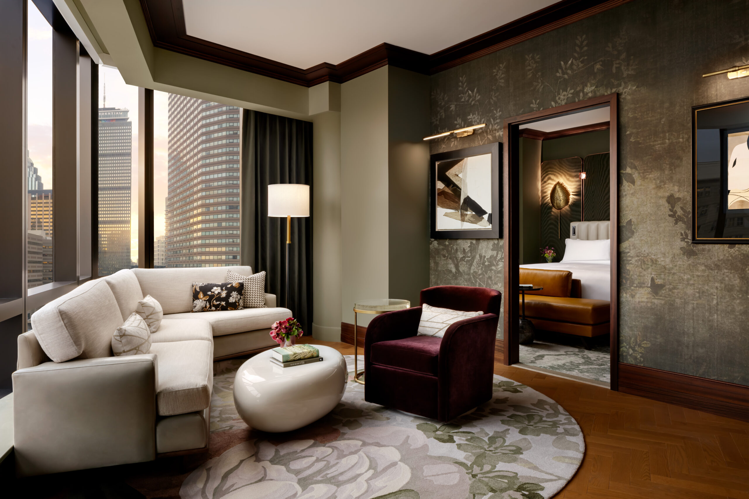 One of the property highlights is the grand spiral staircase that ascends the three floors of the Sky Lobby through an atrium of iron and glass windows. Another standout is the speakeasy, inspired by Boston’s Emerald Necklace, that radiates a botanical appeal with custom floral wallcoverings, forty-foot-tall oak wood columns and deep green details.