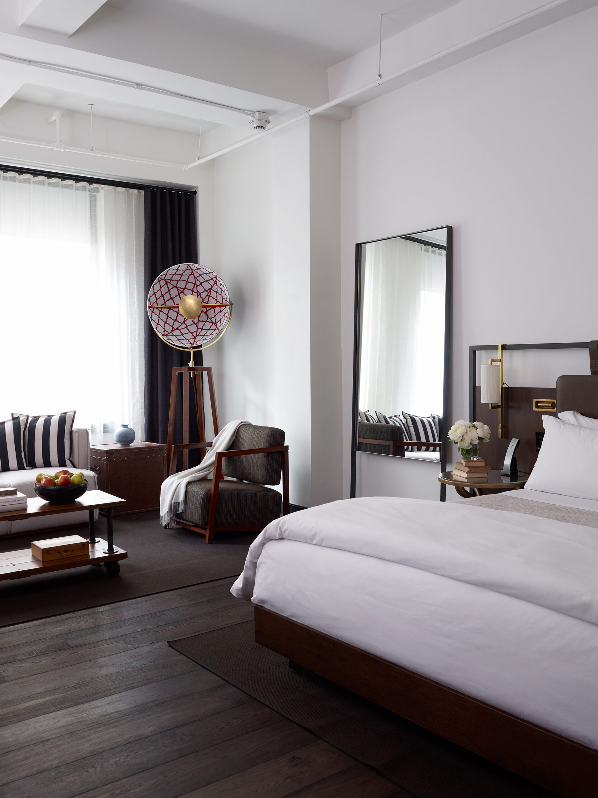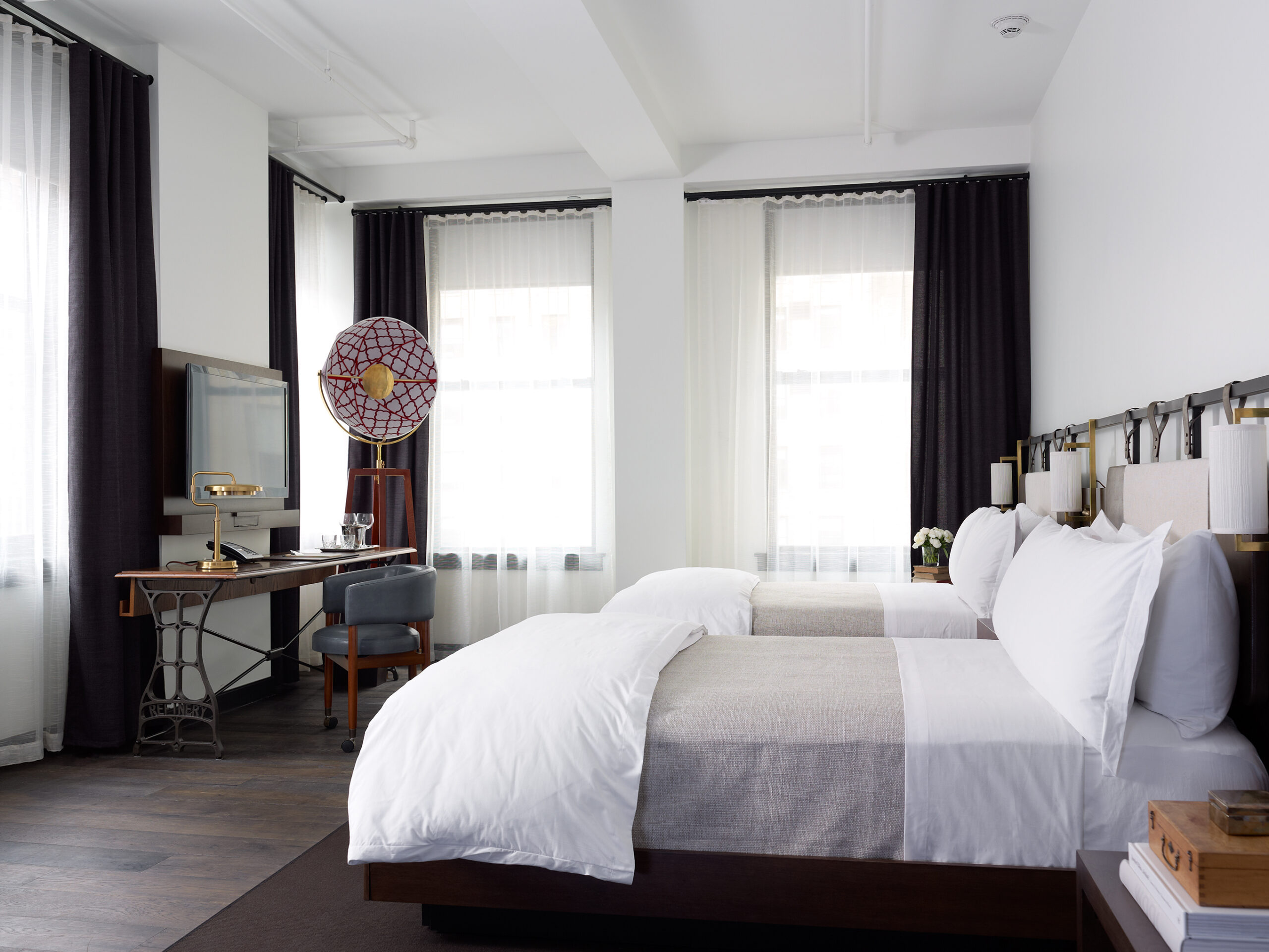 Originally built in 1912, The Refinery Hotel is a creative reiteration of the building’s previous tenants–high end retail, a tea salon, and various factories (primarily hat making). This duality is reflected in the refined public spaces in the lobby area and a more industrial and raw elegance in the guestrooms and rooftop bar. The new design reinterprets the neo-gothic details with features such as the lobby’s manufactured white plaster groin vaulted ceilings and the warm wood used throughout the bar, Winnie’s Tea Lounge, and the reception area. The guestrooms emanate the original hat-making factories with the use of concrete ceilings, distressed hardwood floors, sewing machine inspired desks, and other factory inspired FF&E.