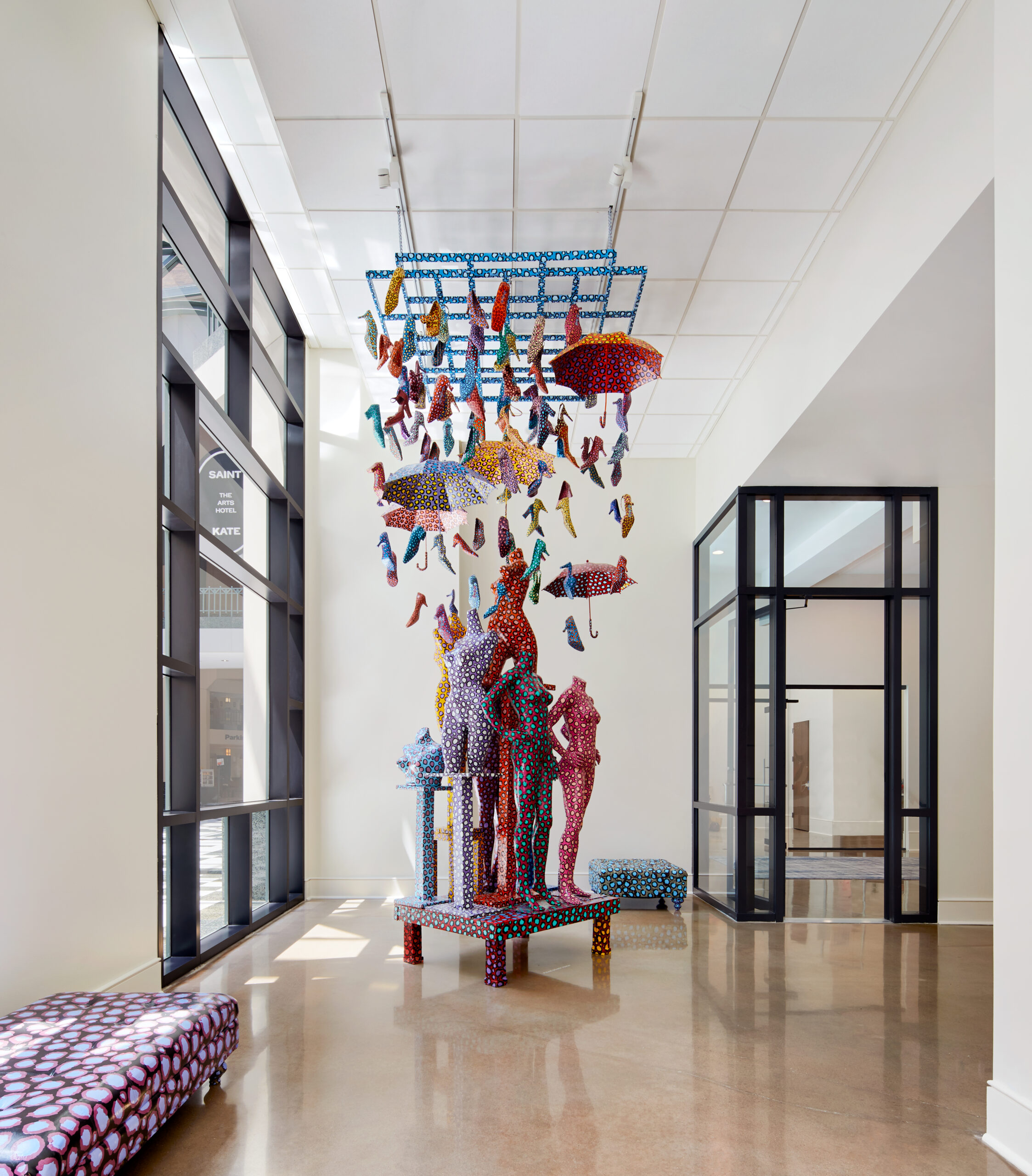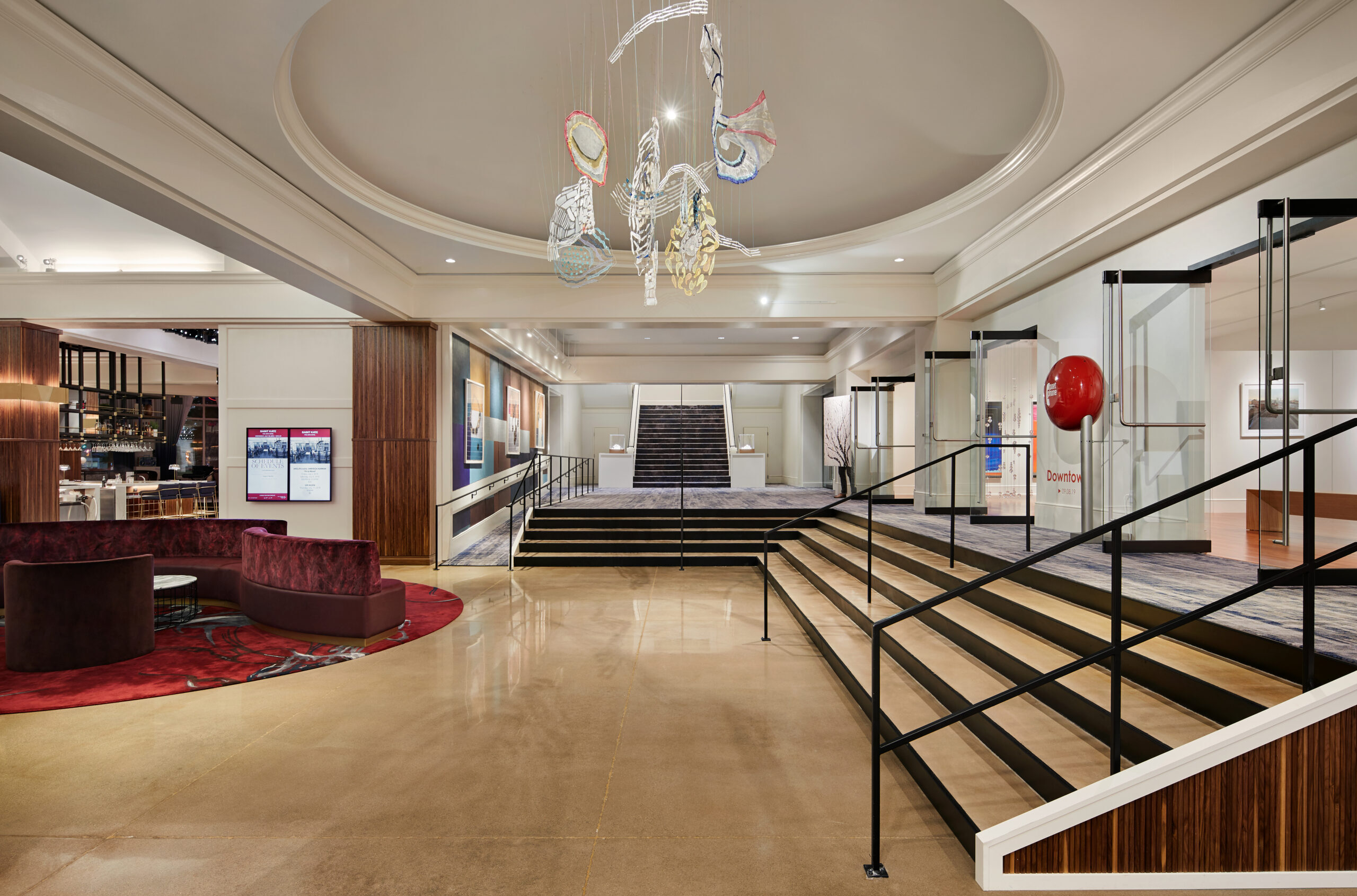 The hotel program includes a reception lobby which features world-class modern art installations, standing exhibitions, and live performances, ground floor bar, three new public art galleries, expansive guestrooms, and five immersive artist suites (designed in collaboration with various local artists, each of which represent multiple mediums and styles). Additionally, Saint Kate is host to an extensive food & beverage experience, which includes the Aria Cafe & Bar, the hotel’s three meal restaurant, Giggly Champagne & Wine Bar, Milwaukee’s only champagne bar, and The Dark Room, a more intimate, speakeasy inspired dining space.