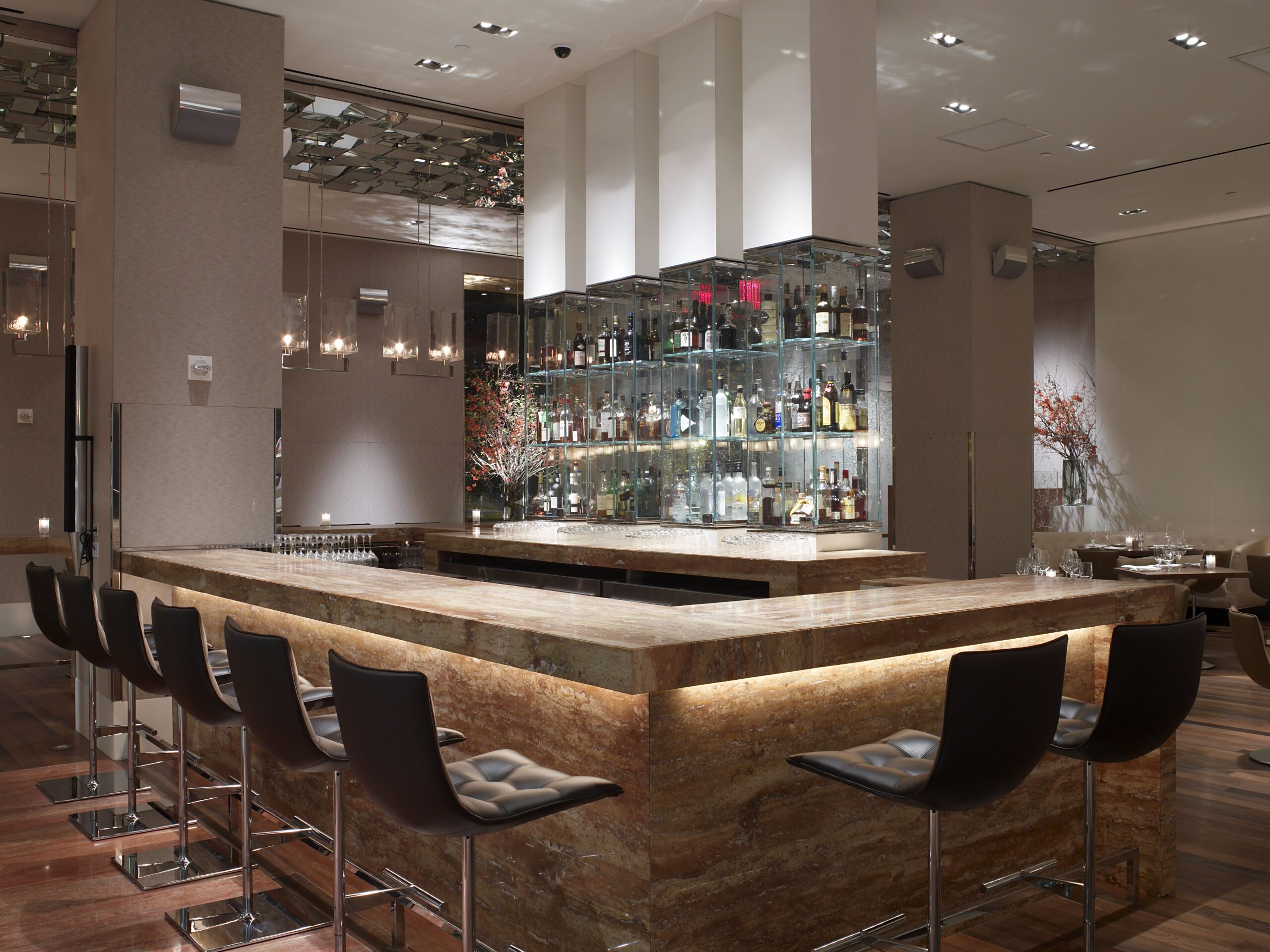 As part of the extensive renovation and repositioning of the JW Marriott Essex House (formerly the Jumeirah Essex House), Stonehill Taylor collaborated with restaurant designer Tonychi Studios on the Southgate Restaurant & Bar. The restaurant was completely reconfigured to house two separate but connected spaces: a main dining area and a patisserie. Following the length of the main dining room, an astounding glass wine creates an impactful look. Stonehill Taylor also created a separate and distinct entrance for the restaurant from Central Park South.