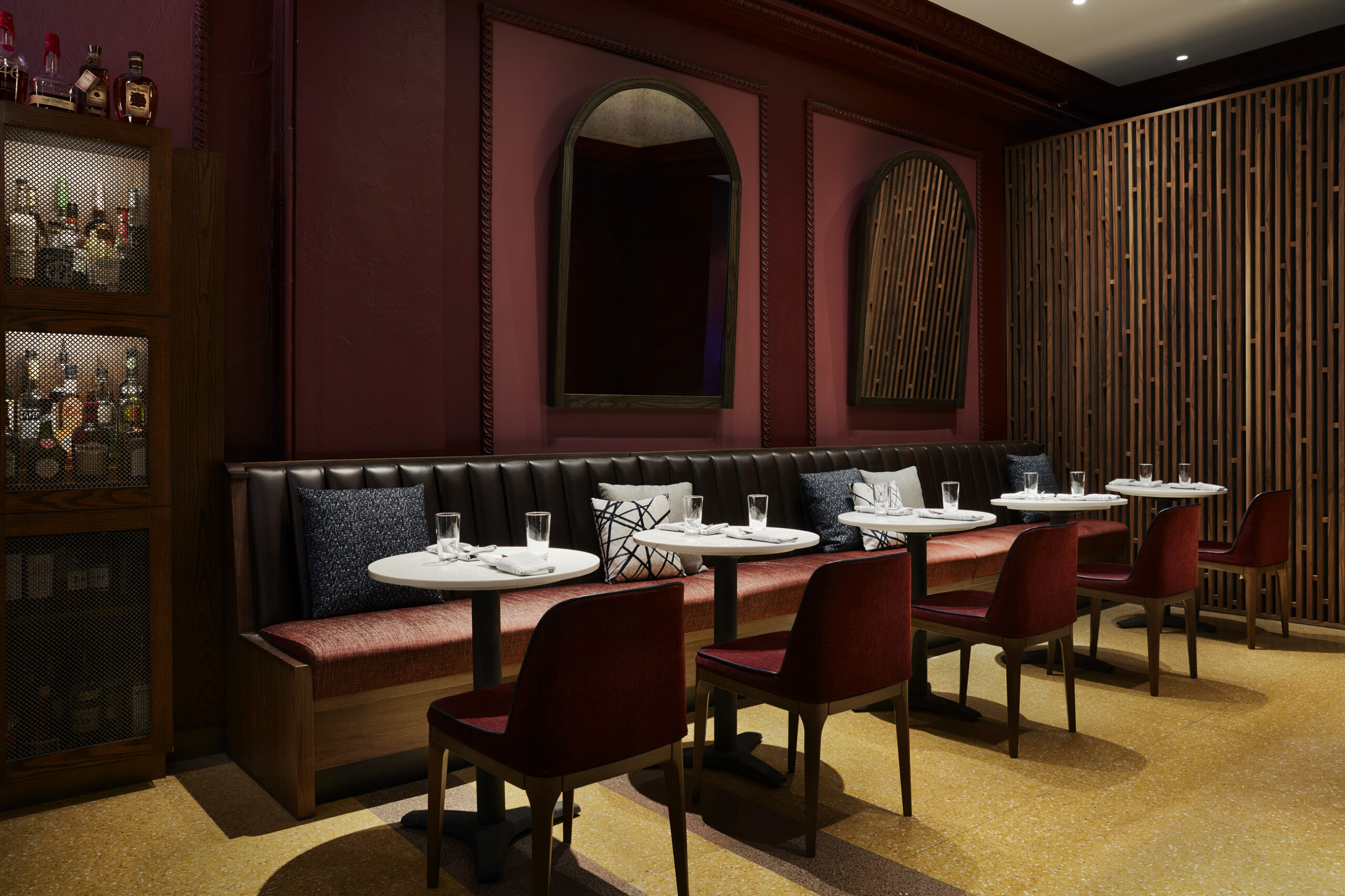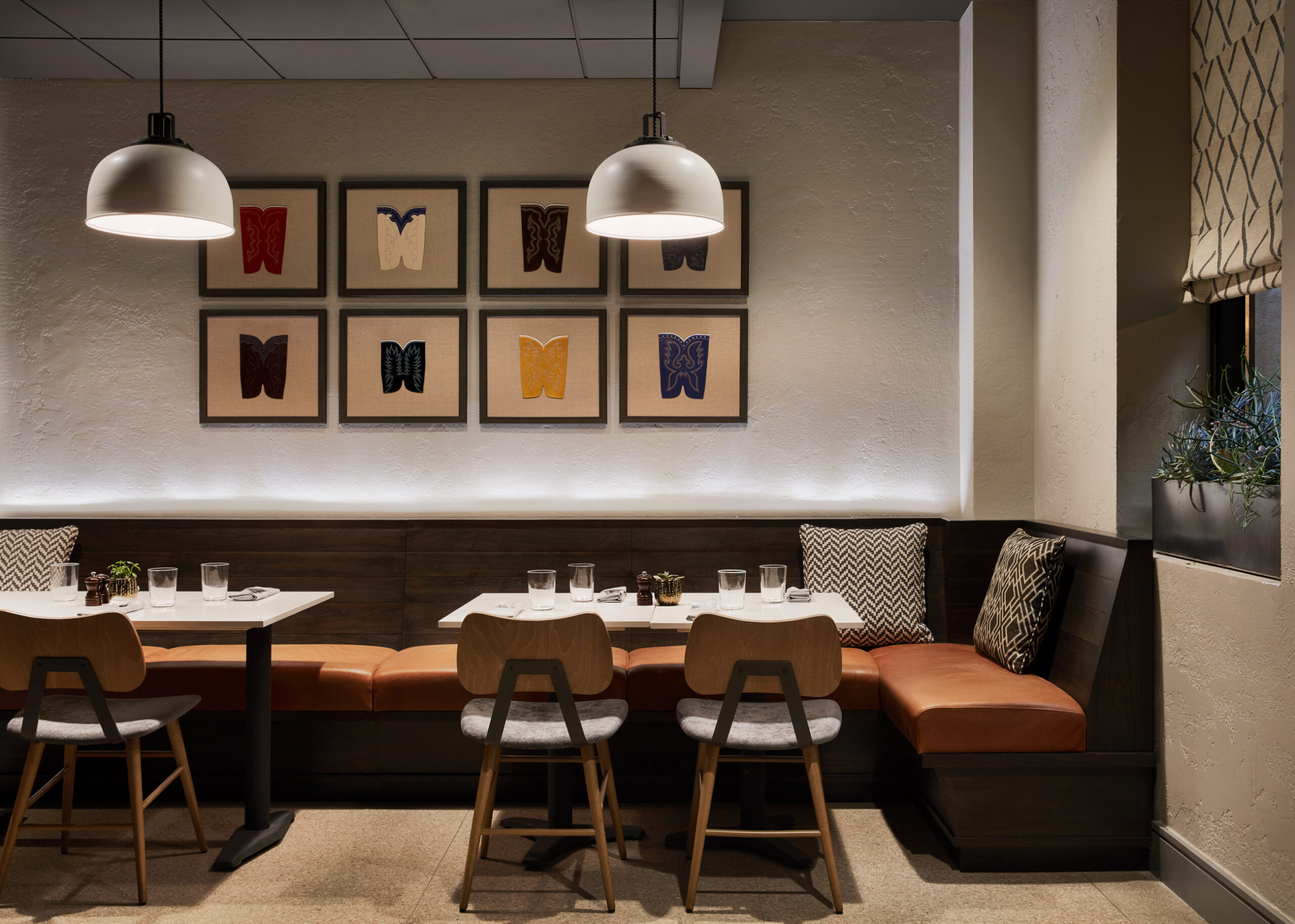 For the Holston House hotel, Stonehill Taylor designed a multi-level dining experience inspired by the building’s historic elements with layered details informed by Nashville’s famous music industry and famed leather artisanal goods. Overlooking the lobby is Bar Tenn, where a performance area is surrounded by built-in and information seating for guests to enjoy live music. Drapery panels, antique mirrors, and the restored rosette-coffered ceiling and molding accents create a mysterious speakeasy-like setting. A local found, vintage piano stands as the bar’s focal point, repurposed as a drink railing. The hotel’s three-meal restaurant, Tenn, has a casual atmosphere with a dark finished ceiling, dome ceiling pendants, and comfortable brown leather banquettes. Among the hotel’s most striking features is its rooftop bar, Tenn on Top, complete with a 3,650-square-foot and is completed by a glass railing framing the southern and eastern ends of the deck, offering spectacular unobstructed views.