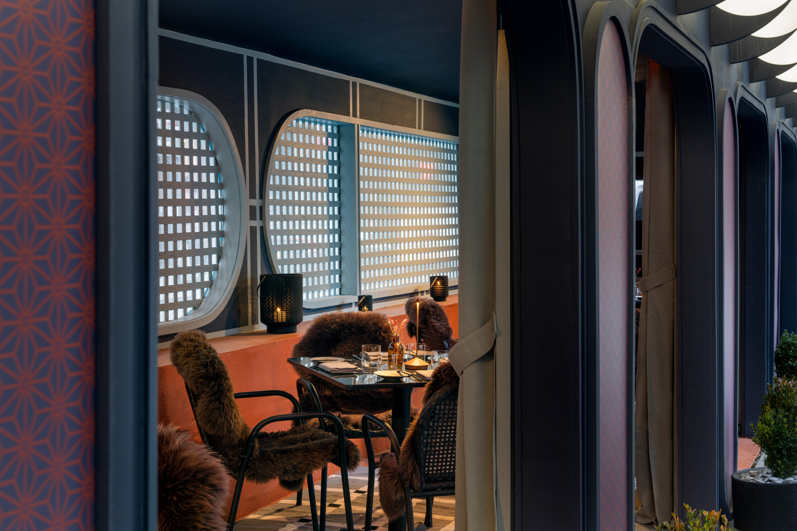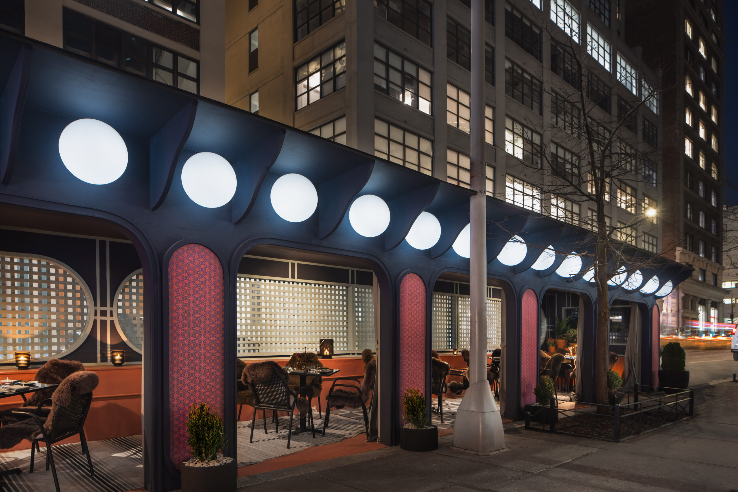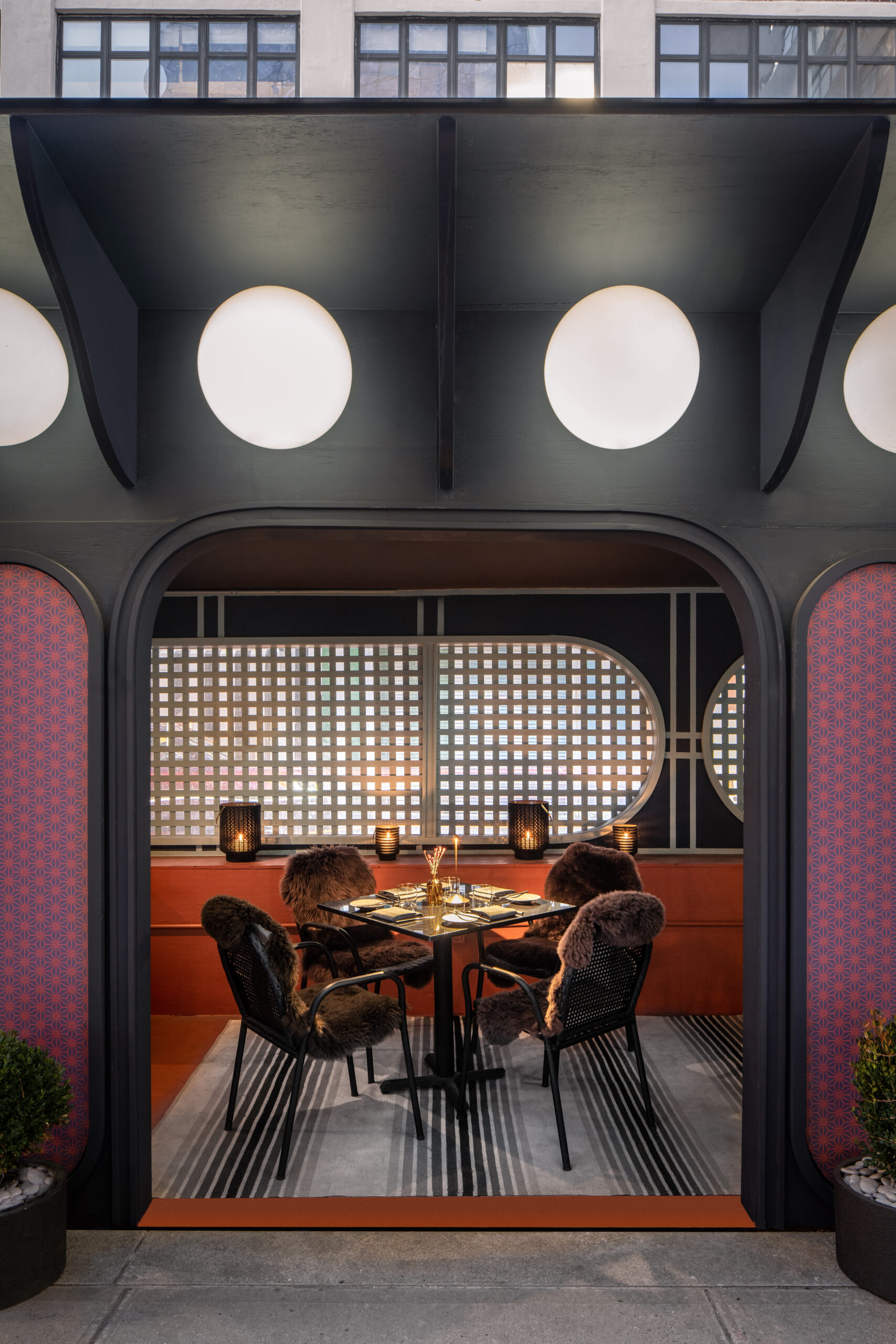 For the new exterior extension for the Vestry, a Michelin-star restaurant in the heart of SoHo, Stonehill Taylor designed an exterior space that visually and cohesively connects to the restaurant’s interior. In addition to continuing the blue and copper color scheme found at the interior bar, the design also incorporates Vestry’s Asian-inspired cuisine by showcasing the simple yet sophisticated elements of Asian designs into the kiosk. The bold graphic paint lines used throughout are reflective of patterns found within Japanese wood joinery and result in a striking display. A lighting installation on the front façade is inspired by illuminating hanging lanterns, featuring fixtures framed by curved fins that are a nod to the beauty of vernacular architecture in Eastern Asia. Equipped for all four seasons, the kiosk features materials to keep rain and snow out, and drapery to control the wind from coming into the outdoor space.