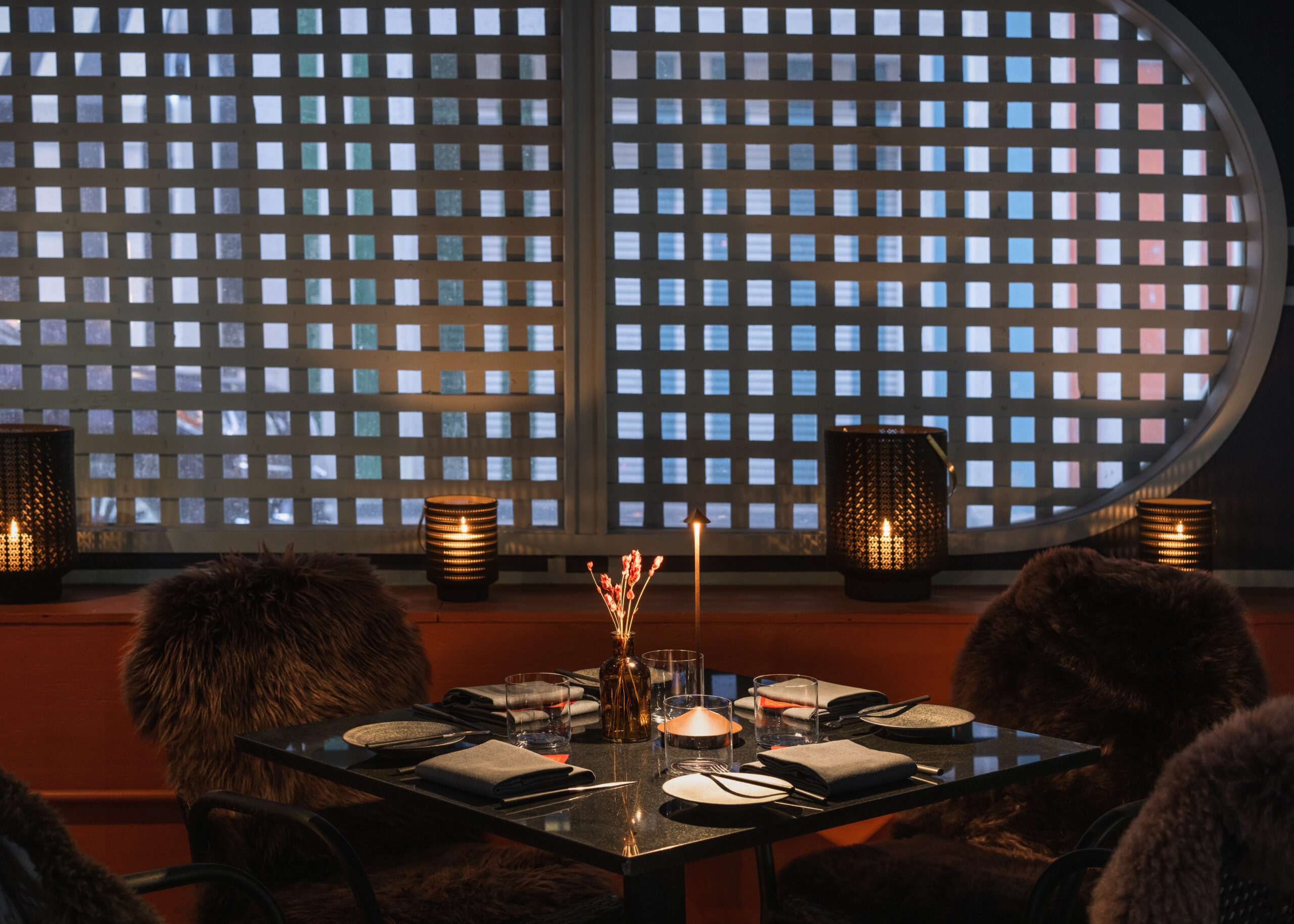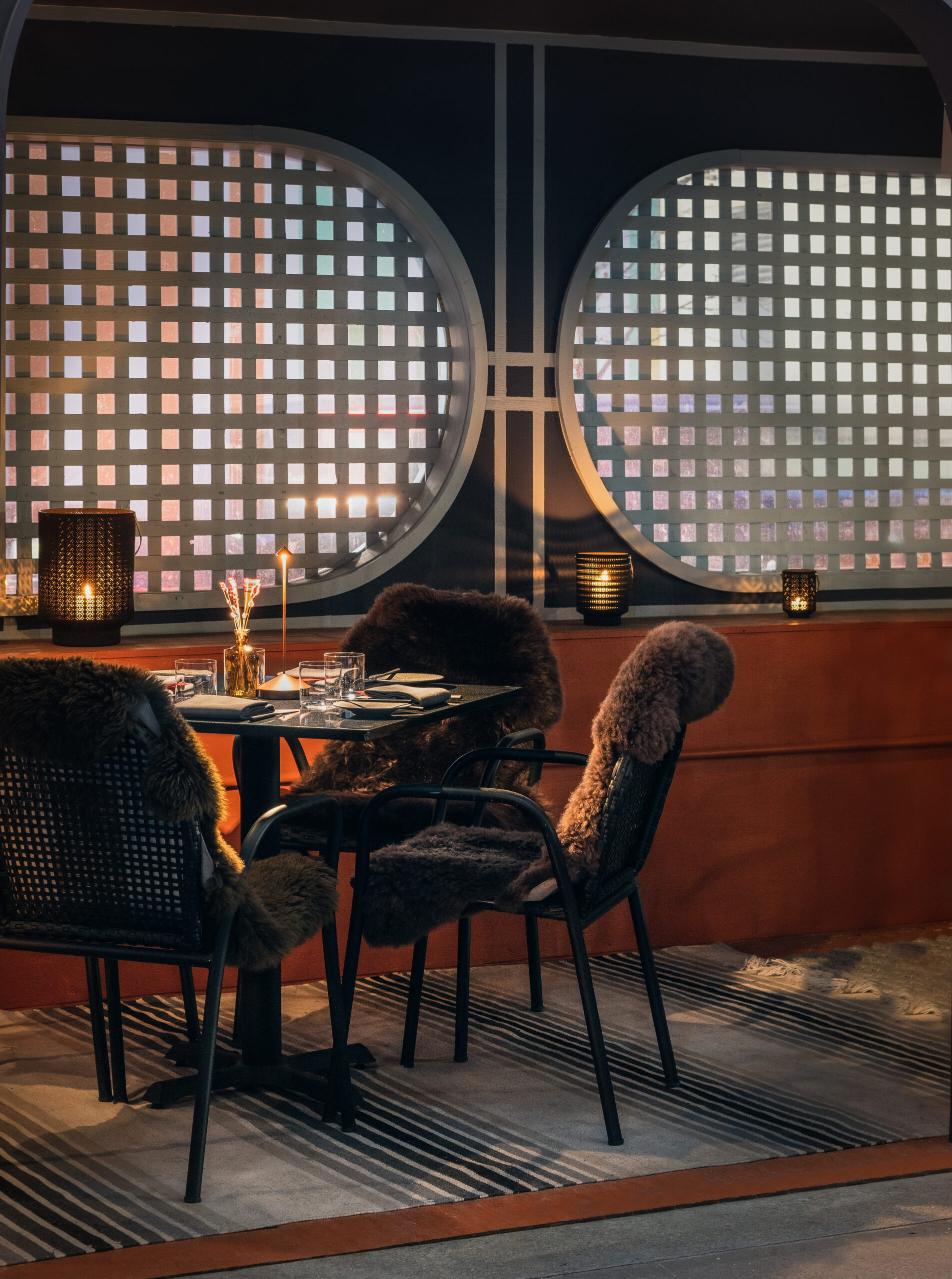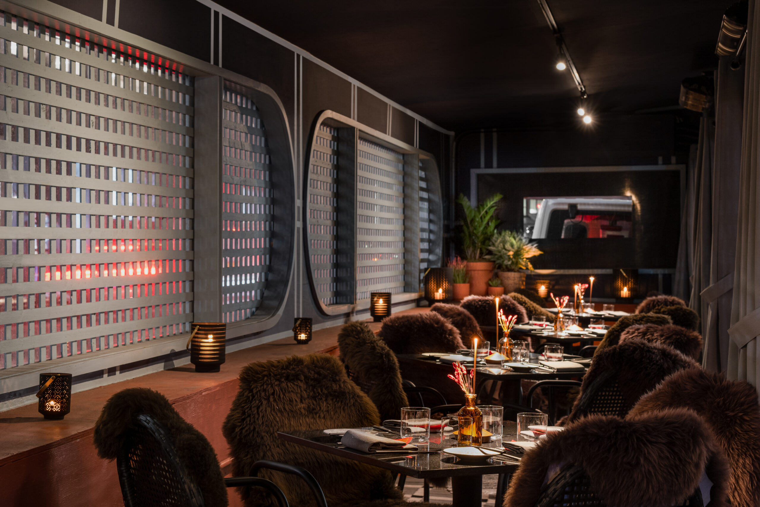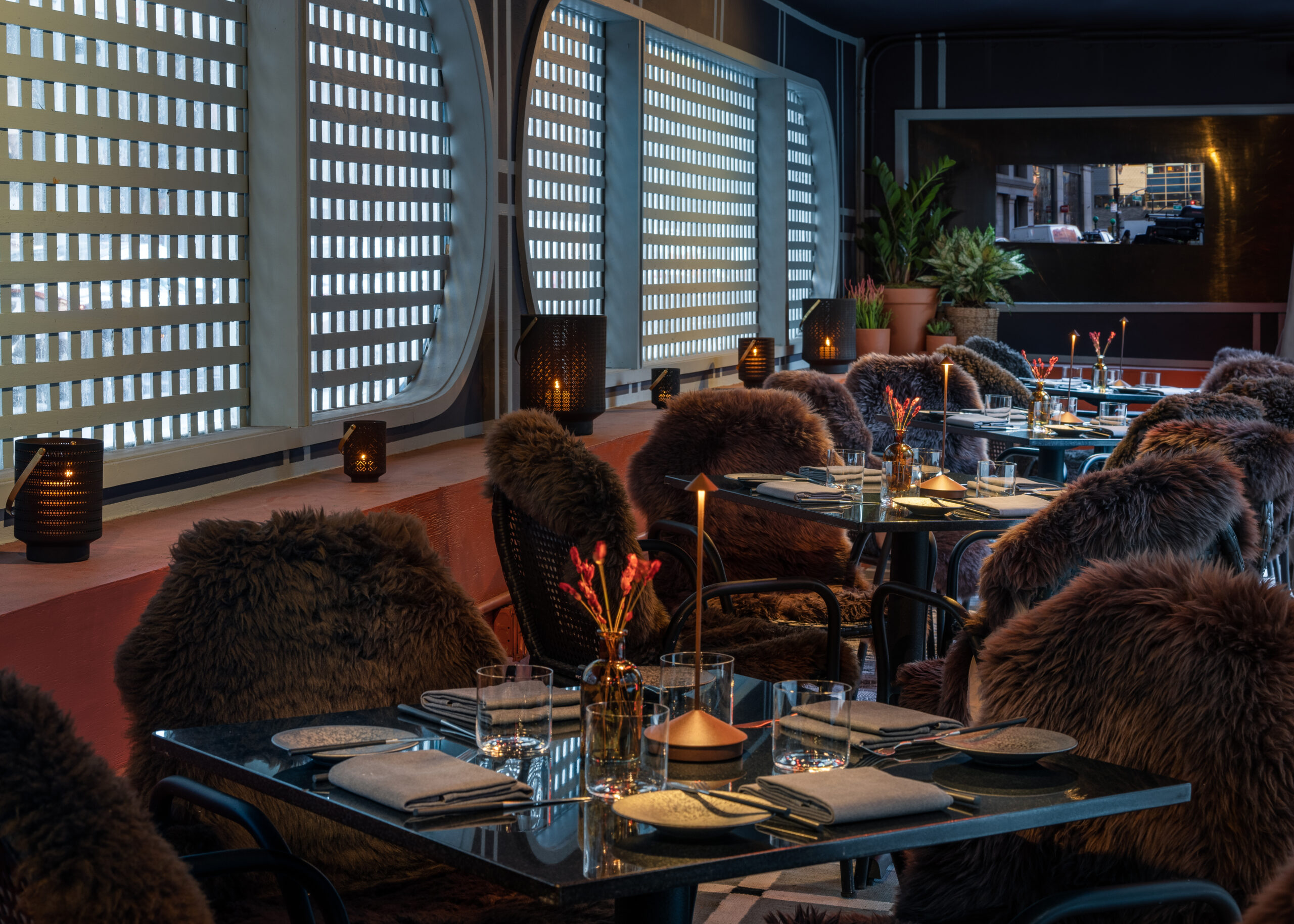 For the new exterior extension for the Vestry, a Michelin-star restaurant in the heart of SoHo, Stonehill Taylor designed an exterior space that visually and cohesively connects to the restaurant’s interior. In addition to continuing the blue and copper color scheme found at the interior bar, the design also incorporates Vestry’s Asian-inspired cuisine by showcasing the simple yet sophisticated elements of Asian designs into the kiosk. The bold graphic paint lines used throughout are reflective of patterns found within Japanese wood joinery and result in a striking display. A lighting installation on the front façade is inspired by illuminating hanging lanterns, featuring fixtures framed by curved fins that are a nod to the beauty of vernacular architecture in Eastern Asia. Equipped for all four seasons, the kiosk features materials to keep rain and snow out, and drapery to control the wind from coming into the outdoor space.